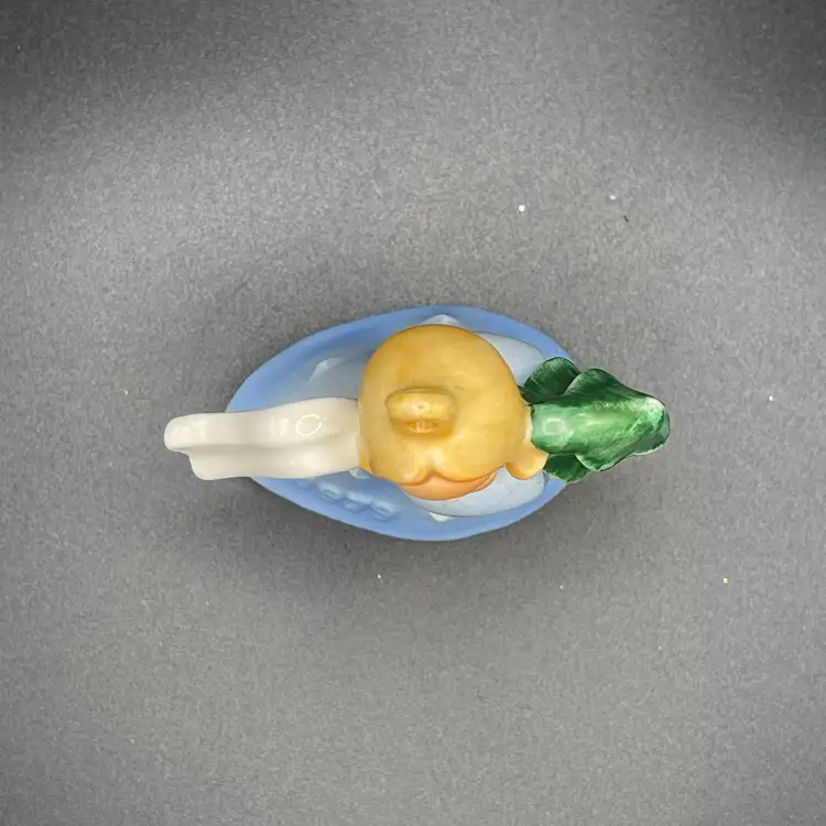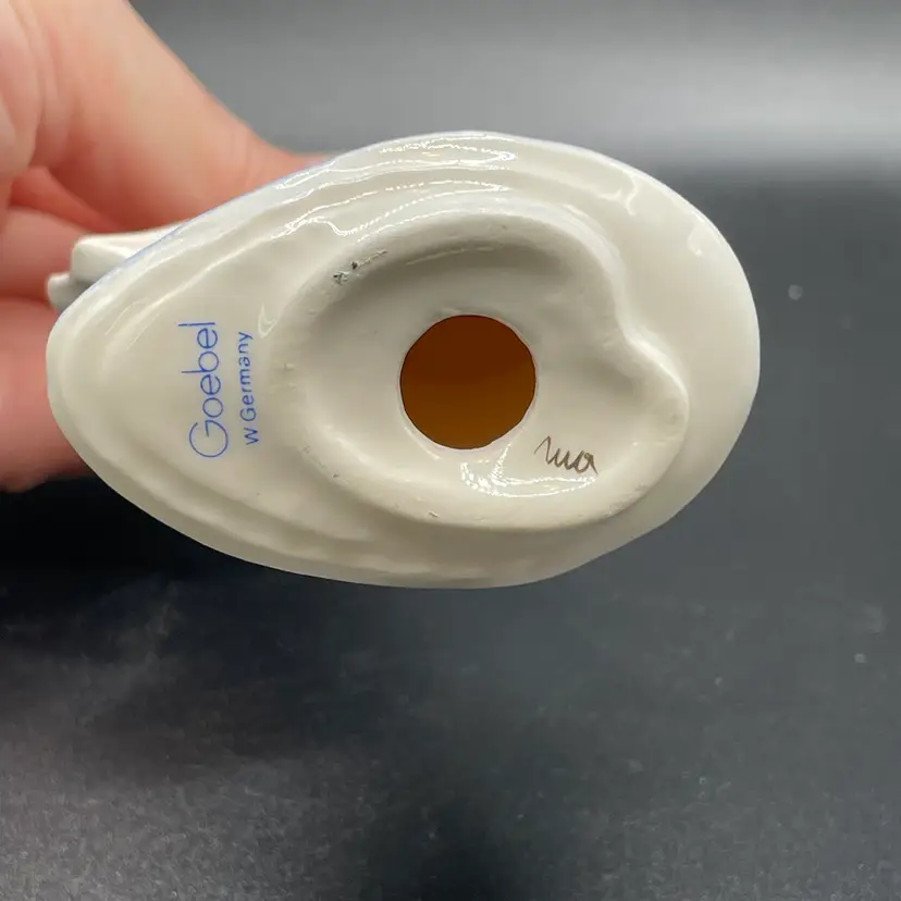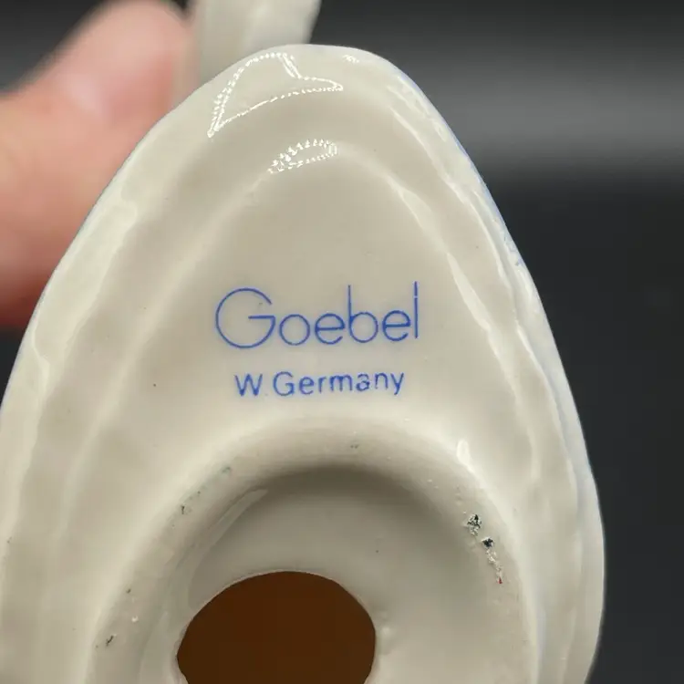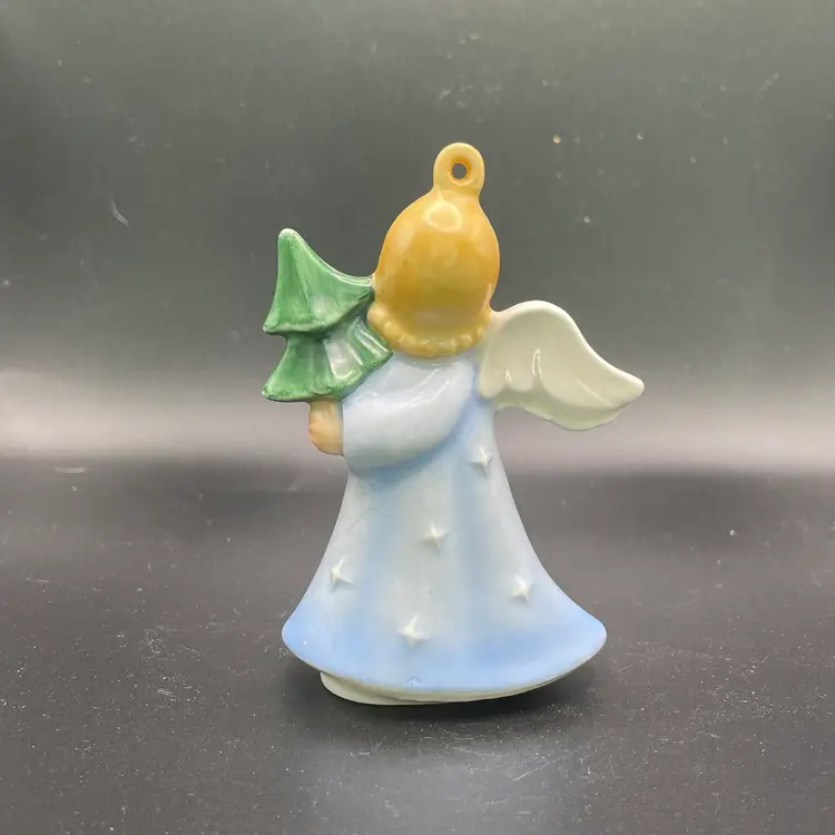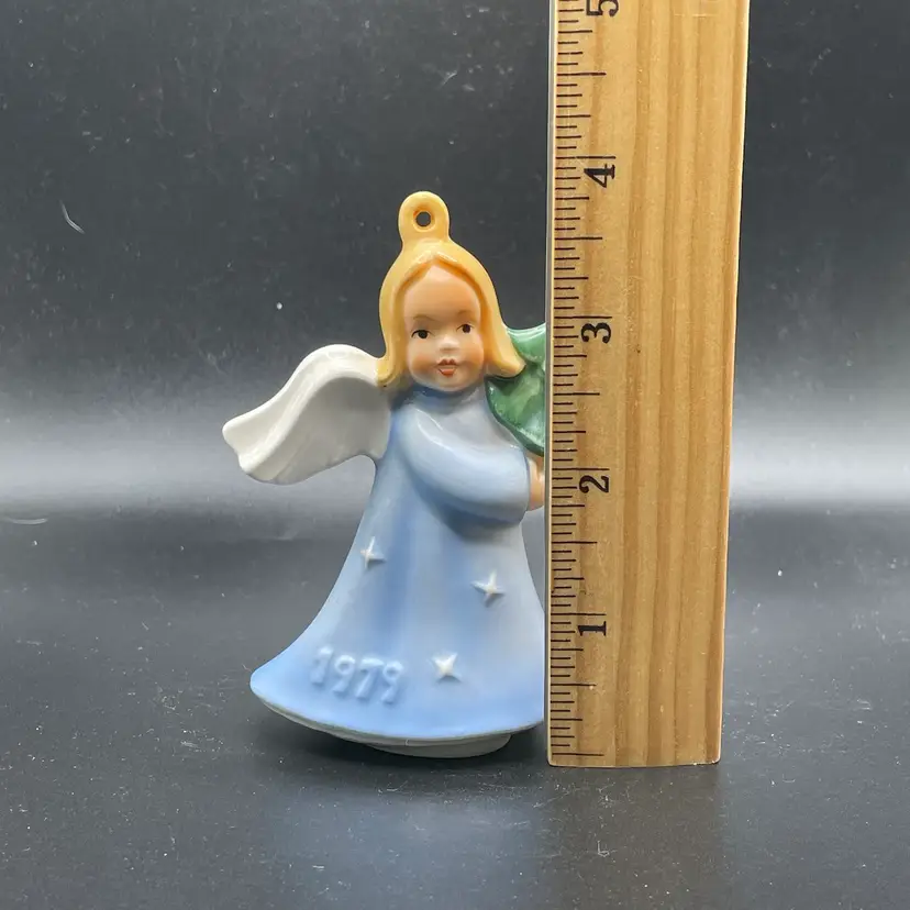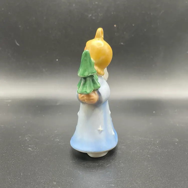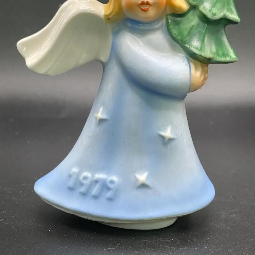 This is a vintage 1979 Goebel porcelain angel holding a tree hanging ornament. Made in West Germany. Measures approximately 4" tall. No chips or cracks.