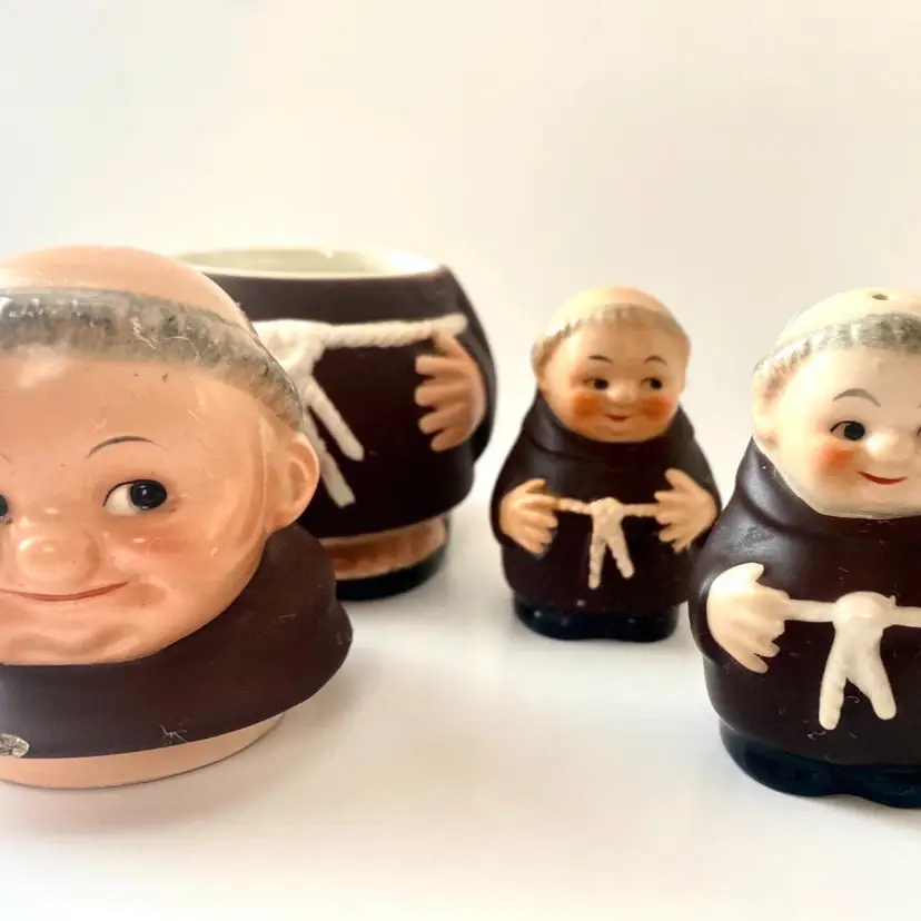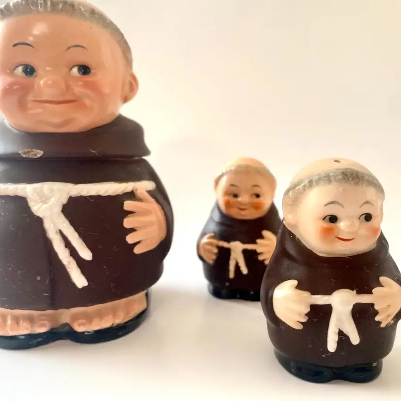 Goebel West Germany Franciscan Friar Salt Pepper Sugar set. Two small chips on sugar bowl as seen in picture. Otherwise in good vintage condition.