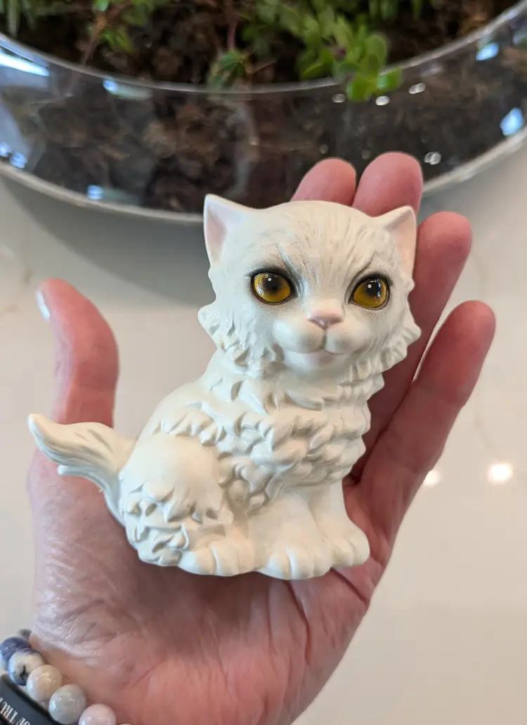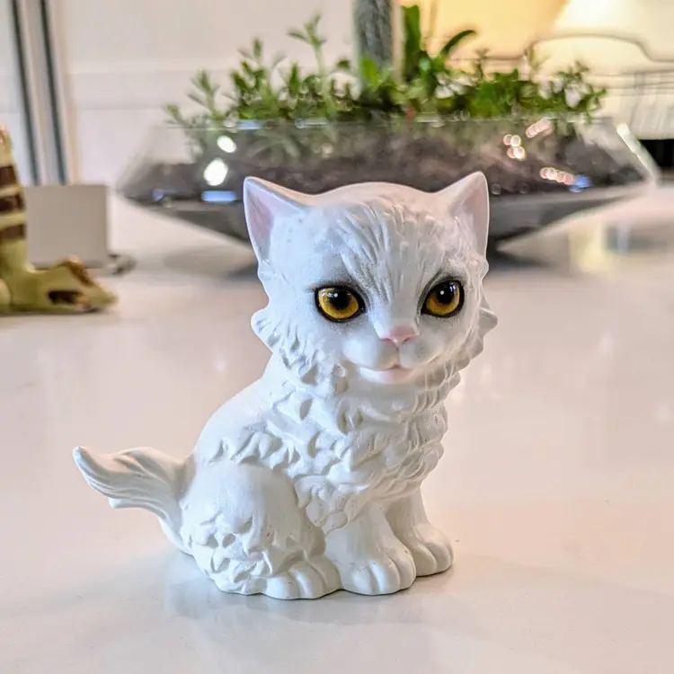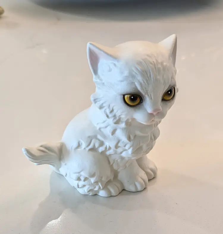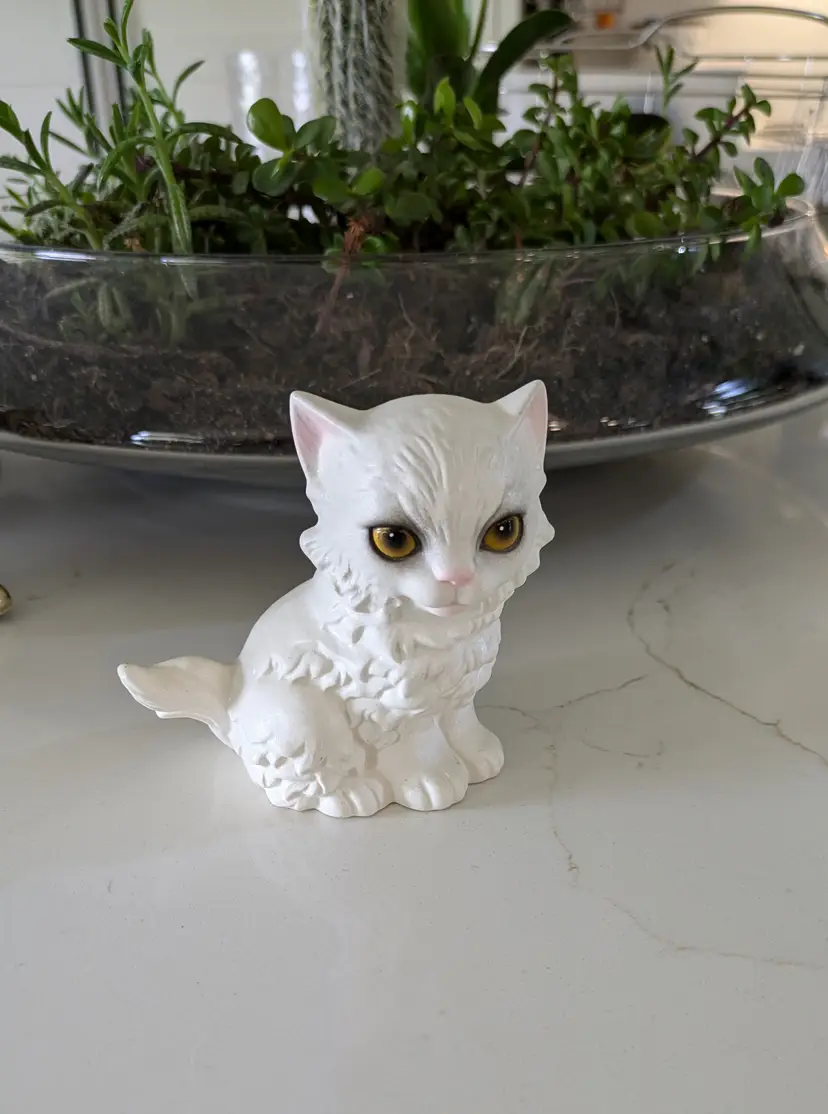 Exceptional sculpt, adorable vintage Goebel white Angora kitty cat figurine, circa 1970s, featuring gleaming golden eyes, expressive face with pink tinged ears nose and mouth, and smooth matt satin finish. Fine porcelain with makers mark and # stamp present. 3.1/4" tall x 3.1/2" long x 2.1/4" wide