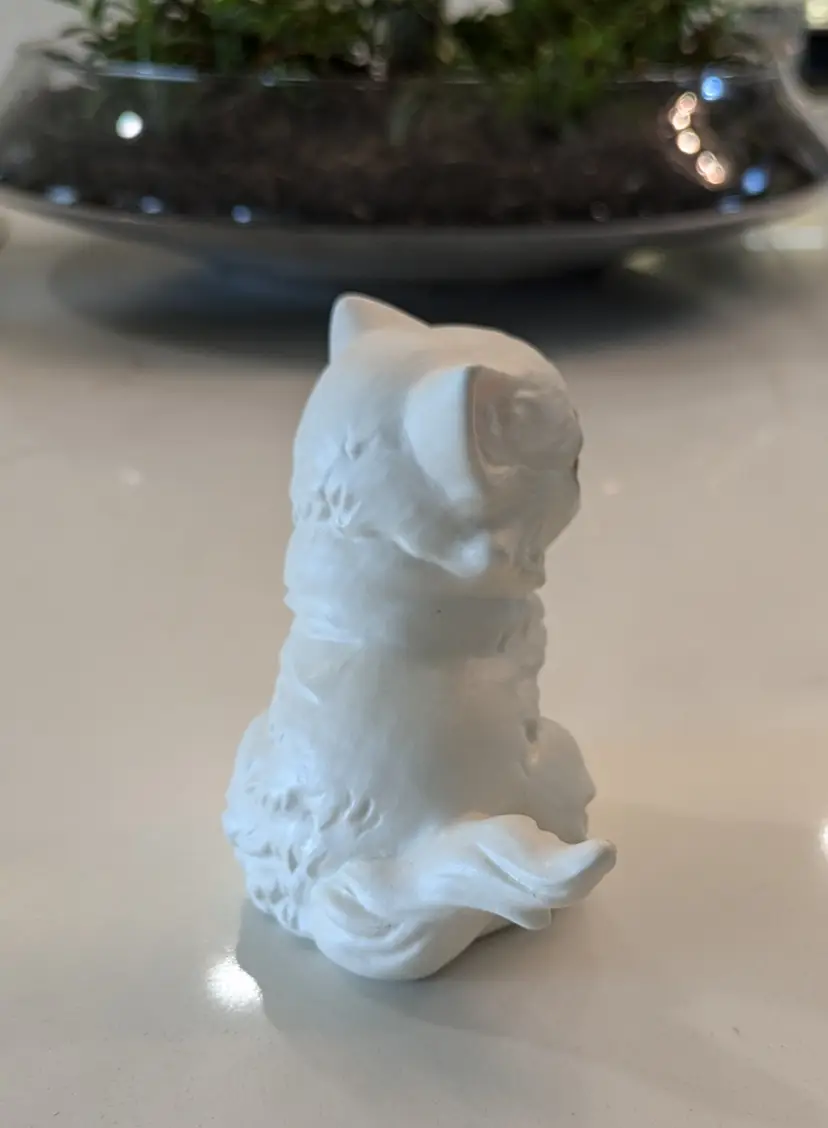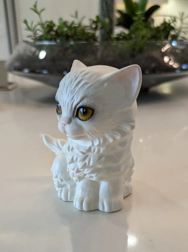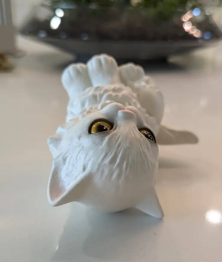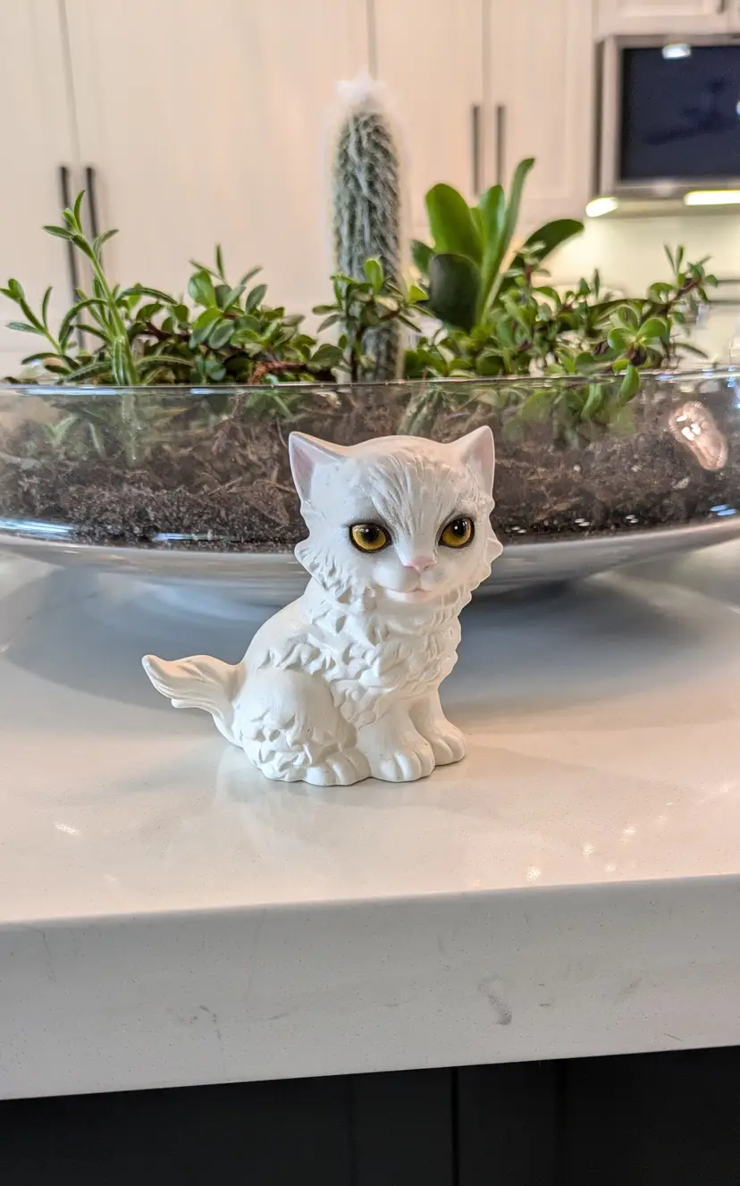 Exceptional sculpt, adorable vintage Goebel white Angora kitty cat figurine, circa 1970s, featuring gleaming golden eyes, expressive face with pink tinged ears nose and mouth, and smooth matt satin finish. Fine porcelain with makers mark and # stamp present. 3.1/4" tall x 3.1/2" long x 2.1/4" wide
