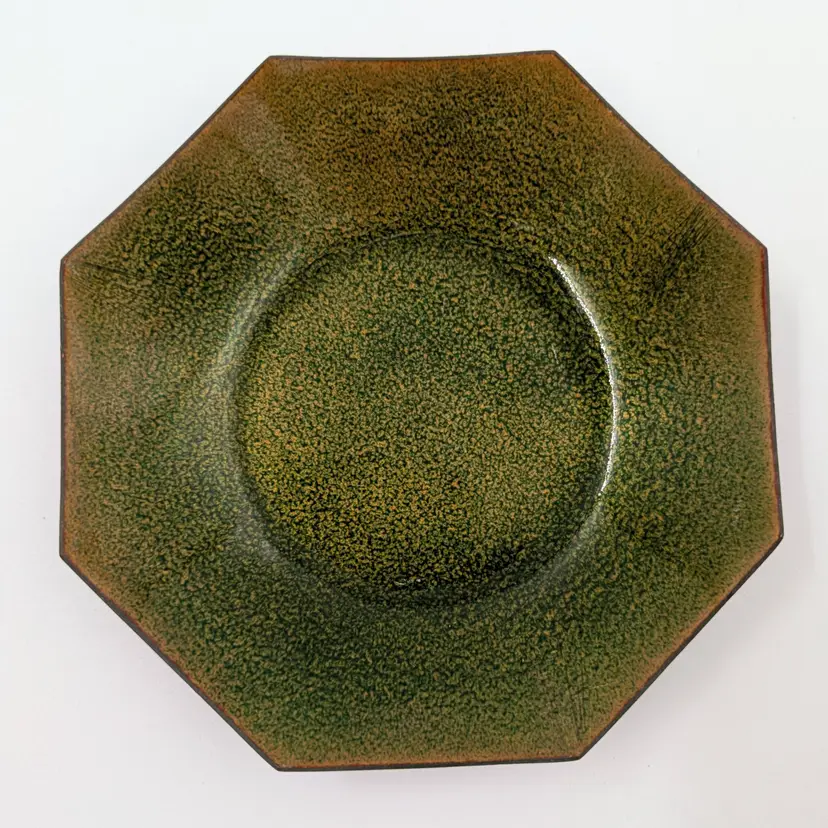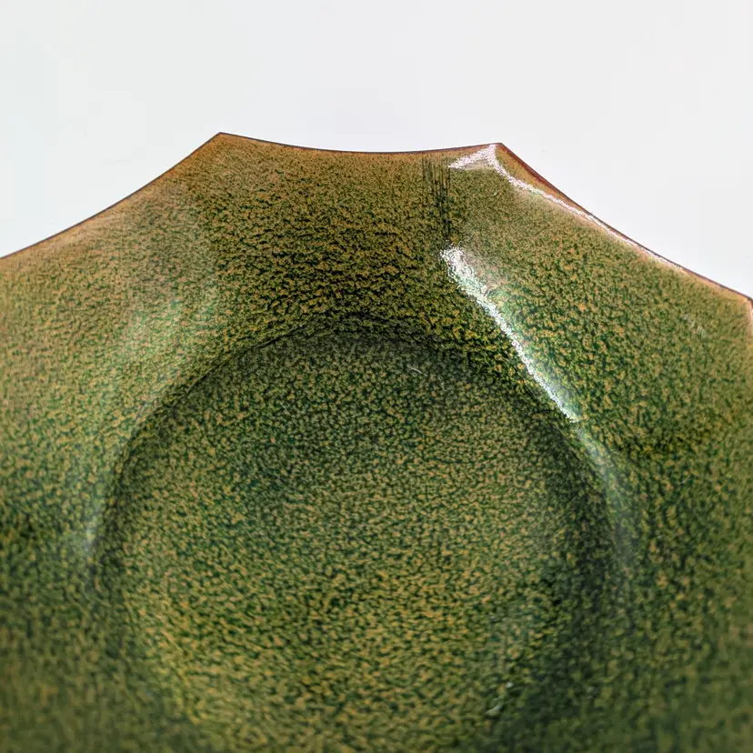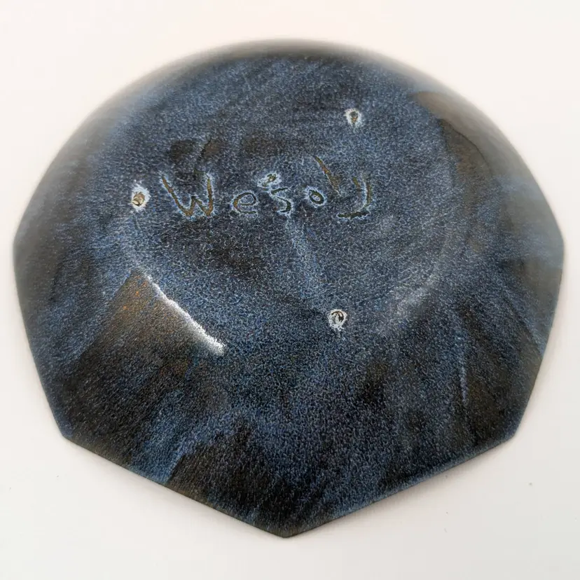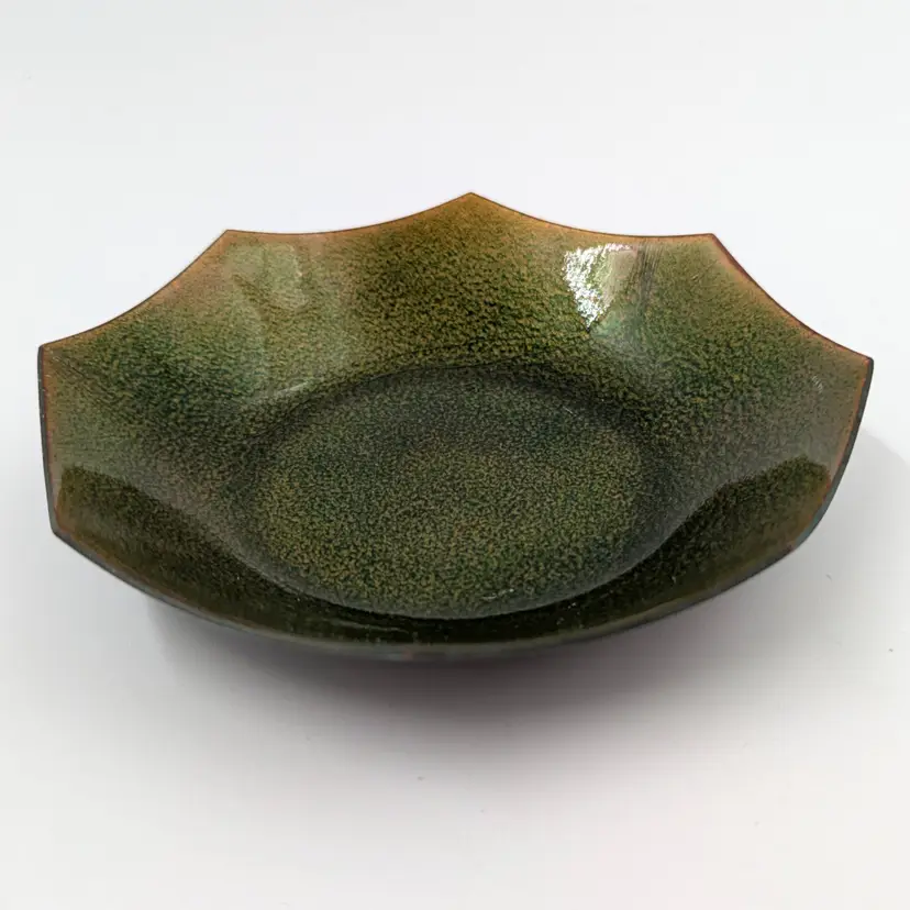 Beautiful handmade enamel on copper trinket dish with a unique geometric edge. The green enamel is mottled and lets the copper show through. The back is a similarly textured blue enamel. Signed on the bottom "Wesoly". The enamel has some cracks as shown in the pictures, but there isn't any missing.