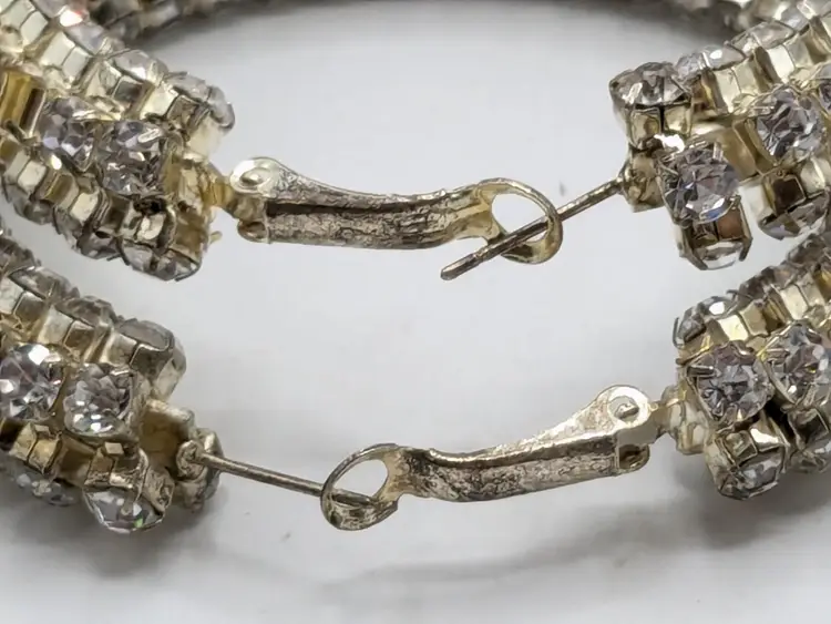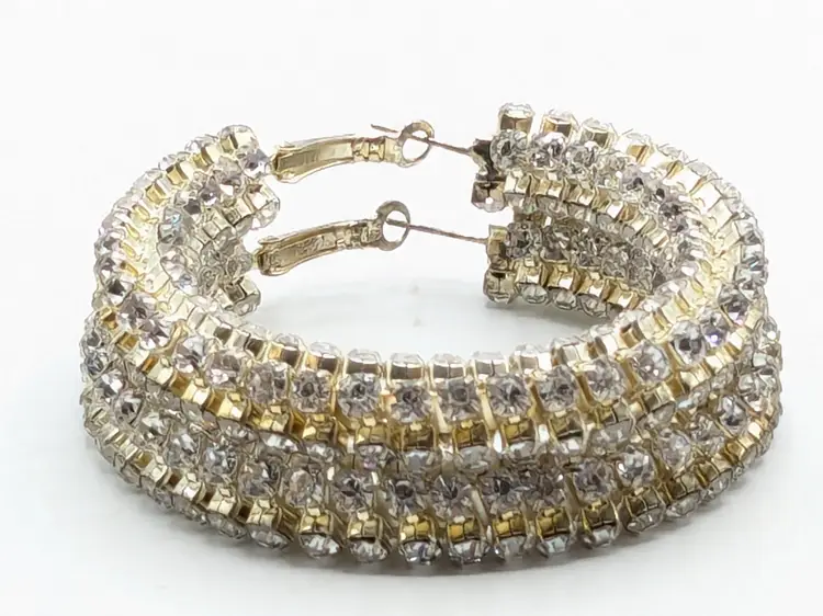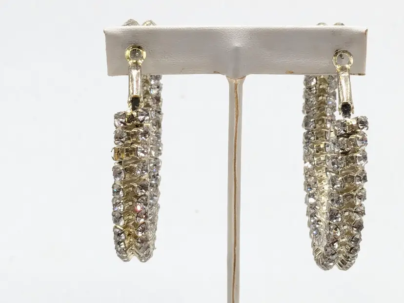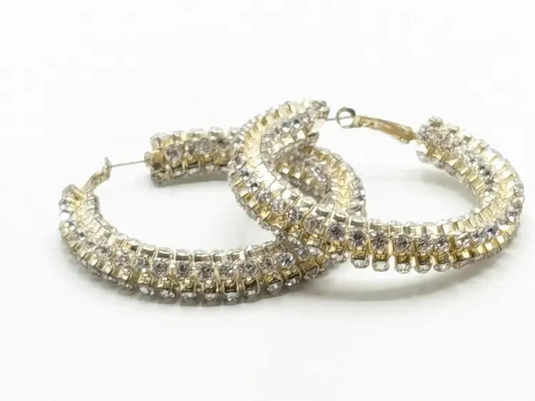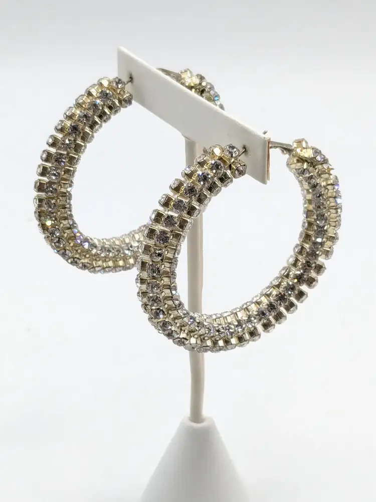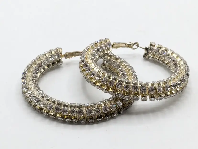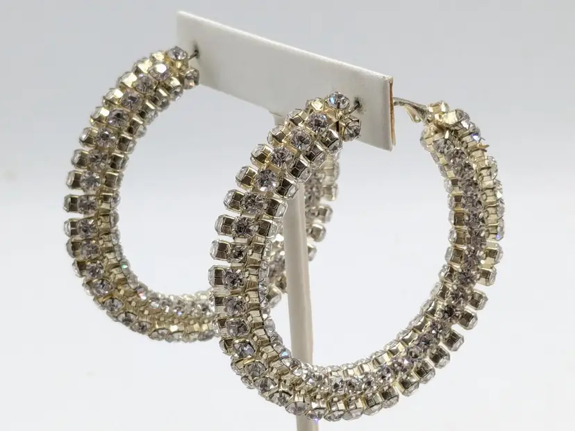 Good condition. BLING! Sparkling rhinestone encrusted hoop earrings. Silver and gold tone. READ: Hook closures are a little tarnished as depicted in the last photo. Measures 2 1/2". (EN1)