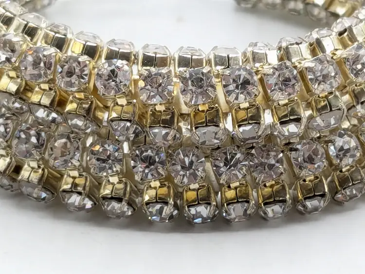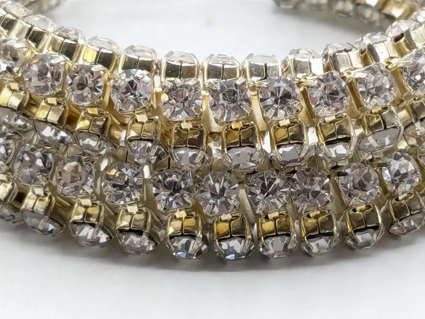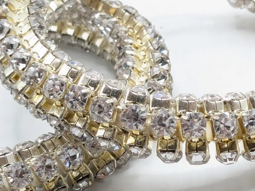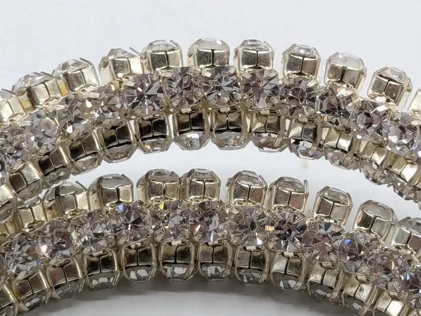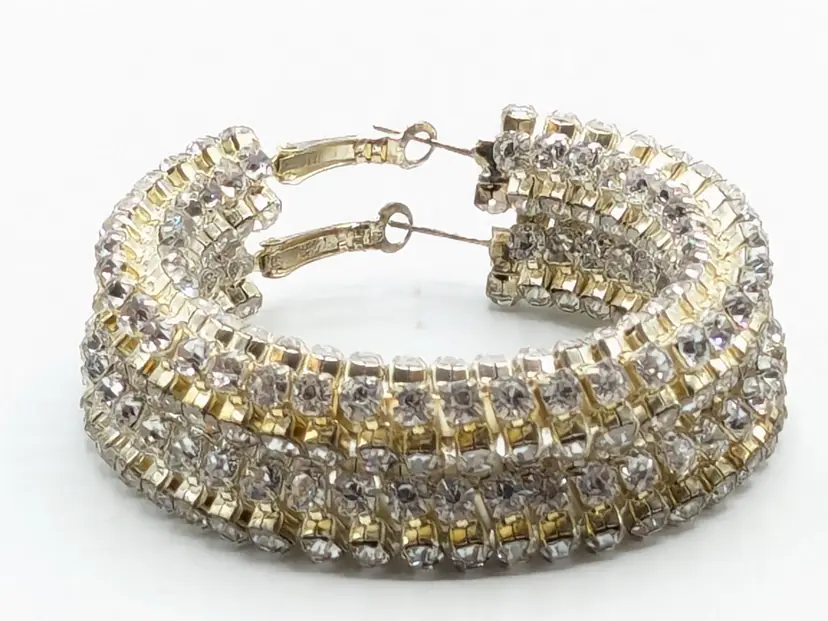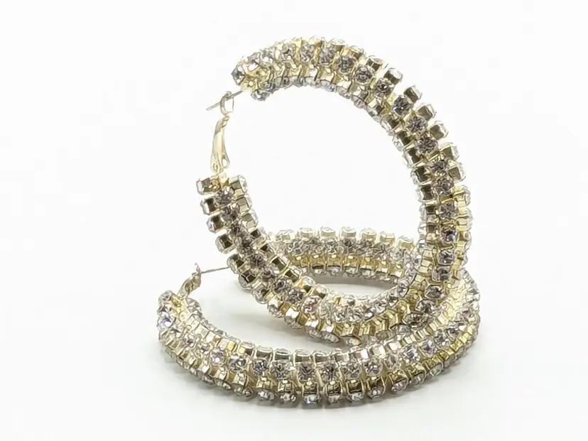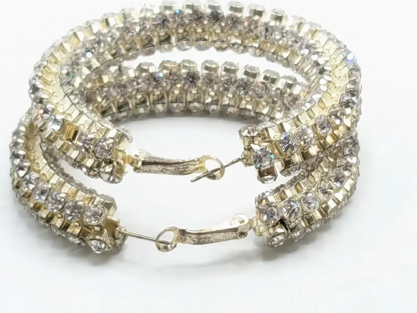 Good condition. BLING! Sparkling rhinestone encrusted hoop earrings. Silver and gold tone. READ: Hook closures are a little tarnished as depicted in the last photo. Measures 2 1/2". (EN1)