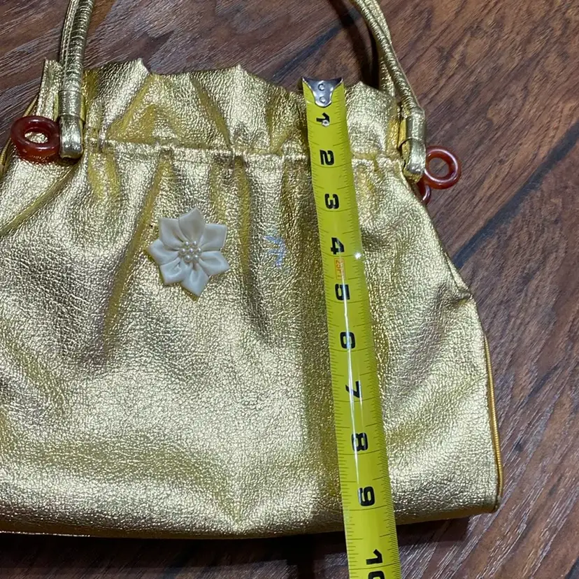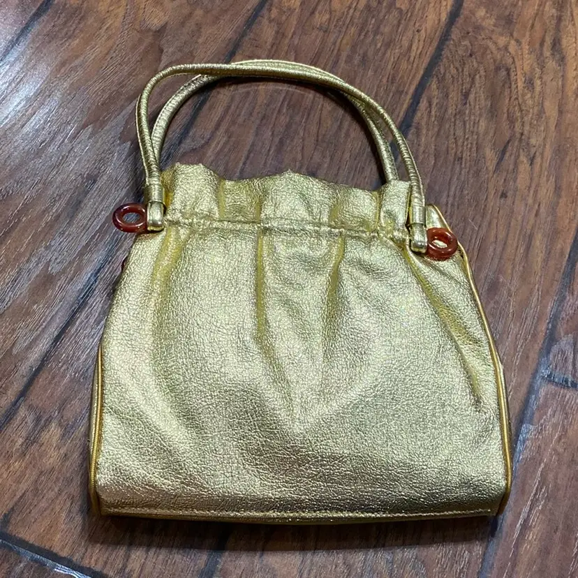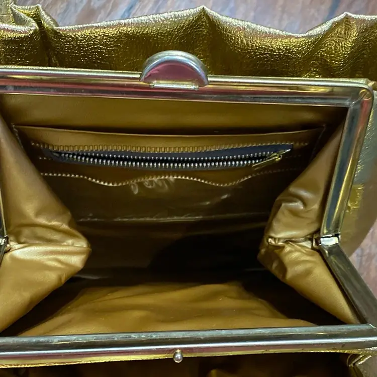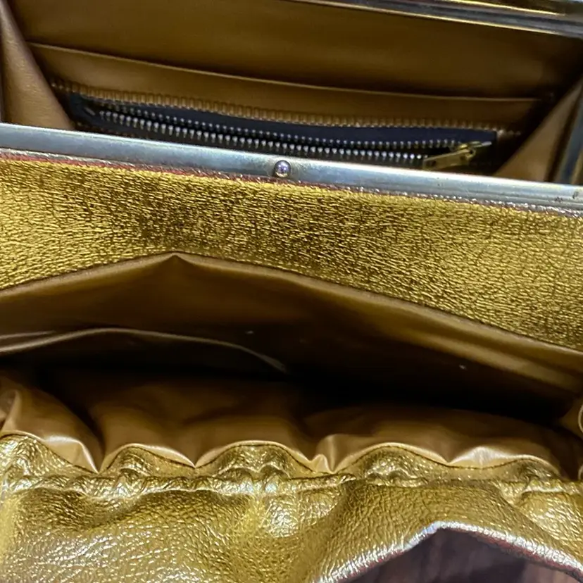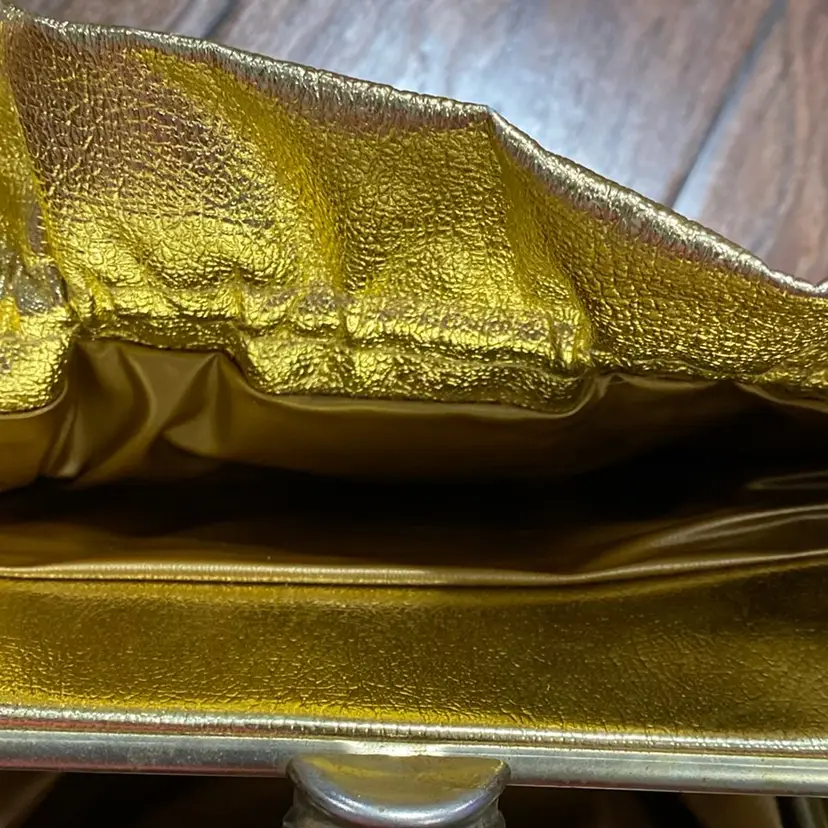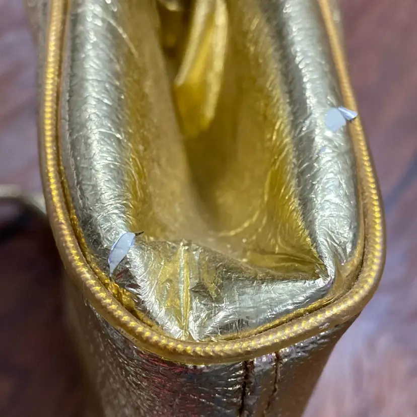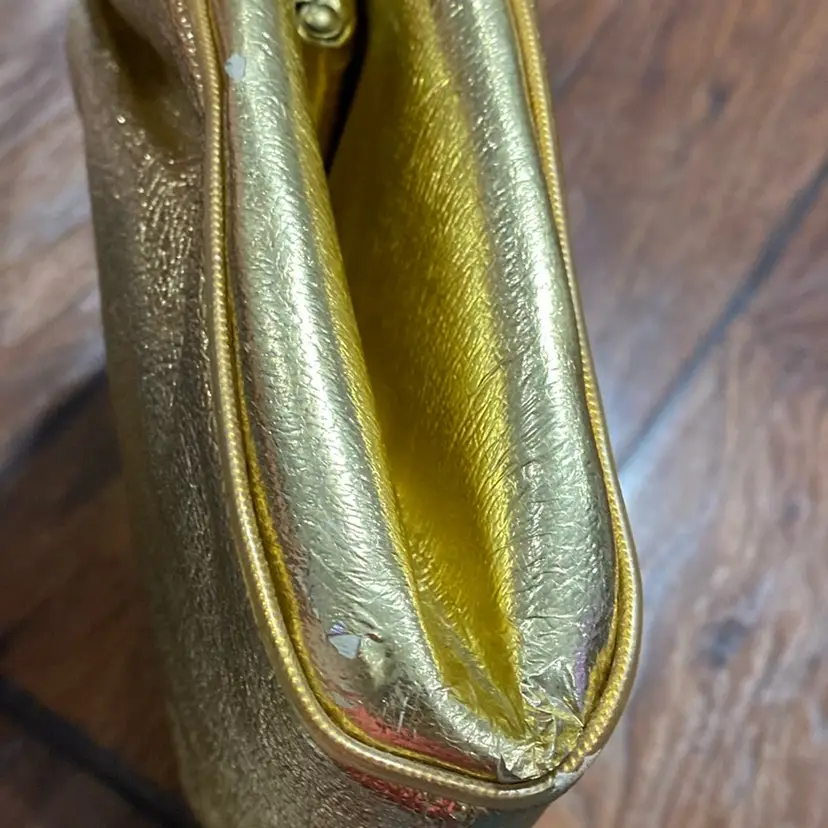 Possibly vintage gold clutch/shoulder purse. It does have some peeling on both sides. I included pictures showing that. There is also a peeled spot on the purse as shown in the photos.