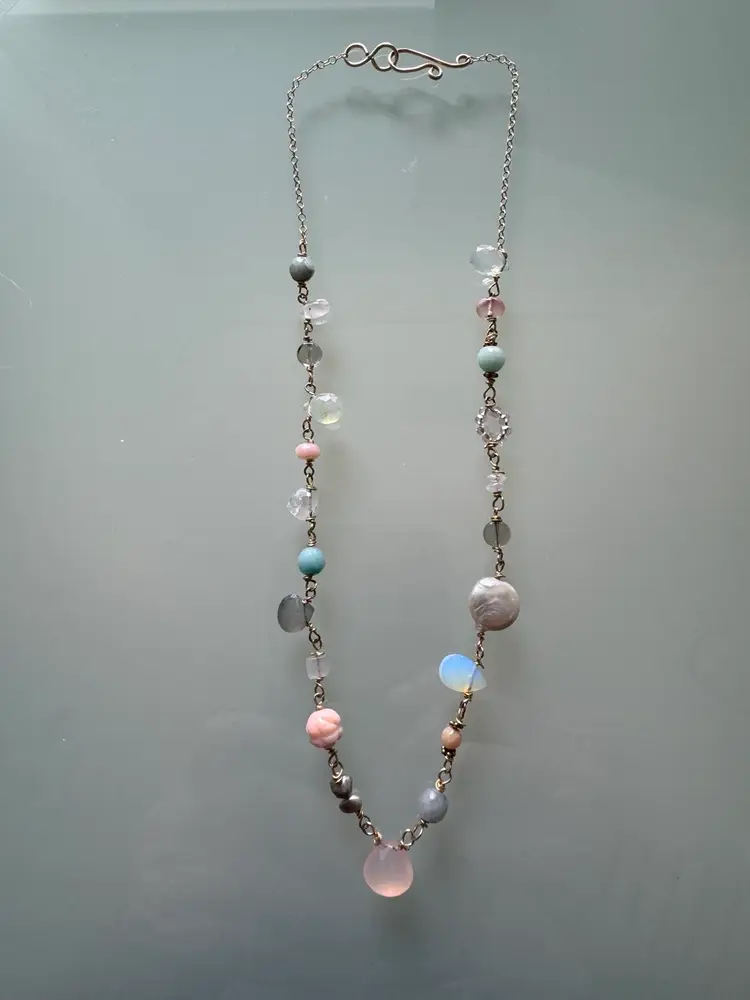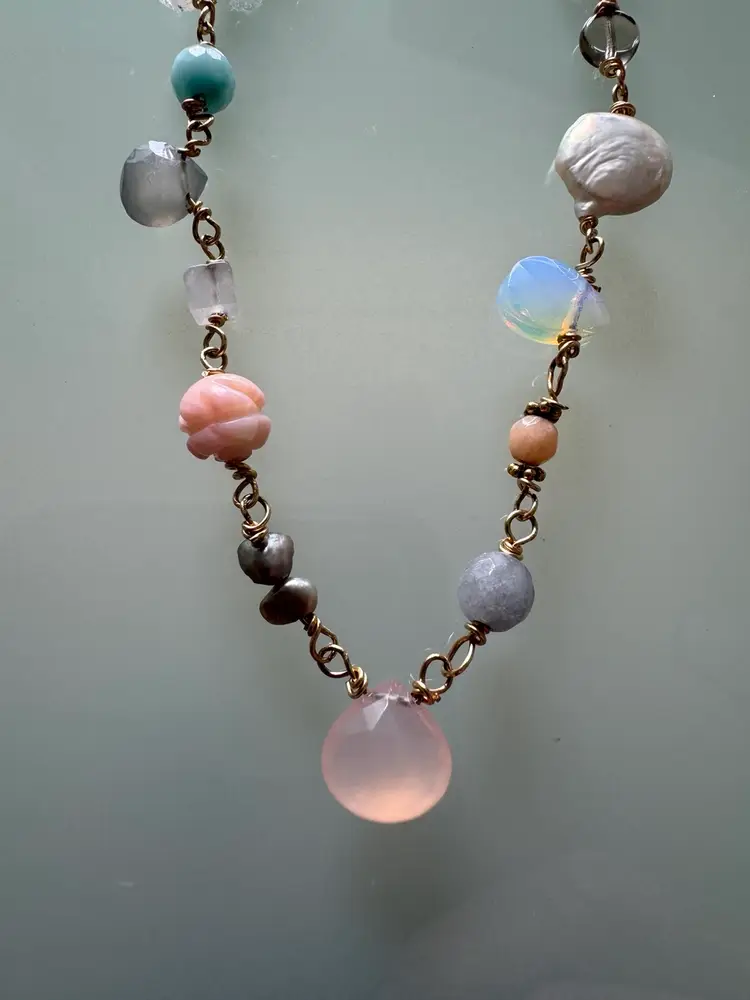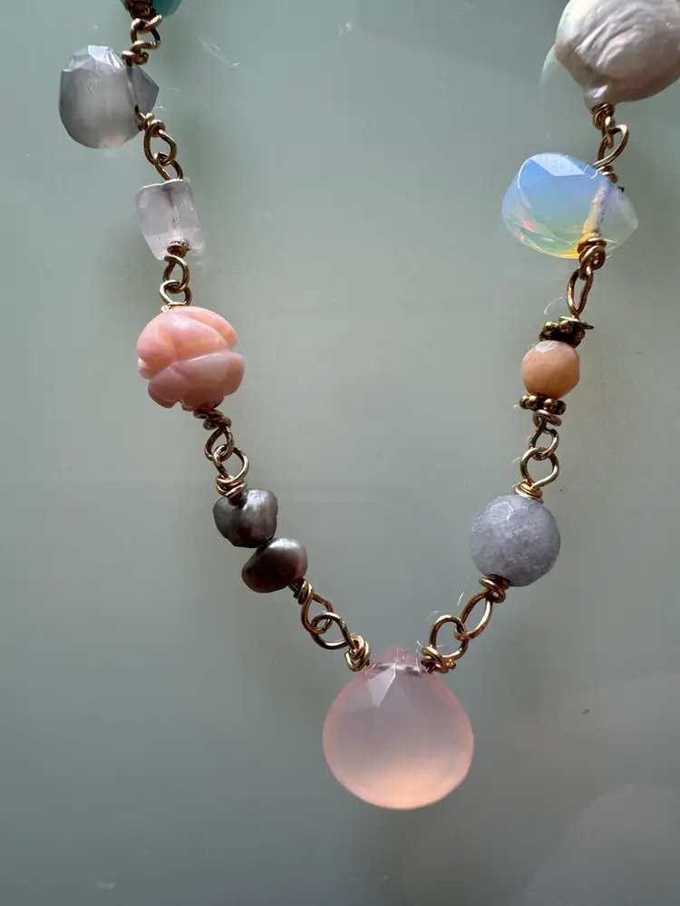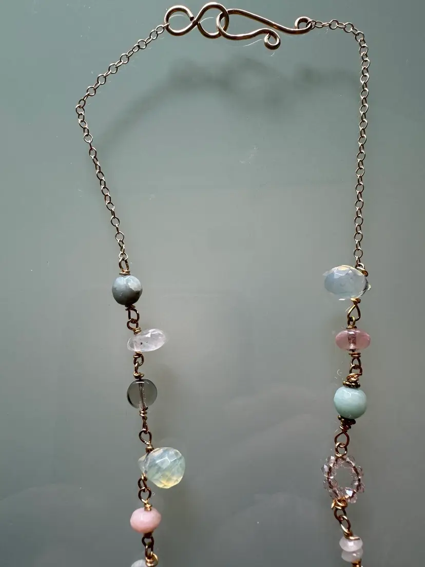 Labradorite Pearl Aventurine Rose Quartz A Few Of The Many Gemstones Adorn a Gold Filled Chain Necklace With Homemade Infinity Clasp Pinks Blues Creams and Crystals 17.5"