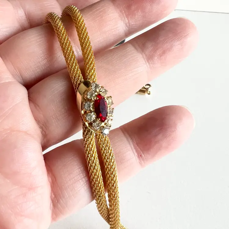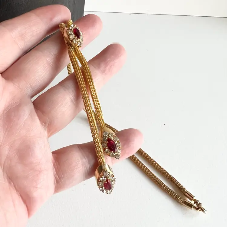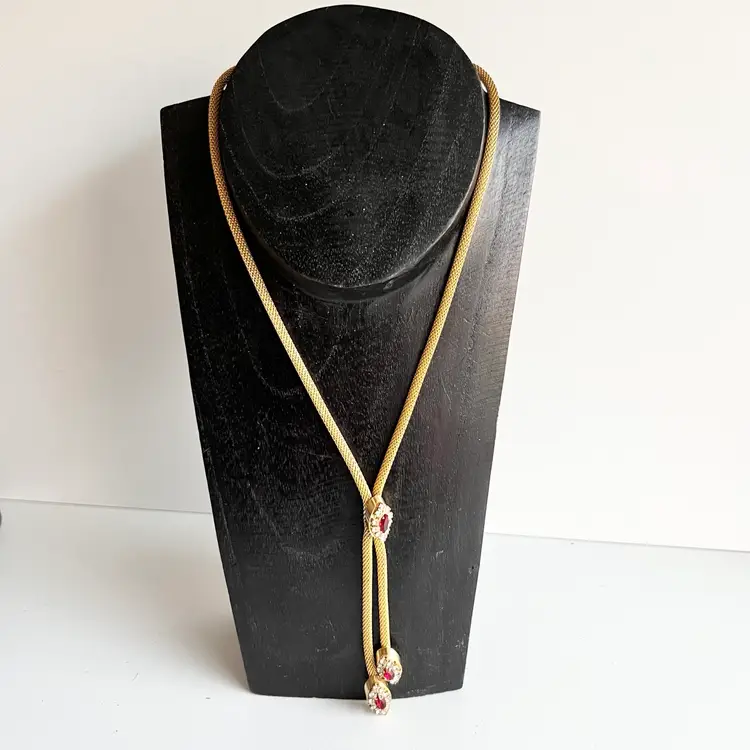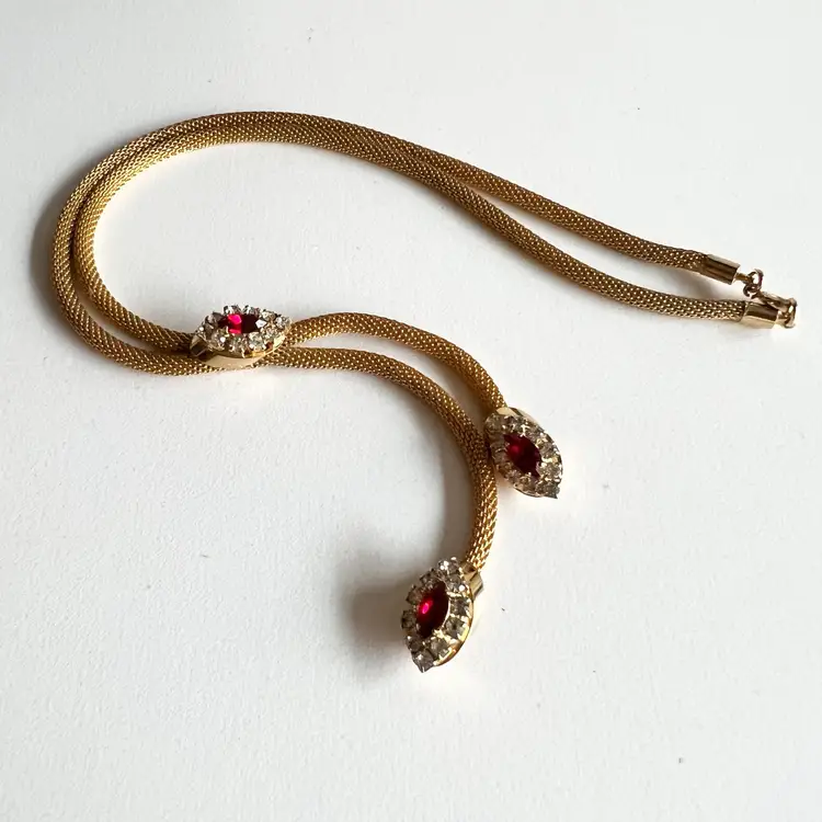 Just in time for Christmas, this necklace would look fantastic with a formal Christmas dress or New Year’s Eve outfit. 15” to the first rhinestones and then a four and three-quarter inch drop. Ships from Canada.