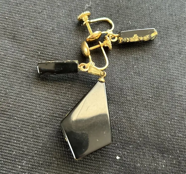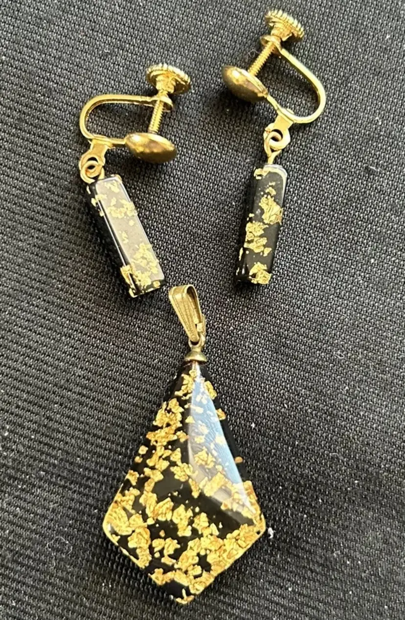 Vintage Gold Flake In Acrylic 3D Necklace Pendant Matching Screw Back Earrings 1”
