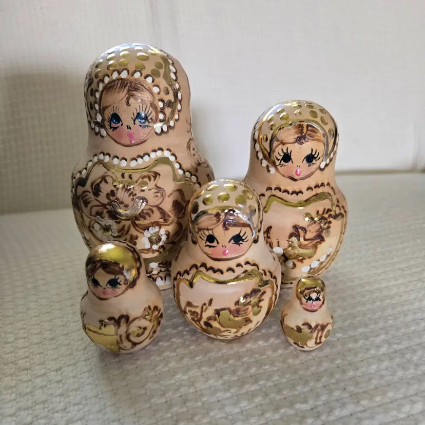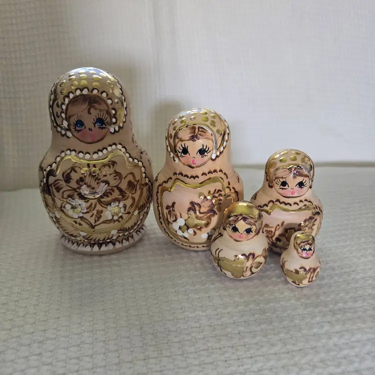 5 handpainted nesting dolls. Highly detailed and made with a wood burning technique, then trimmed in gold. Created in the tradition of Matryoshka folk art dolls. The largest doll measures approx. 4 1/2" tall and 3 1/2" wide. In beautiful condition. No damage. No repairs.