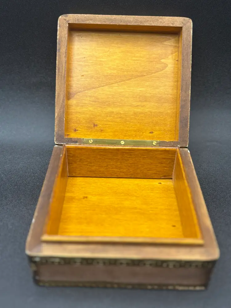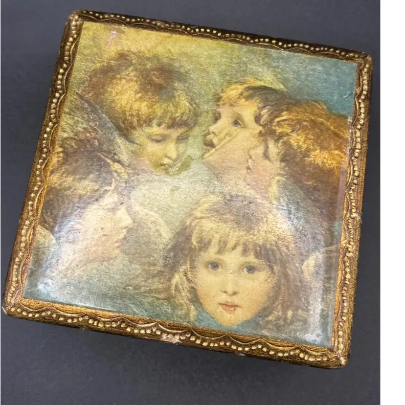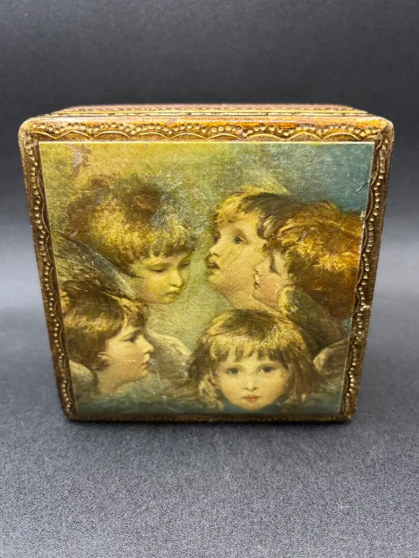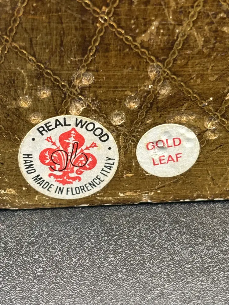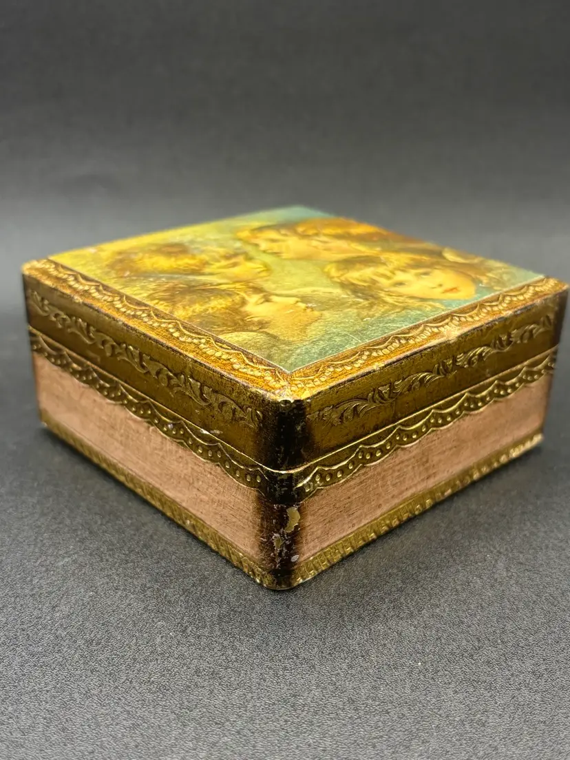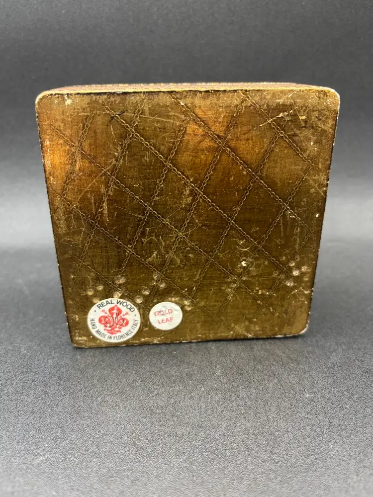 Beautifully decorated gold leafed wooden trinket box with original made in Florence Italy stickers Has natural patina, no cracks 4” square