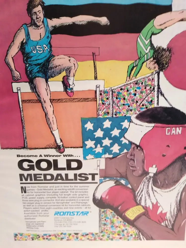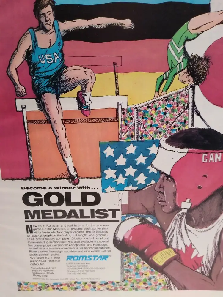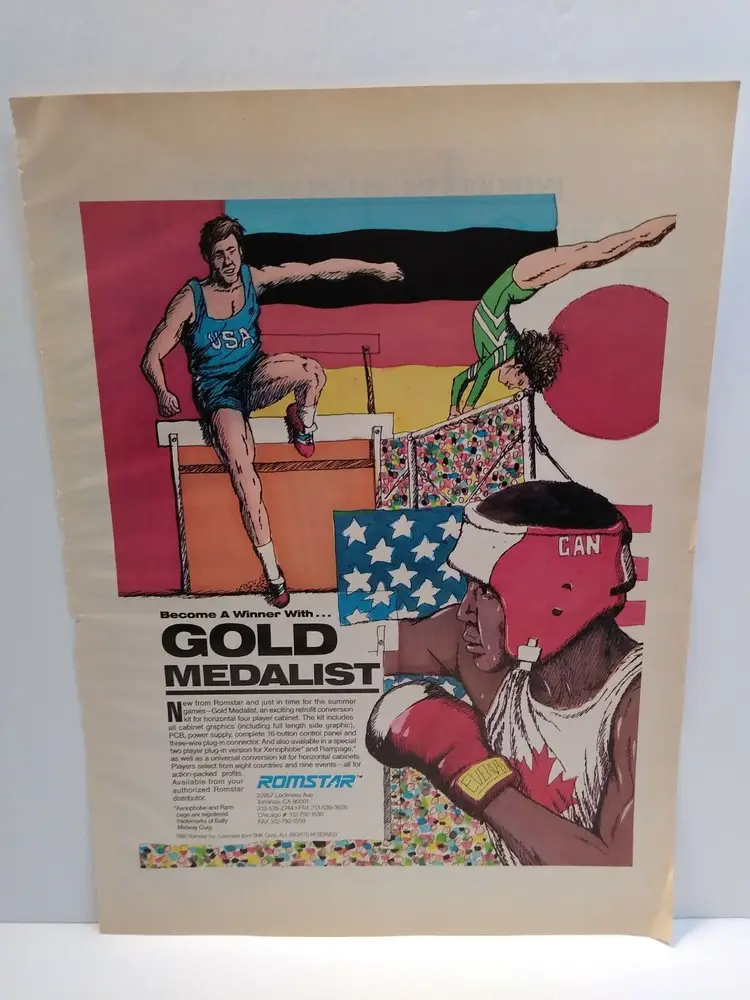 Arcade Game: Ad Theme: Race Driving Modified Item: Yes Country/Region of Manufacture: United States Original/Reproduction: Original Year: 1988 Game Title: Gold Metalist Modification Description: Worn edges. Pulled from trade magazine. See notes. Brand: Romstar