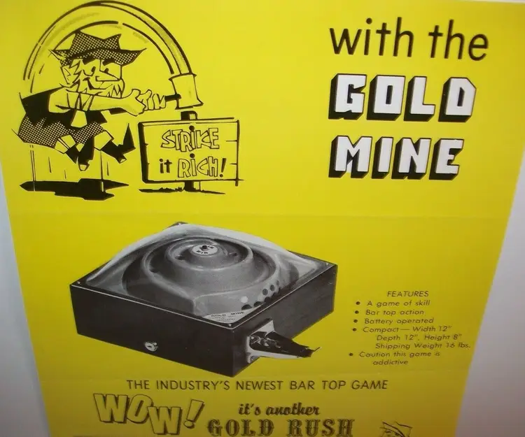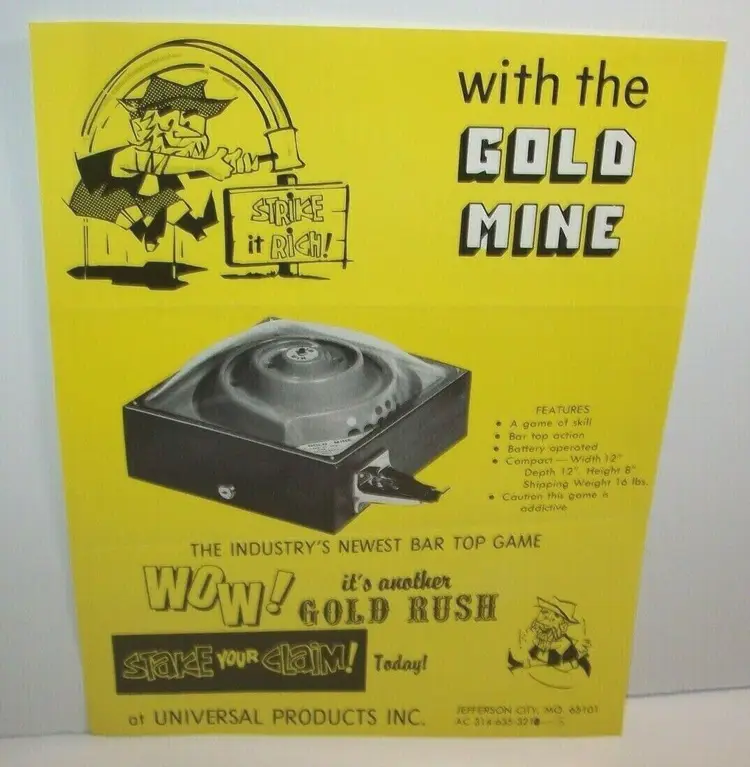 Arcade: Flyer Theme: Coin-Op Style: Trade Stimulator Modified Item: Yes Country/Region of Manufacture: United States Original/Reproduction: Original Year: Unknown Game Title: Gold Mine Modification Description: Folds, see notes. Brand: Universal Products Inc.