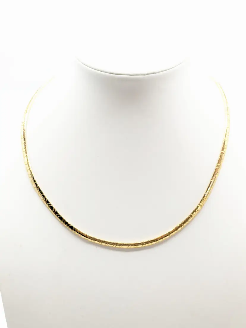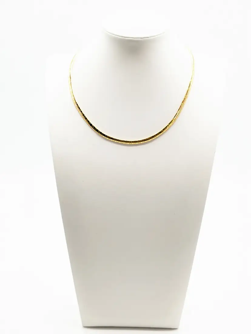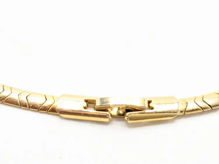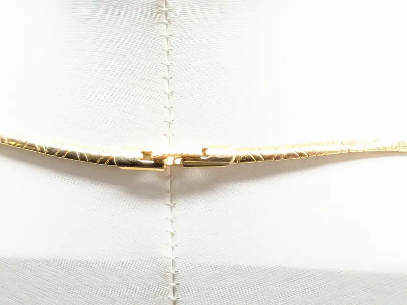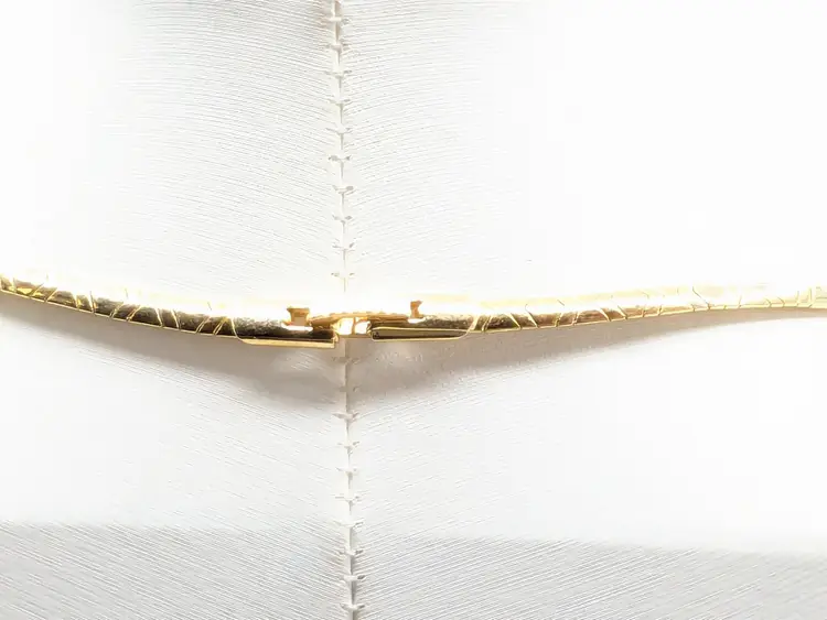Good condition. Necklace is bright and shiny with no color loss. Fold over clasp closure. Measures 16". EN3