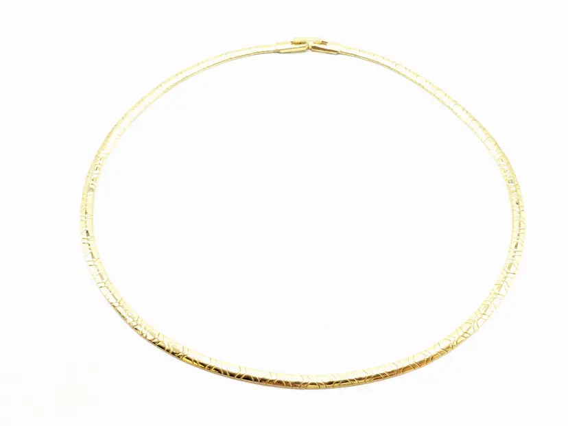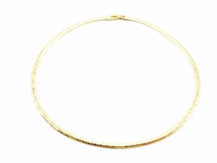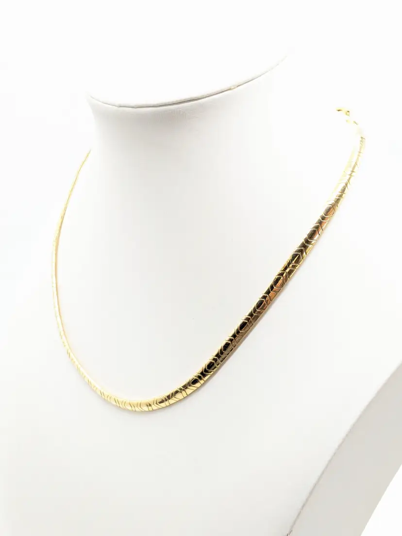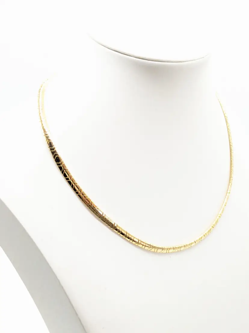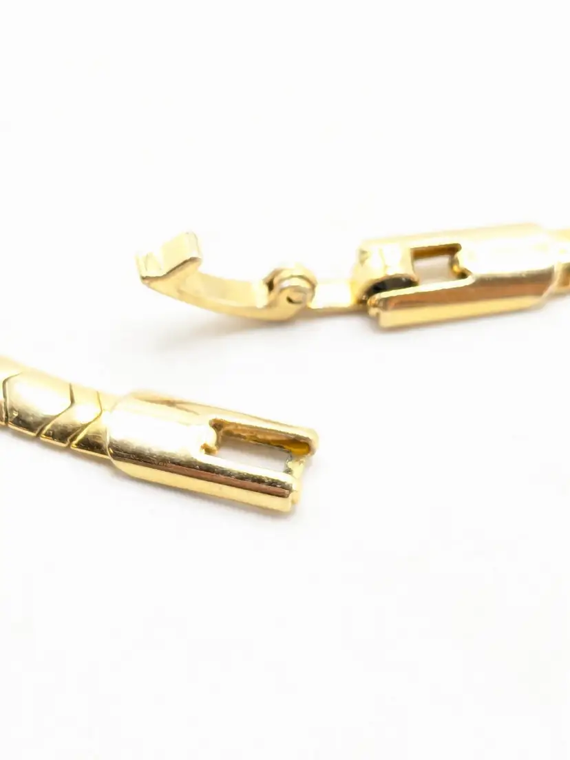 Good condition. Necklace is bright and shiny with no color loss. Fold over clasp closure. Measures 16". EN3