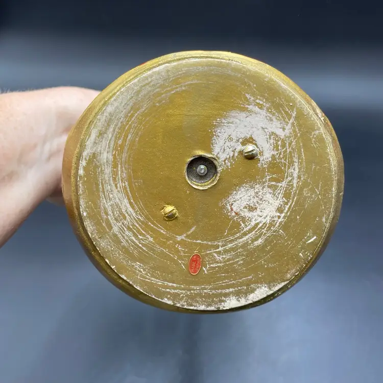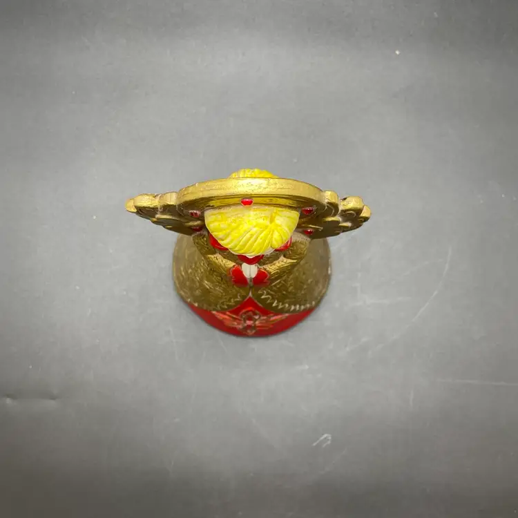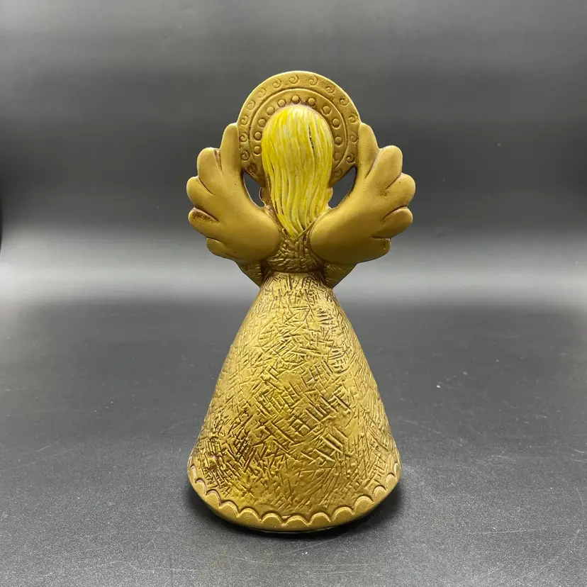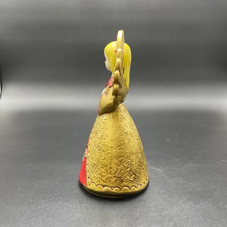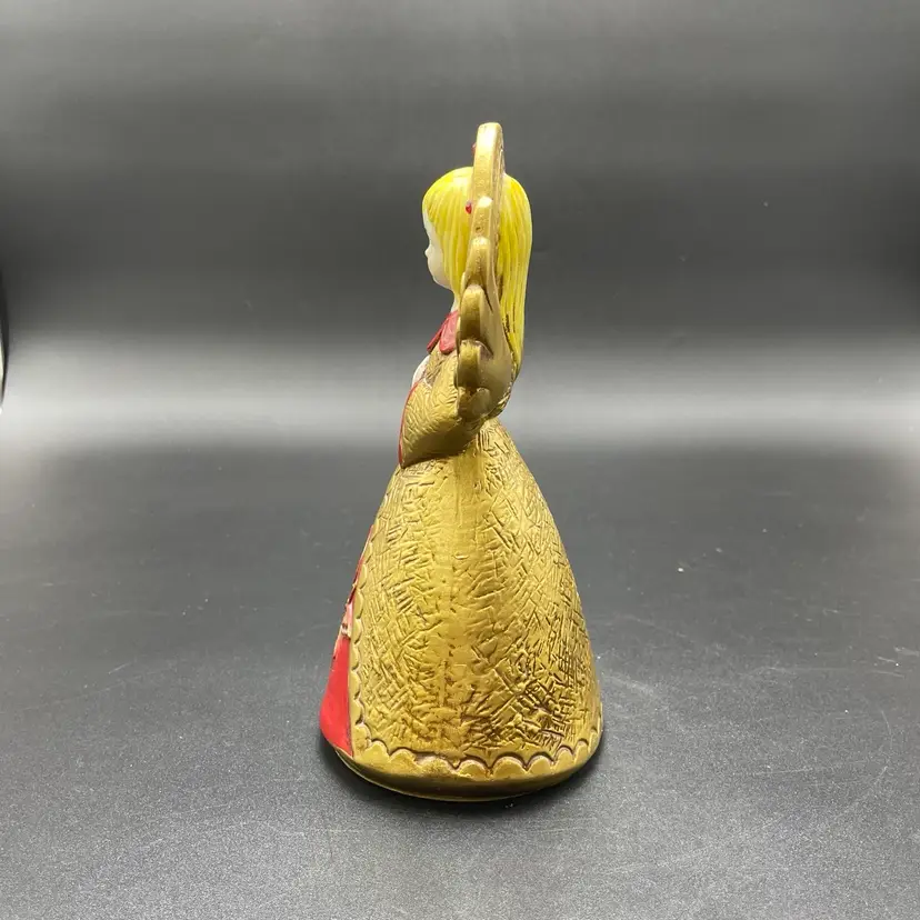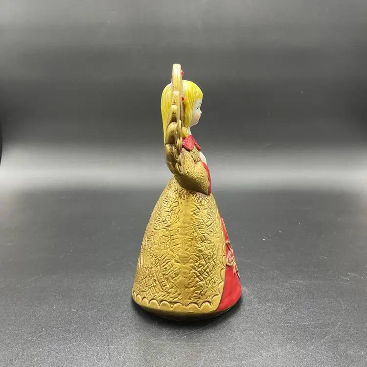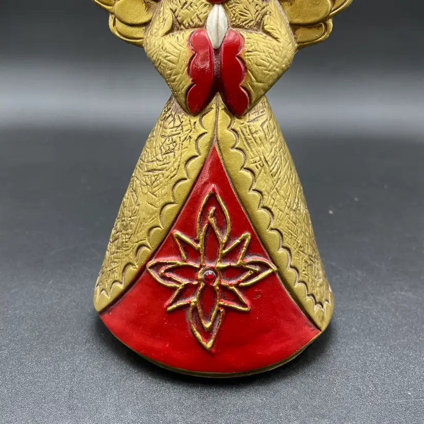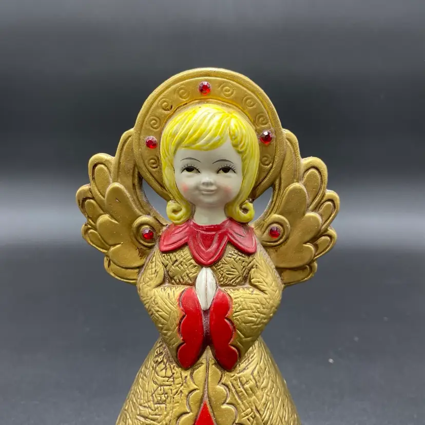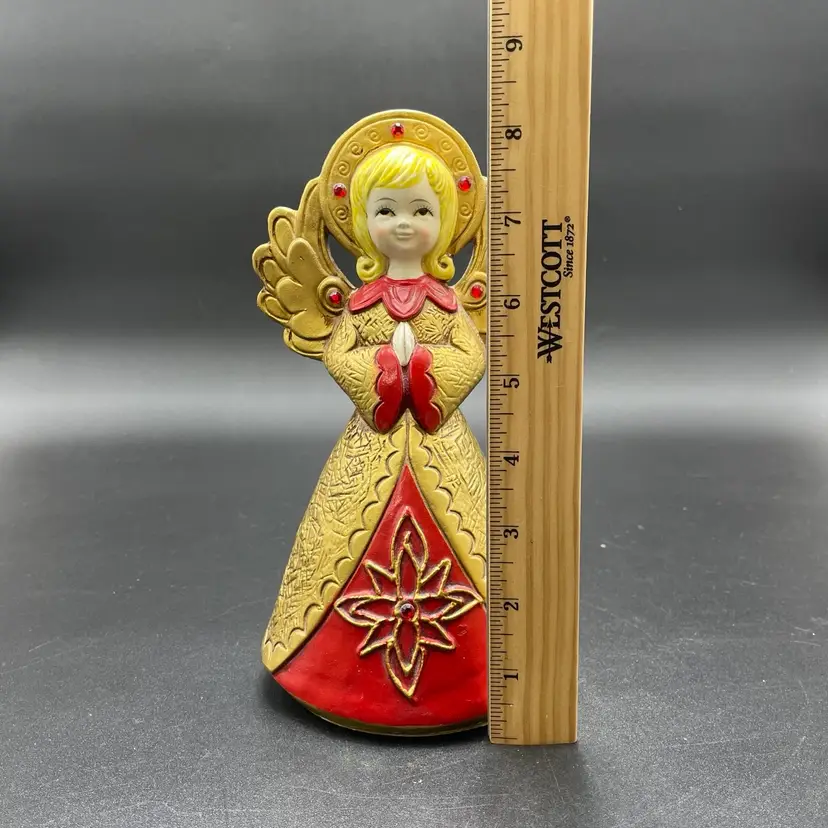 This is a vintage gold and red angel with jewels figurine. She measures approximately 8" tall. She may have been attached to a music box at one time. No major flaws.