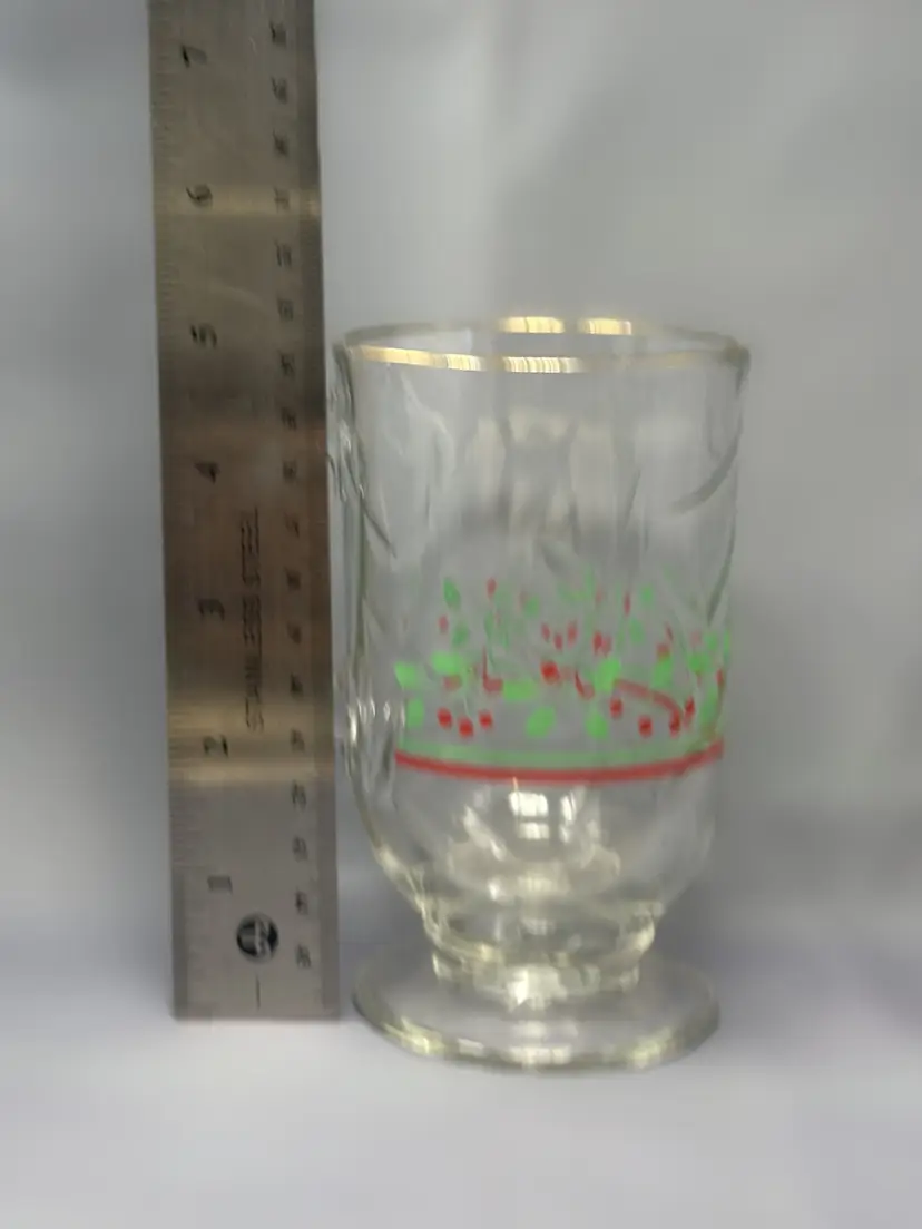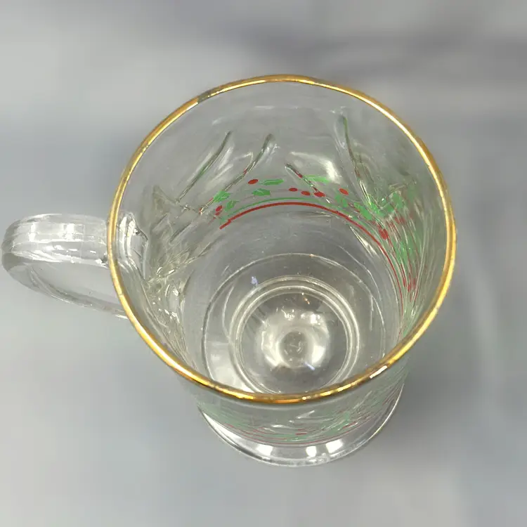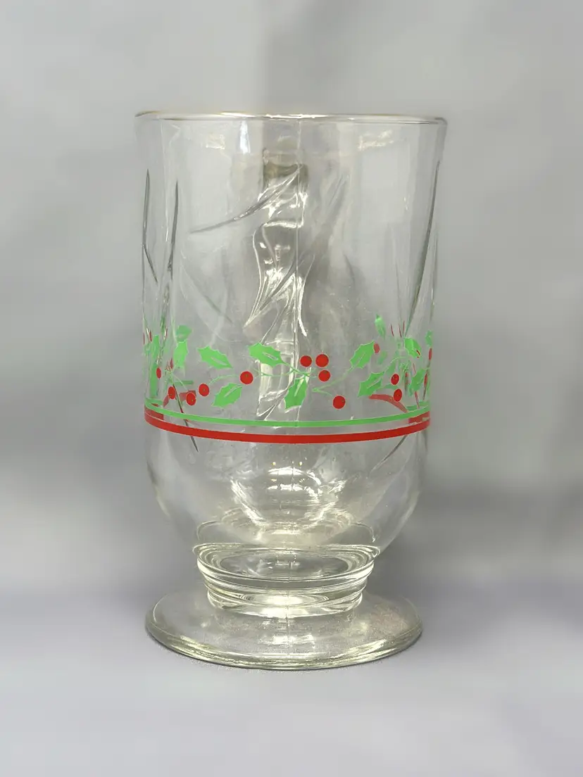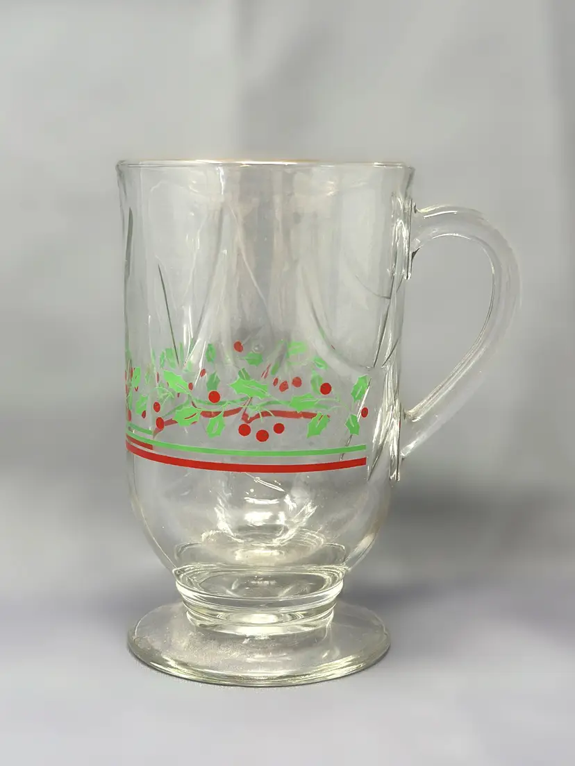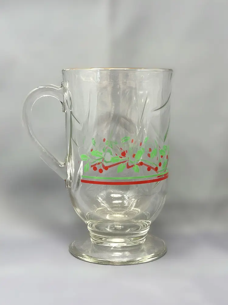 Details • Markings: Libbey “L” stamp on base • Design Style: Traditional, Cottagecore, Classic Holiday • Colors & Finish: Clear glass, red and green holly motif, gold rim • Capacity: ~12oz • Material: Pressed glass • Dimensions: 5"H × 3" diameter, 4.25" width with handle • Condition: Minor wear to gold rim from age; no chips, cracks, or cloudiness