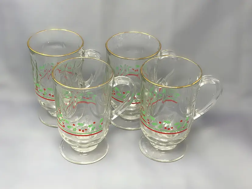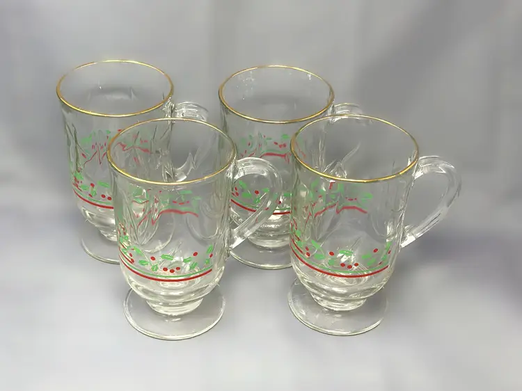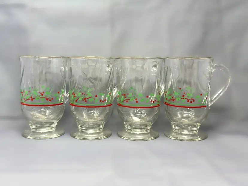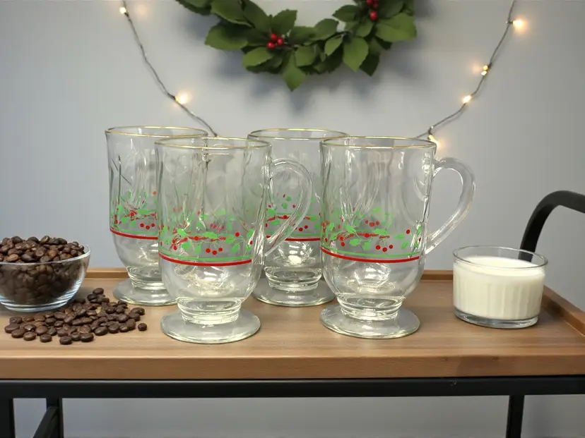 Bring timeless holiday cheer to your table with this set of four gold rimmed Irish coffee mugs by Libbey, featuring a festive holly berry design from the 1980s. Perfect for cappuccino, cocoa, lattes, or mulled wine during winter gatherings—or as a thoughtful gift for anyone who loves vintage Christmas décor and cozy entertaining.