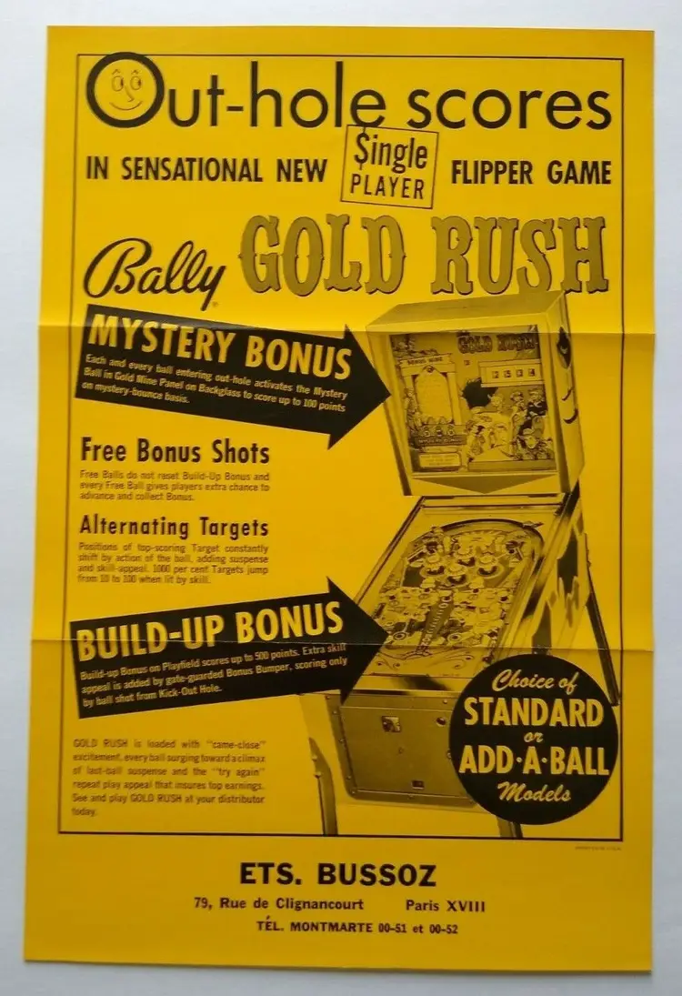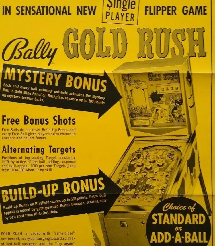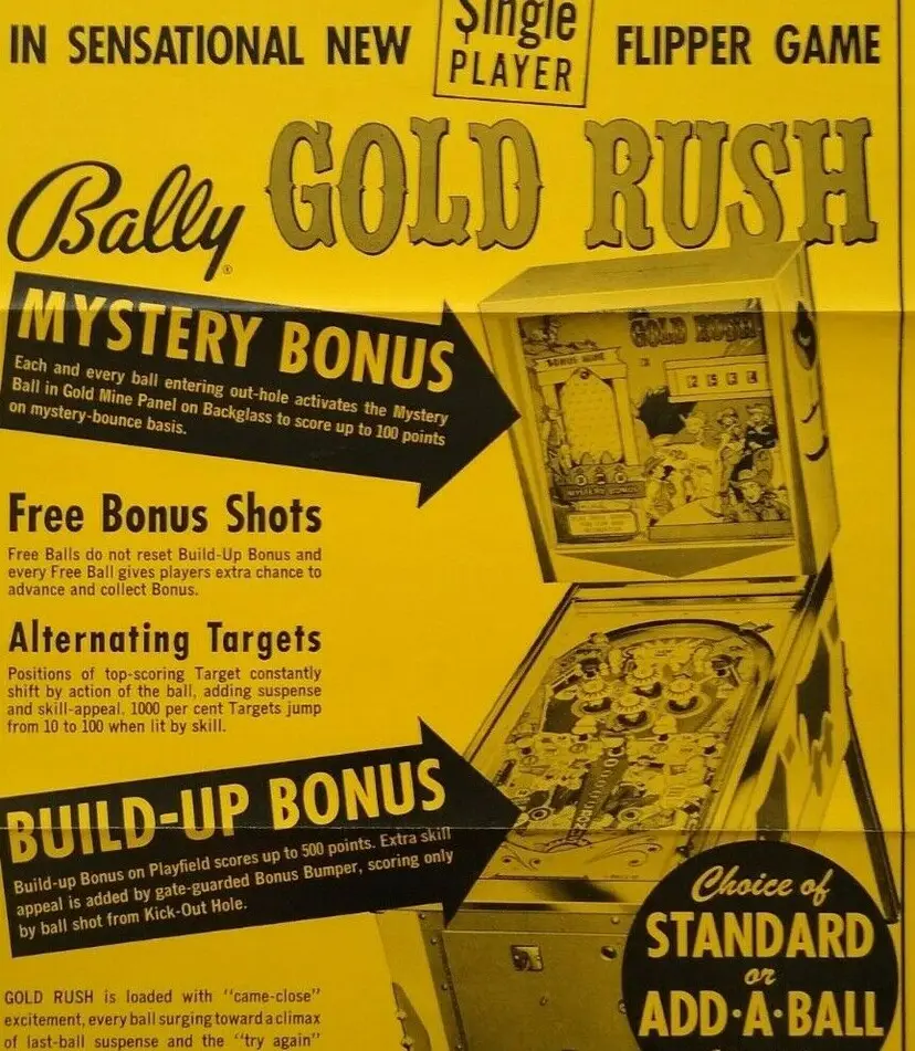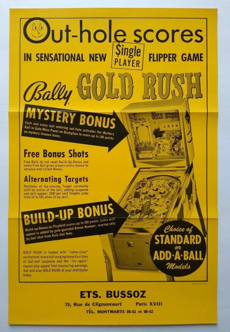 Pinball: Flyer Model: Gold Rush Theme: Gold Mining Modified Item: No Country/Region of Manufacture: United States Year: 1966 Brand: Bally