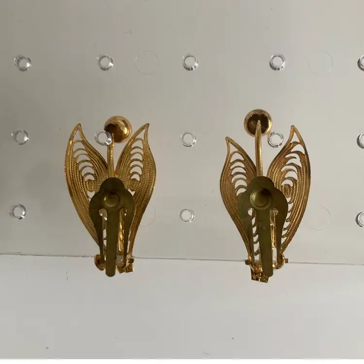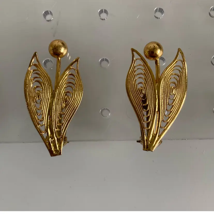 Beautiful gold tone scrollwork filigree clip on earrings. They are unnarked and look gold plated to me. Unknown. They each measure 3/4” across x 1 1/2”.
