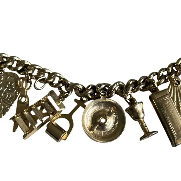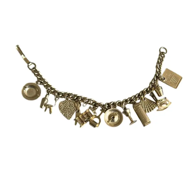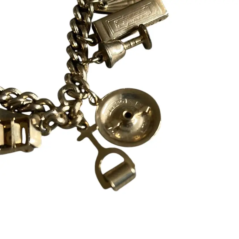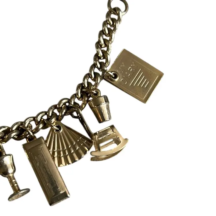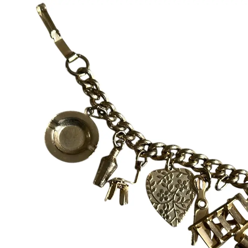 So fun and full of charms. There are 14 including a dairy, a pot, a rocking chair, a fan, a harmonica, a wine glass, a roulette table that spins, a roller, a ladder that opens, scissors that open, a heart, a chair, a martini shaker, and an ashtray.