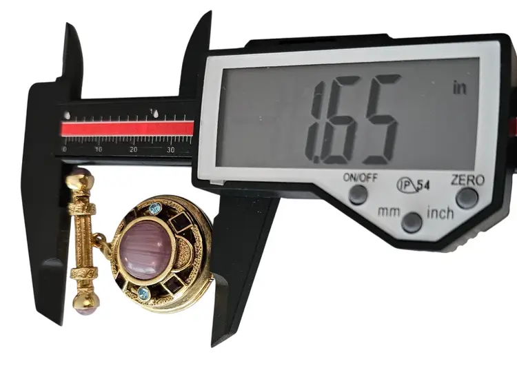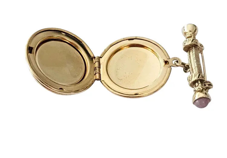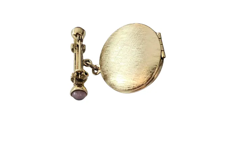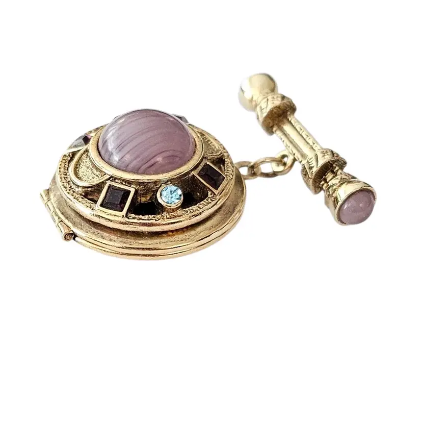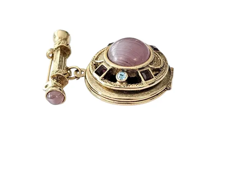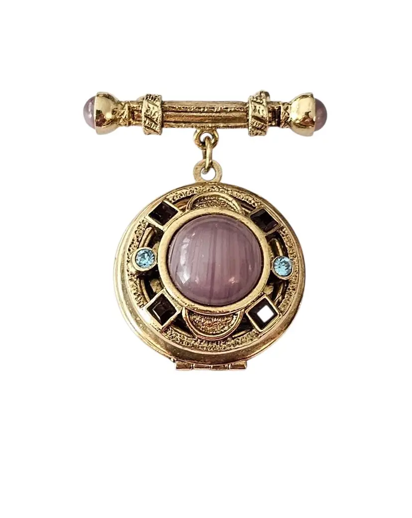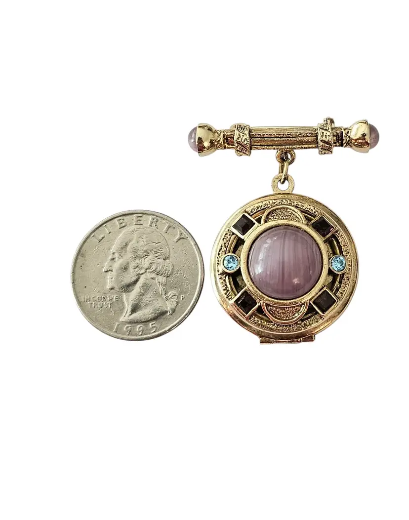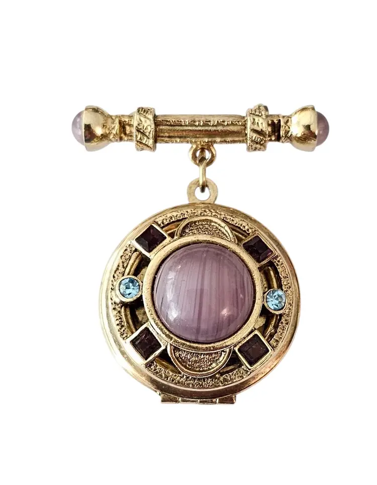 • 1928 Brand Glass Locket Dangle Brooch • Etruscan-inspired costume jewelry • Round-shaped dangle locket • Intricately detailed front side frame • Radiant gold-tone base metal • Polished finish • Large purple round-shaped Art glass centerpiece • Embellished with a glass cab and square-shaped rhinestone • The locket measures approximately 1.7 inches in diameter • The bar pin has a locking component that fastens securely to your clothes • Unmarked piece • Good condition • C209