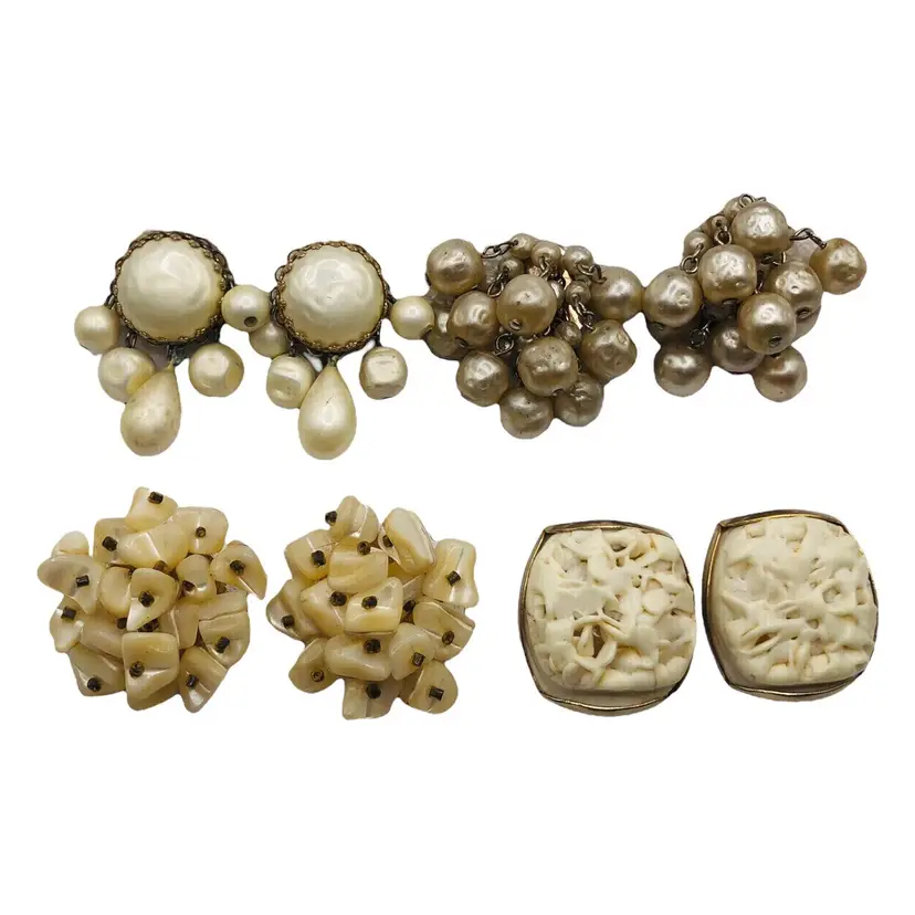 GOLD tone 4 Pair Estate Clip Earrings Chunky Dangle Faux Pearl Gold Tone Lot