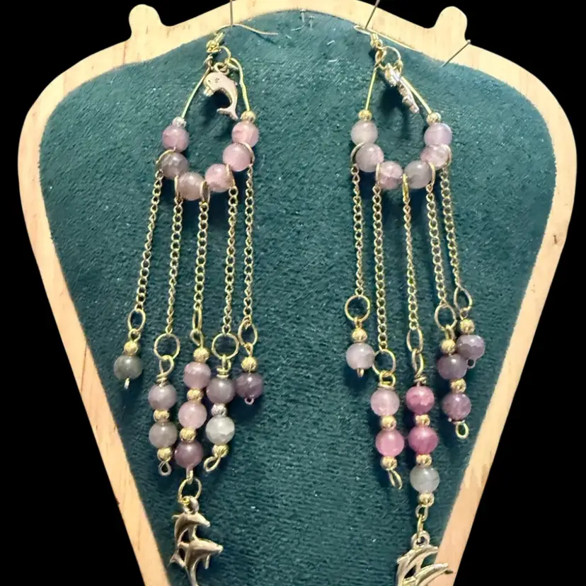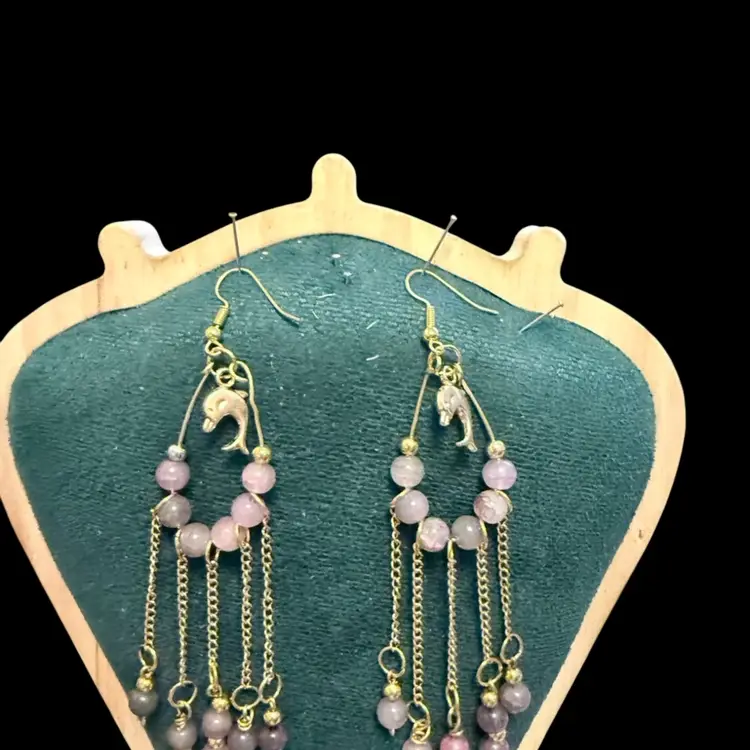 Gold Tone Anti Tarnishing Fluorite Dolphin Dangling Earrings