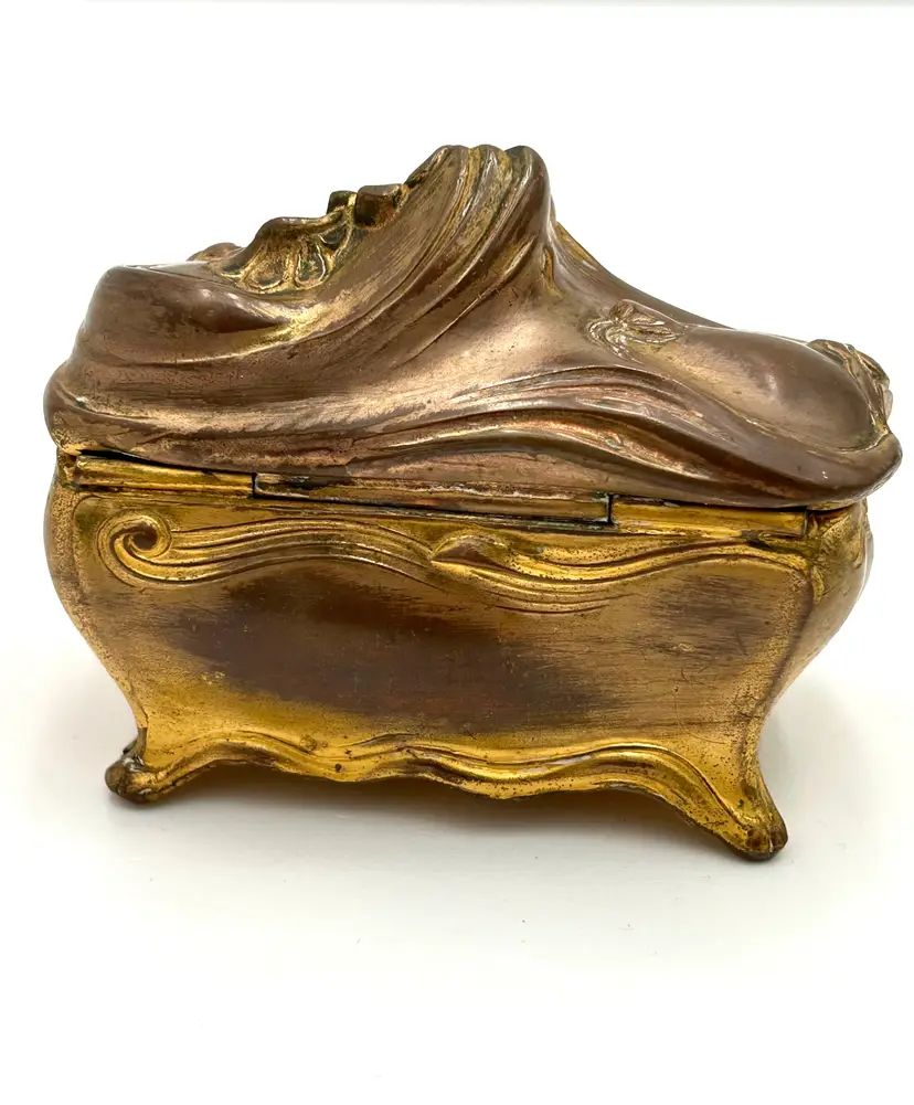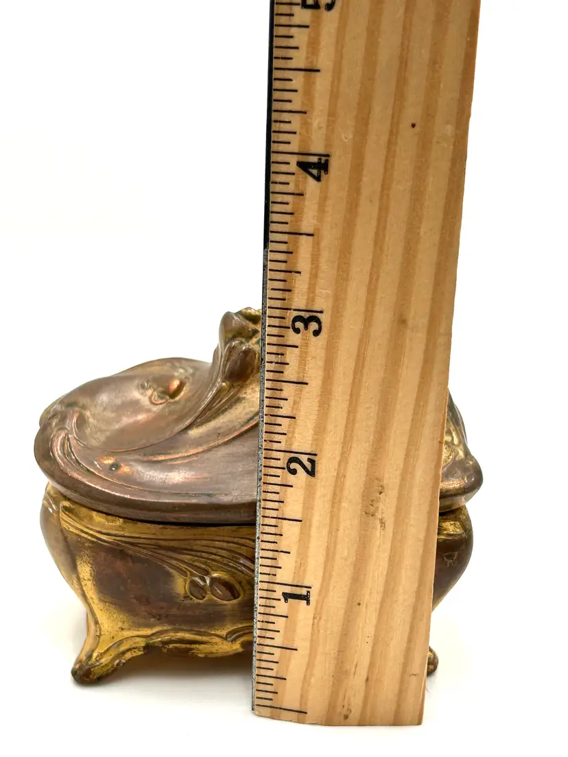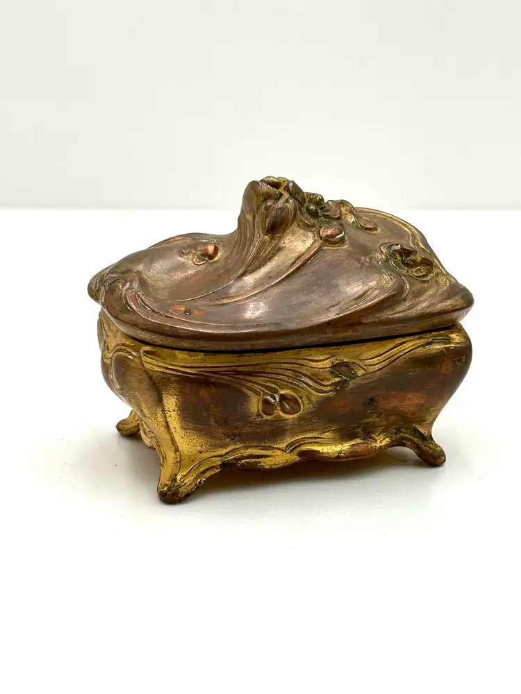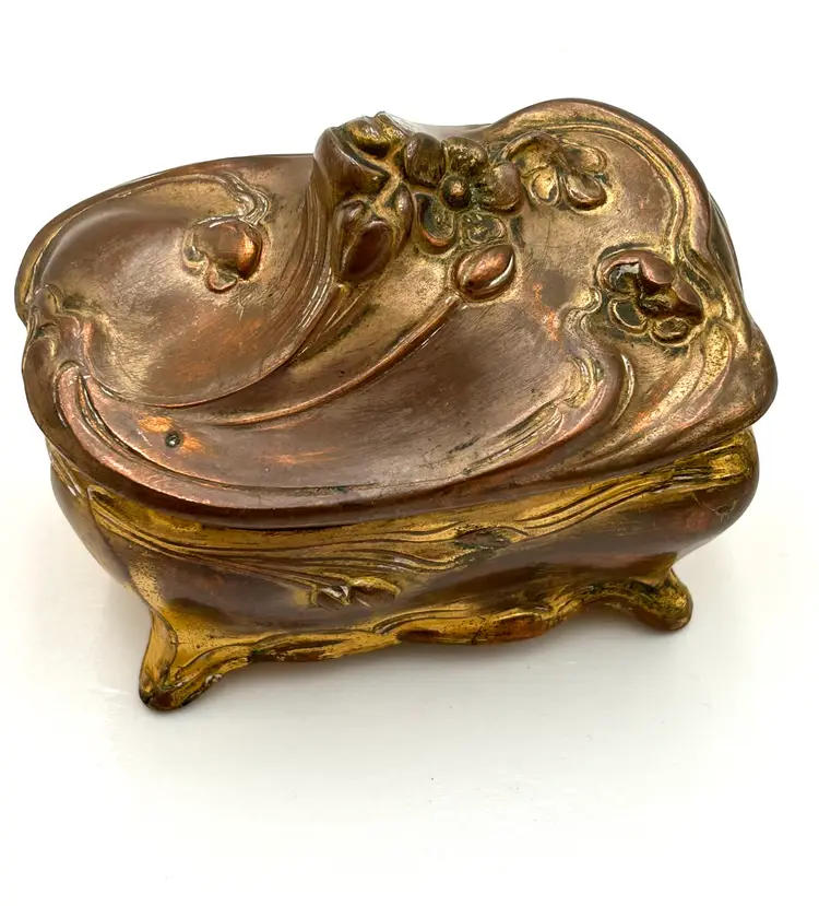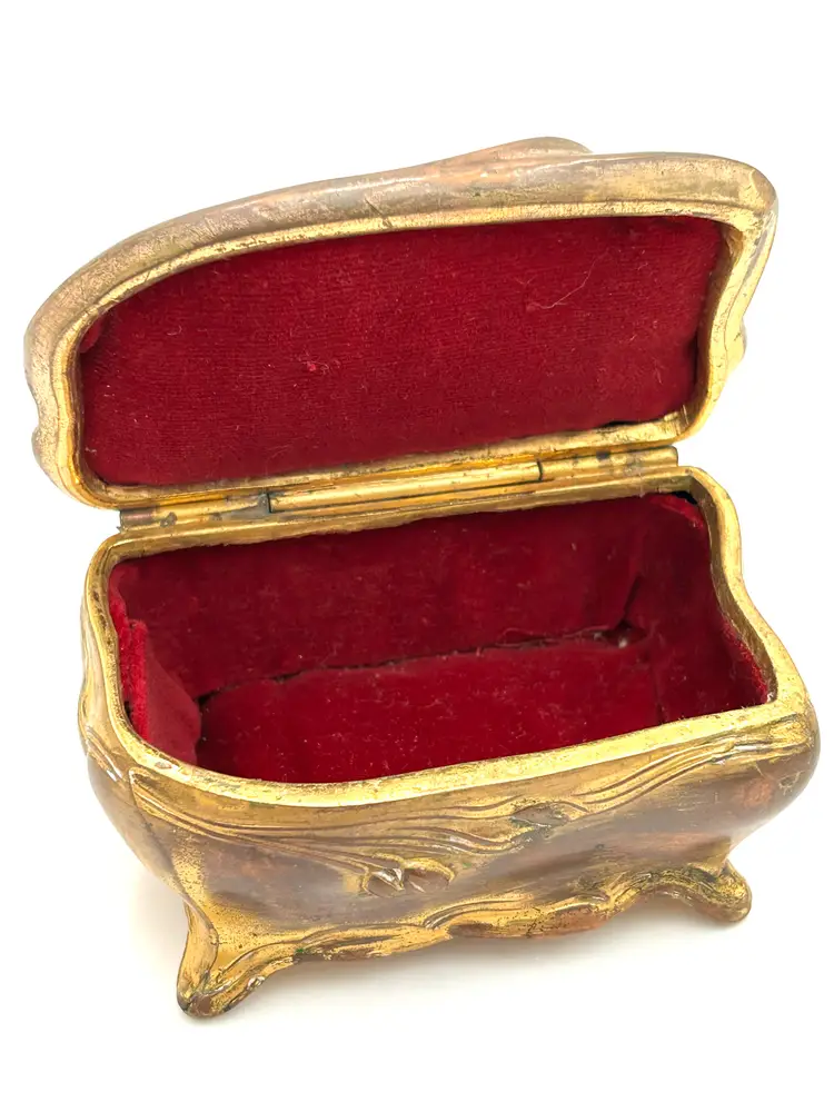 These vintage art nouveau pieces that we were able to find are so pretty and this is the last from our group we had. This is a smaller sized gold tone hinged jewelry casket. It has a beautiful floral design on the top and along the side and is stamped with the number 9090 on the bottom. The inside of the box is lined with a deep red velvety fabric on both the lid and the bottom. It is a smaller size at only 3 inches tall and 3 inches long. Perfect to hold a beautiful ring if you need a fancy box. It is in great condition with just some discoloration to the gold. The interior is in very good condition and the lid hinges work well.