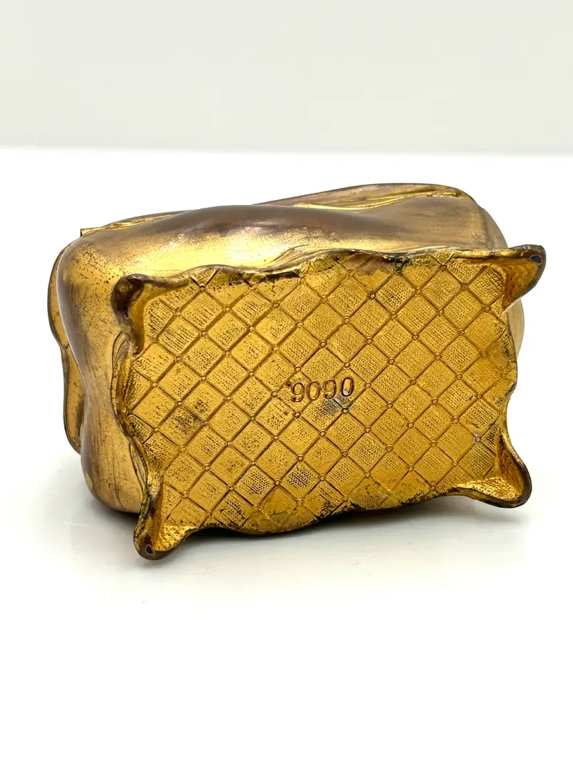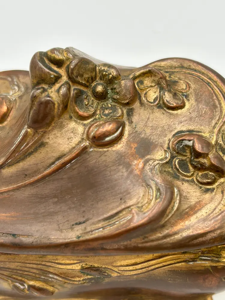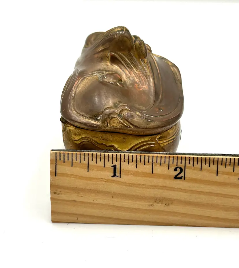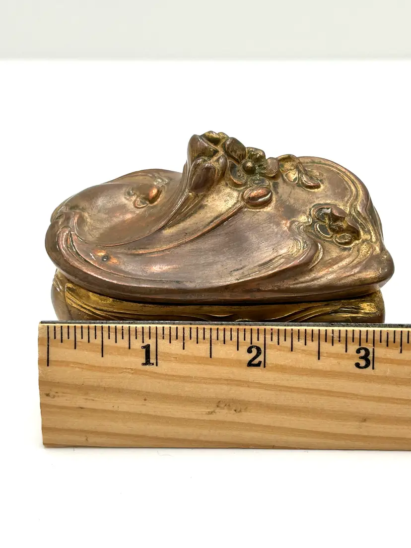 These vintage art nouveau pieces that we were able to find are so pretty and this is the last from our group we had. This is a smaller sized gold tone hinged jewelry casket. It has a beautiful floral design on the top and along the side and is stamped with the number 9090 on the bottom. The inside of the box is lined with a deep red velvety fabric on both the lid and the bottom. It is a smaller size at only 3 inches tall and 3 inches long. Perfect to hold a beautiful ring if you need a fancy box. It is in great condition with just some discoloration to the gold. The interior is in very good condition and the lid hinges work well.