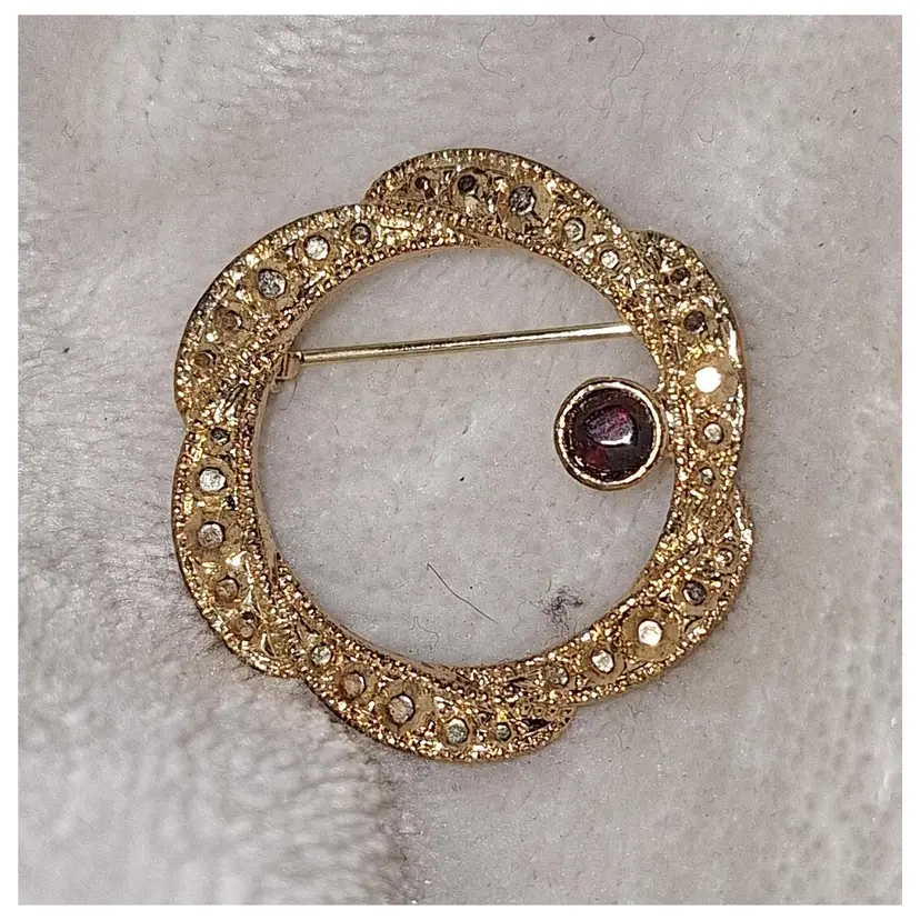 Gold-tone brooch with chocolate colored rhinestone. 2"