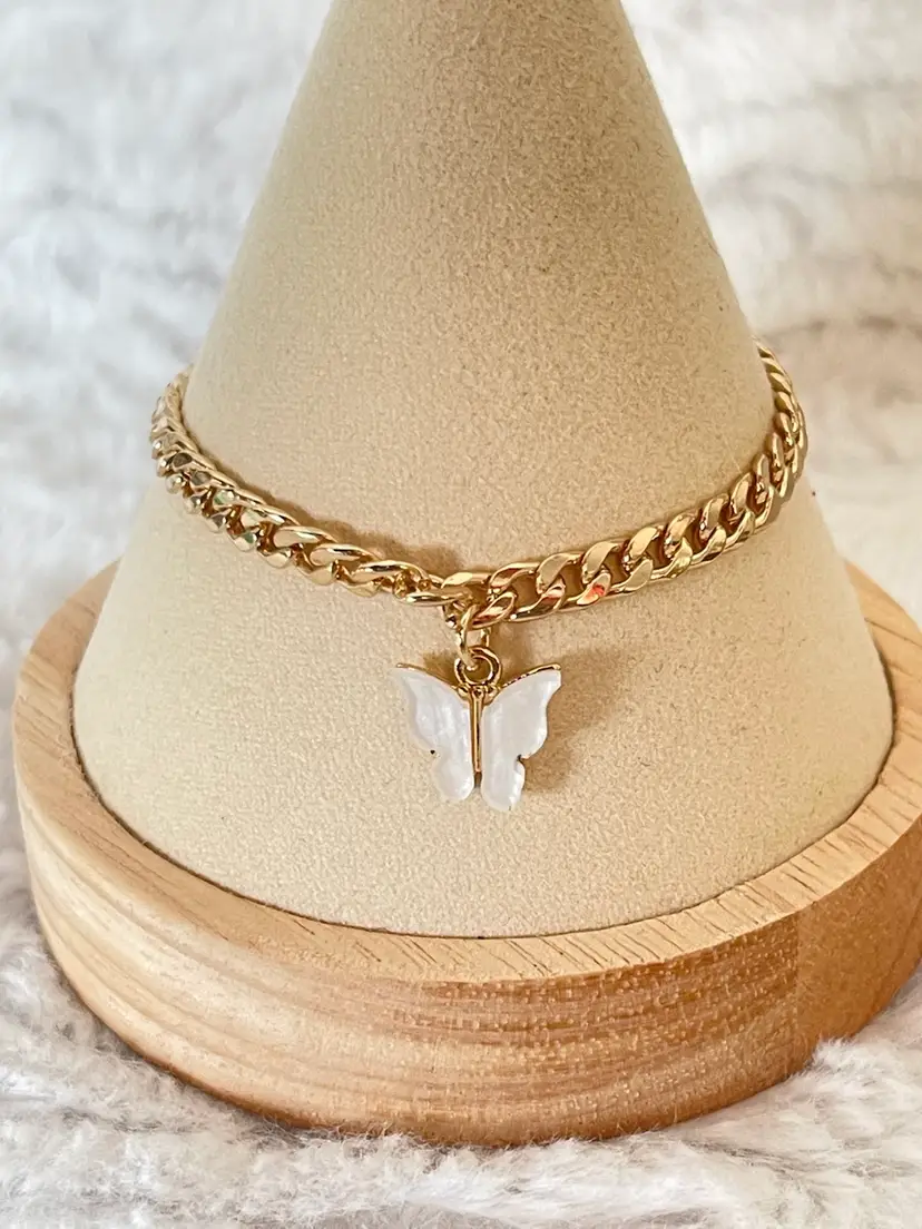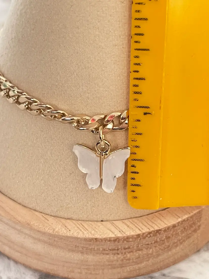 Delicate gold tone chain bracelet features a dainty white butterfly charm. Adjustable fit for 7β8β wrists.