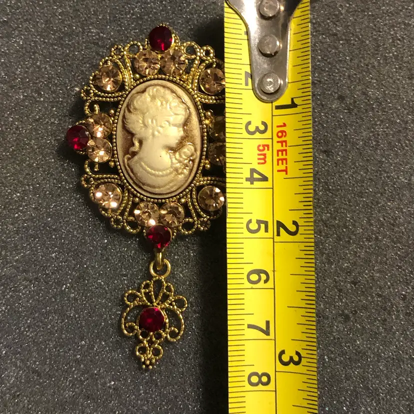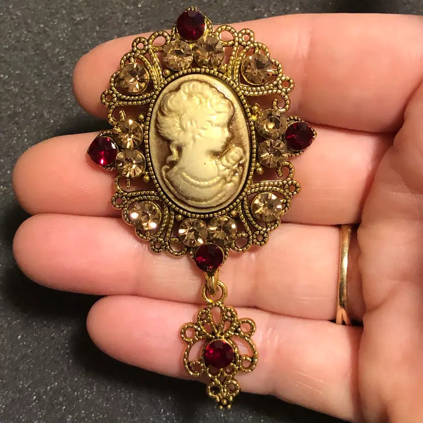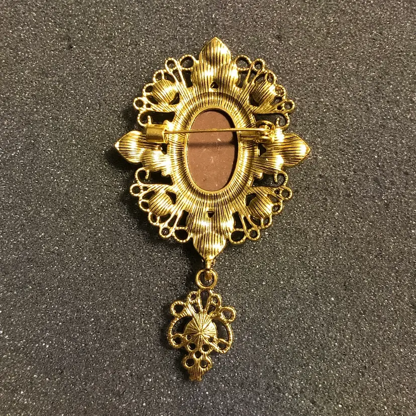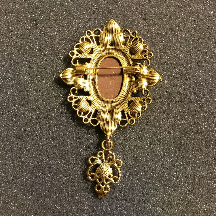 Gold-Tone Cameo with Jewels and Dangle Brooch