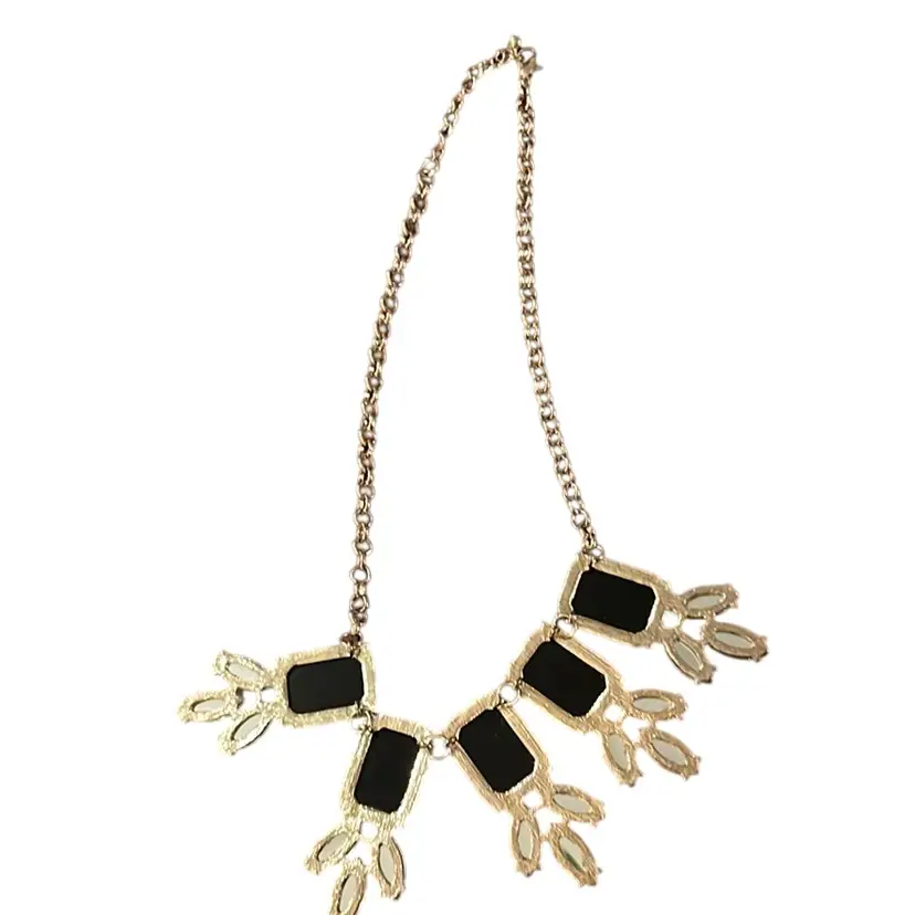 16 inch long necklace with gold tone chain , 5 black faceted rectangle acrylic stones, and clear tear drop shaped rhinestones