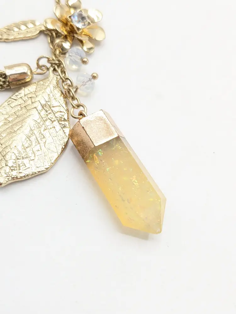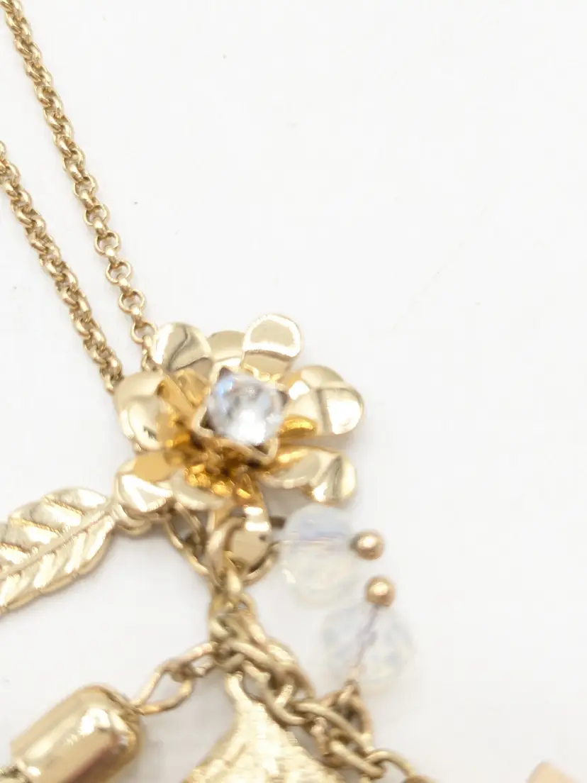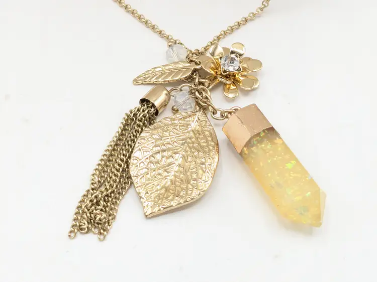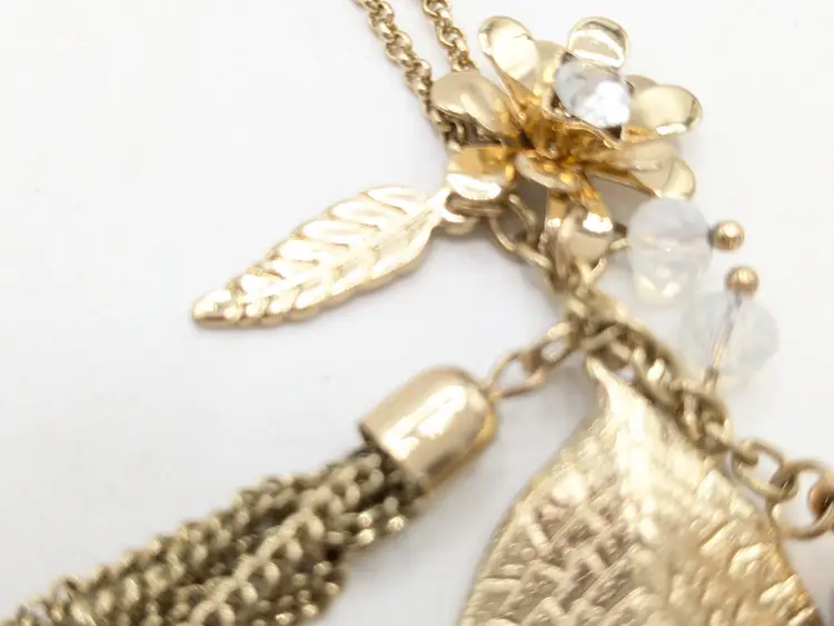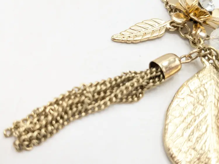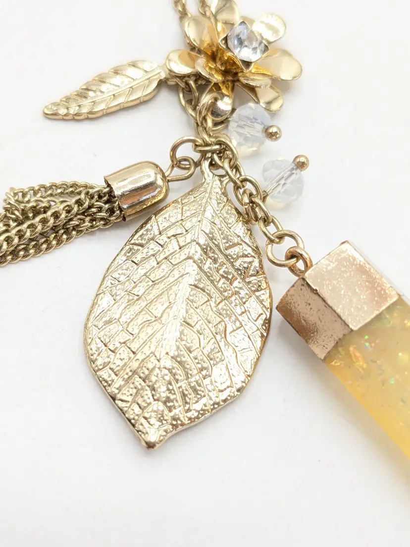 Good condition. Gold tone is bright and shiny with no color loss. Features a yellow crystal, two leaves, flower with crystal and tassel. Chain measures 32" with a 3" extension and charm pendants add another 2 1/2". EN2