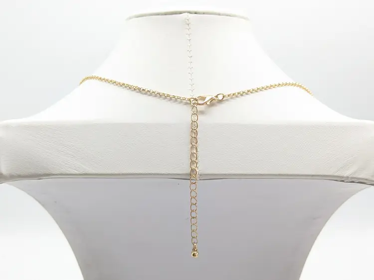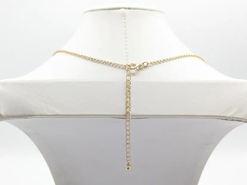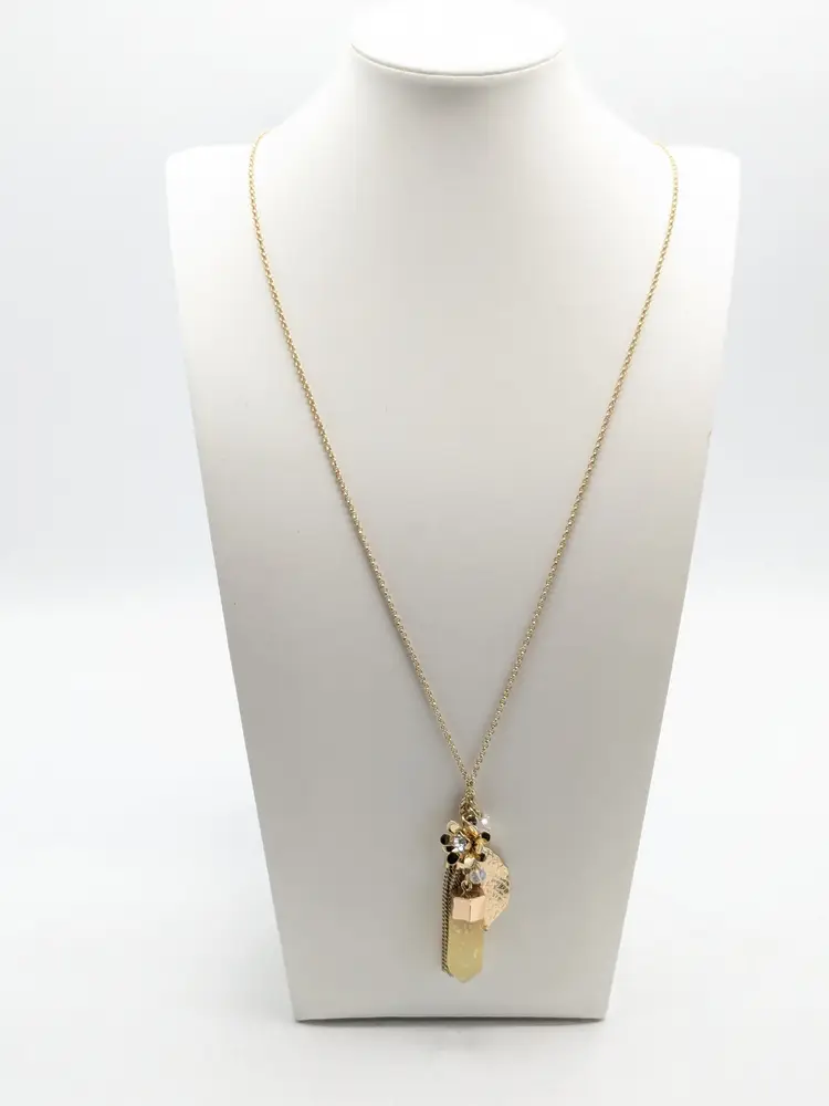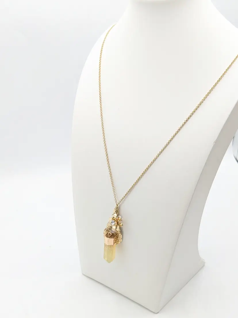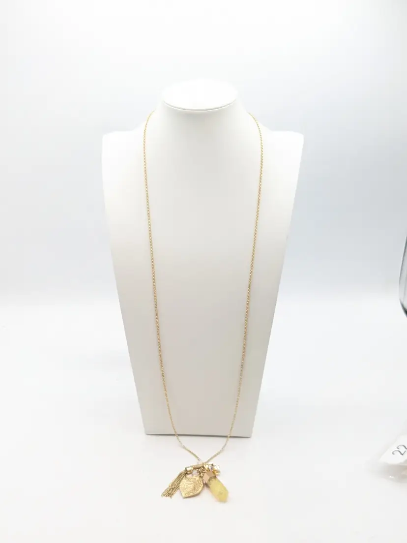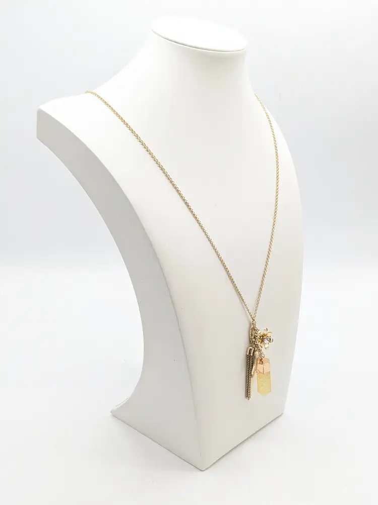 Good condition. Gold tone is bright and shiny with no color loss. Features a yellow crystal, two leaves, flower with crystal and tassel. Chain measures 32" with a 3" extension and charm pendants add another 2 1/2". EN2