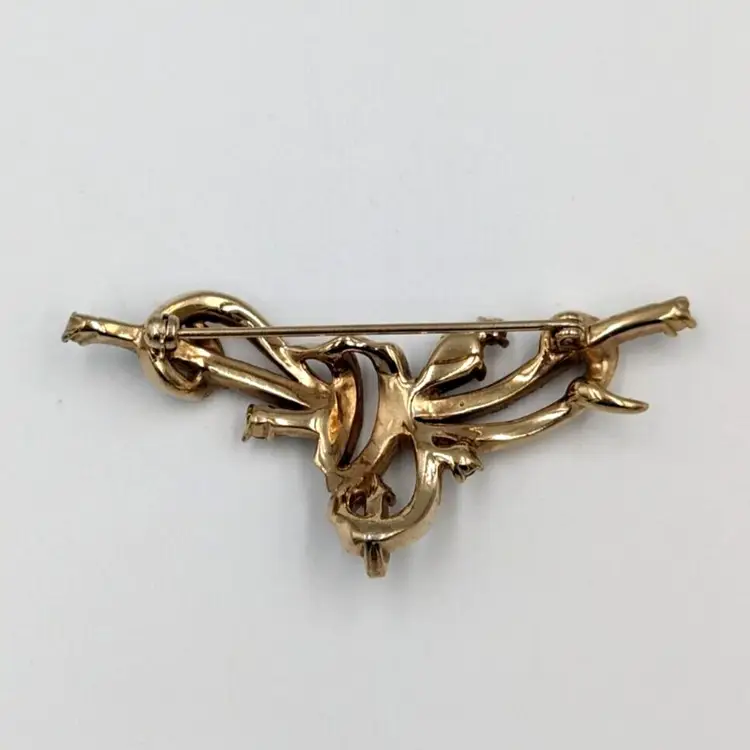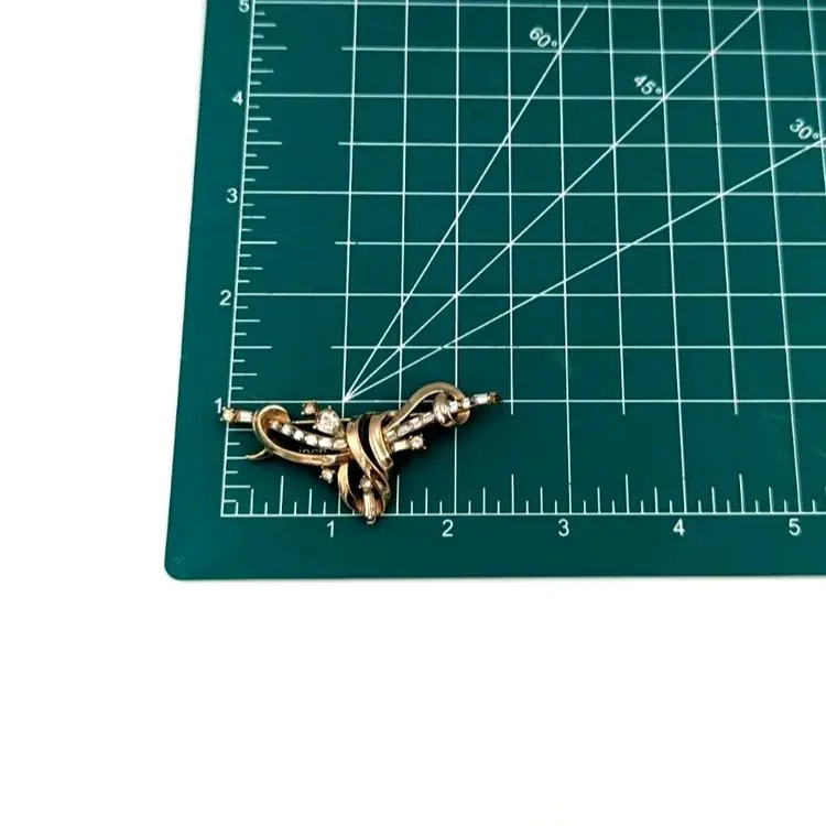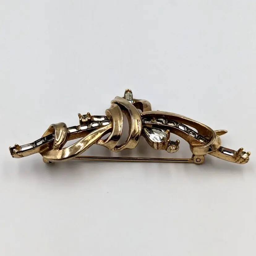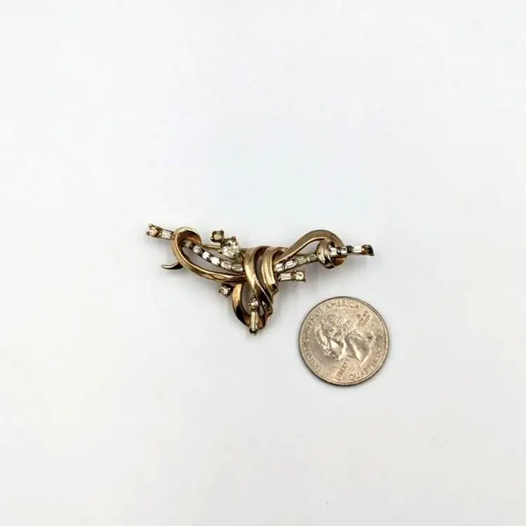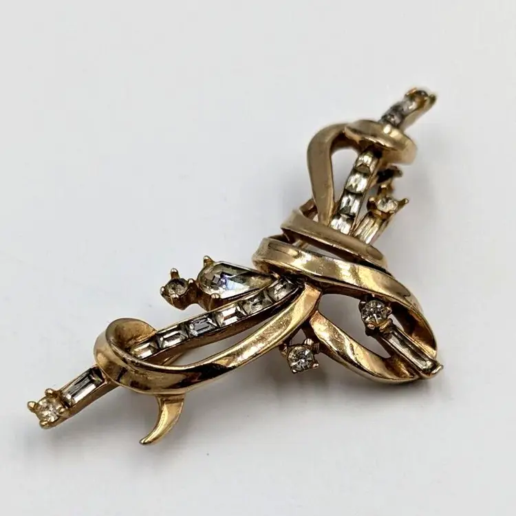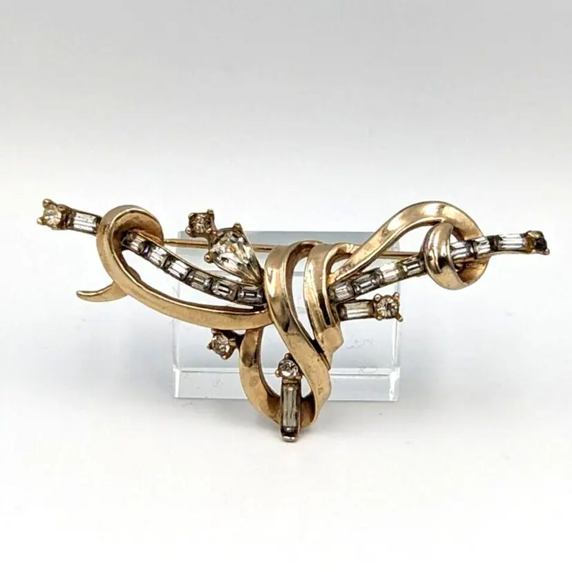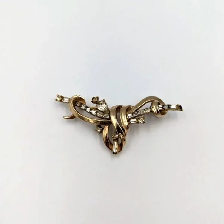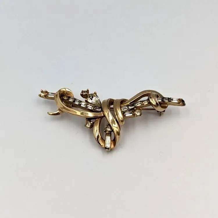 Gold Tone Clear Rhinestone Brooch Vintage Baguette Crystals Unmarked Pin Unbranded, but could be Trifari or Coro 1950-60's, very good quality Measurements 1" x 2.5" Good vintage condition