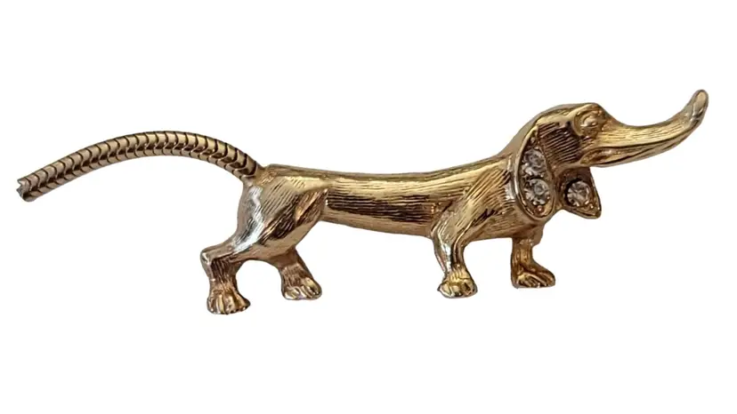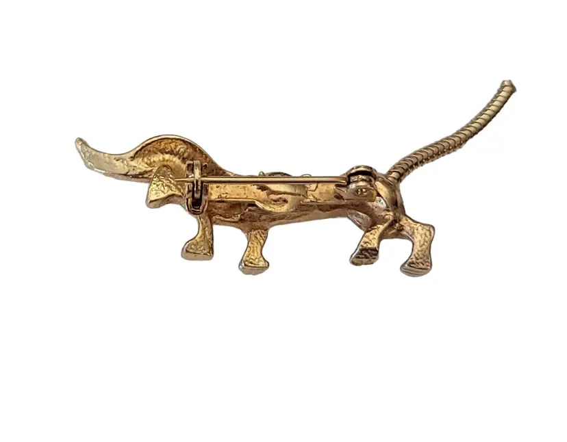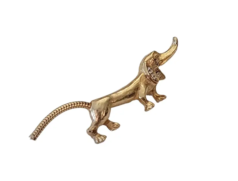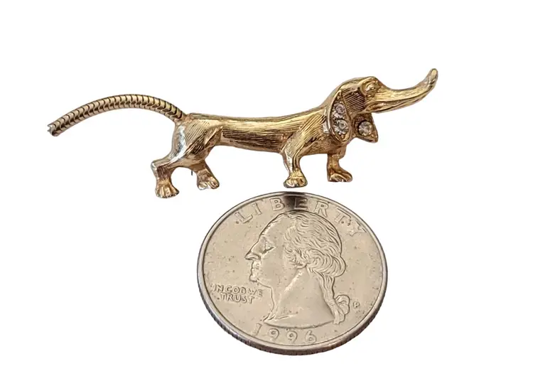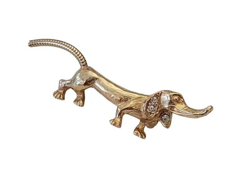 This Gold Tone Weiner Dog Dachshund Brooch Pin will make a thoughtful gift for dog lovers and fashion enthusiasts. A charming and radiant accessory featuring a whimsical dachshund dog in gleaming textured gold tone design accented with three faceted clear rhinestones on its ears and chain link patterned tail. It measures approximately 1.5 inches in width. The back has a secure locking pin that functions properly, ensuring a firm attachment to your clothing or accessories throughout the day. This lovely pin will compliment your dress, or shawls, to work clothes, or wear at parties or on an evening out.