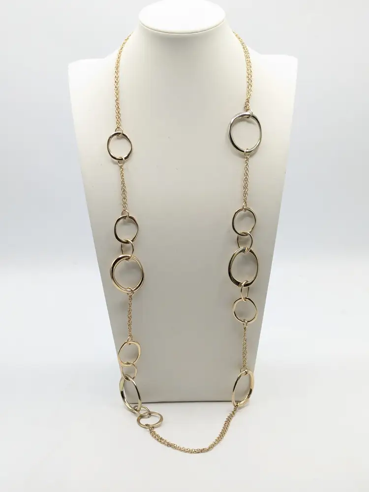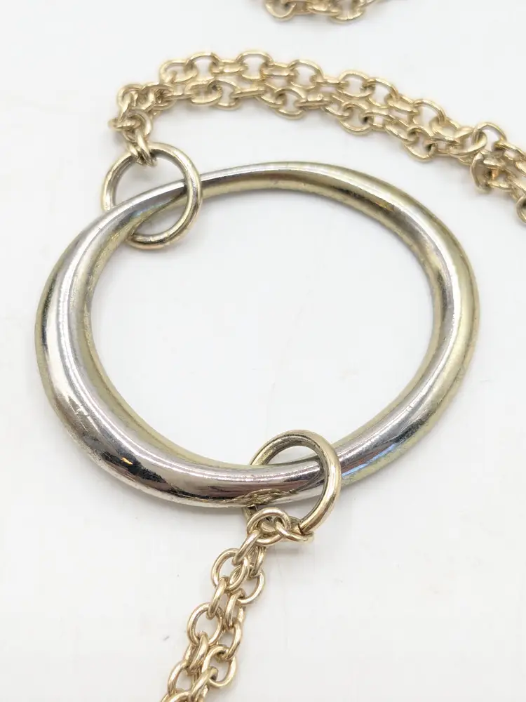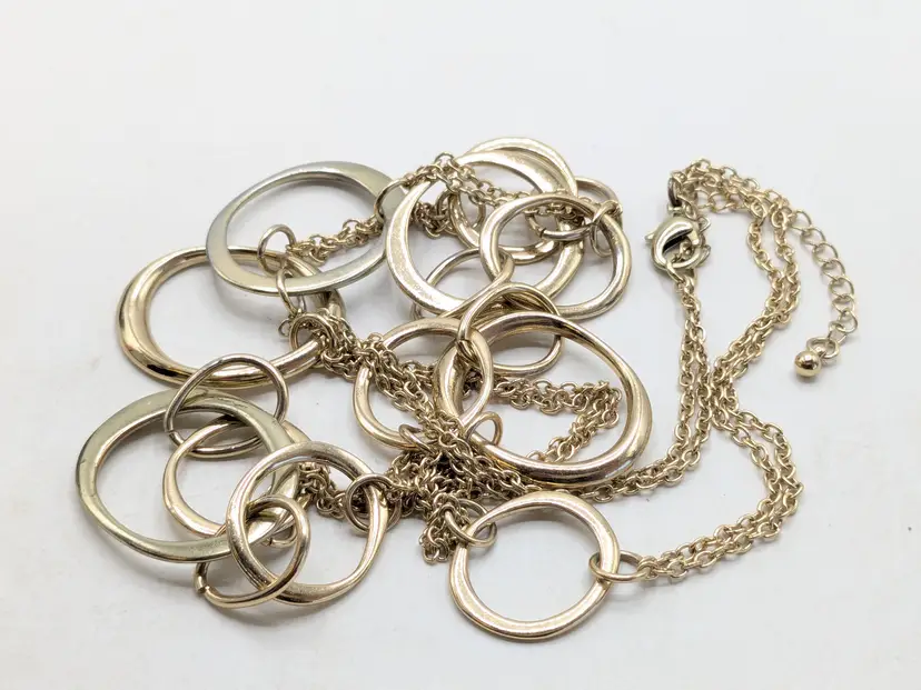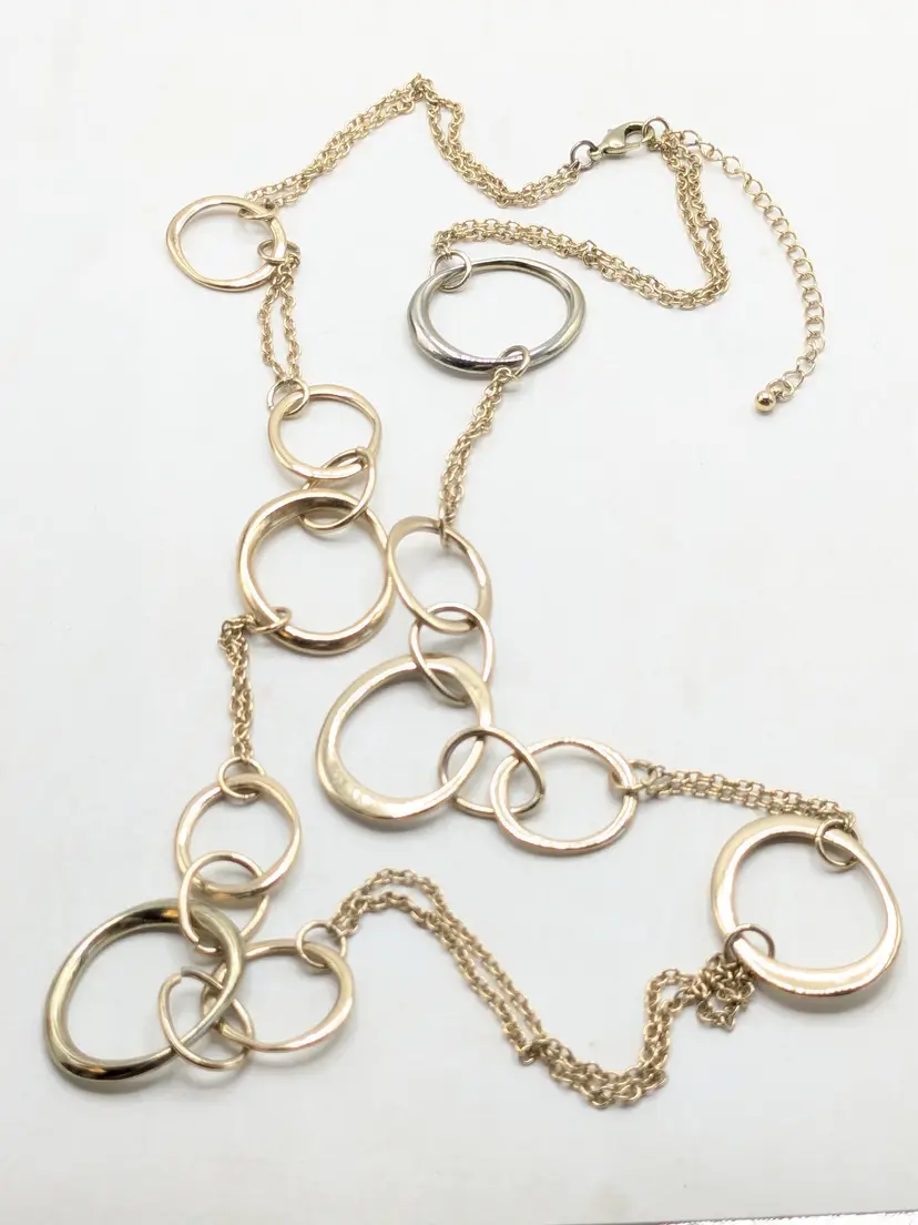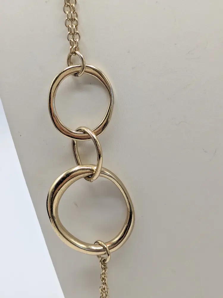 Good condition. Features bold interlocking circle links on a double chain. Gold tone is bright and shiny with no color loss. Measures 32" in length with a 3" extender. wen