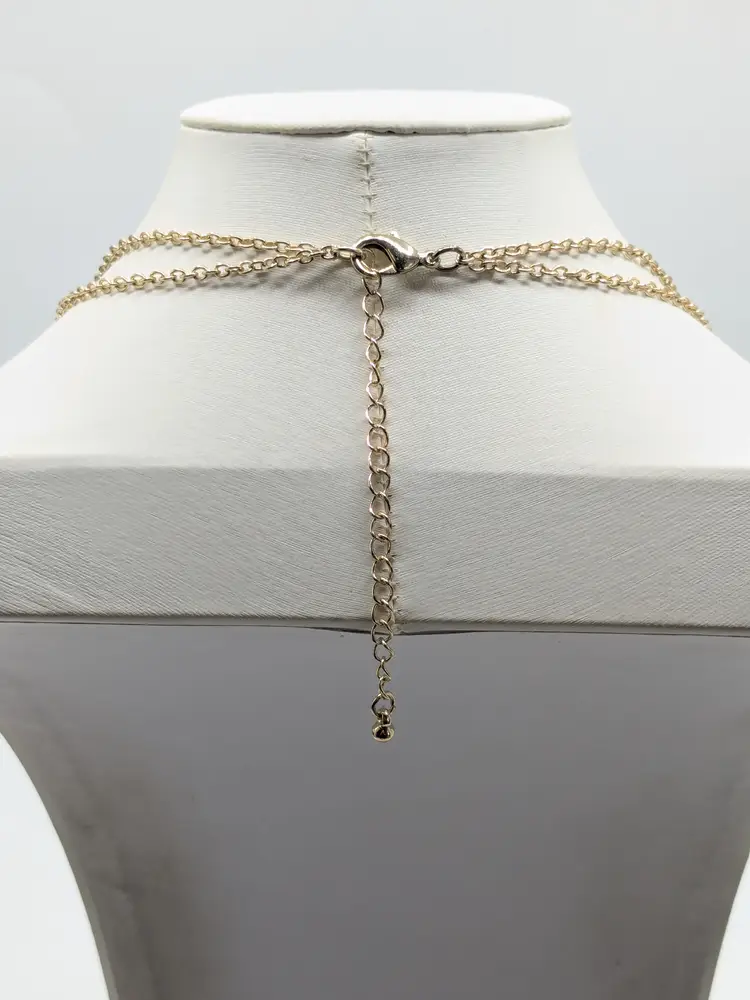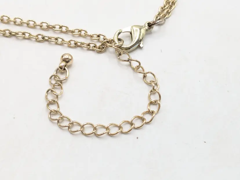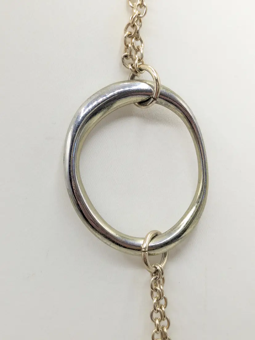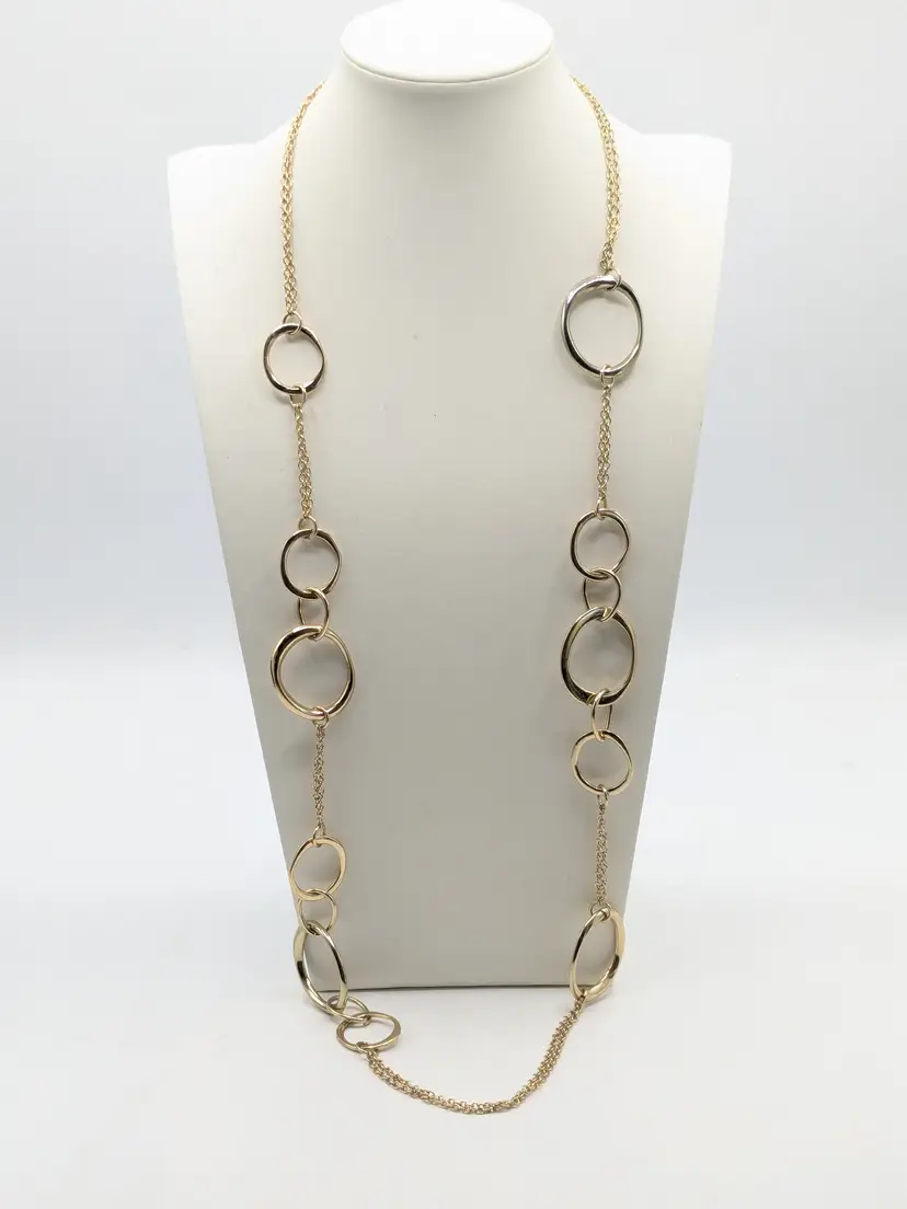 Good condition. Features bold interlocking circle links on a double chain. Gold tone is bright and shiny with no color loss. Measures 32" in length with a 3" extender. wen