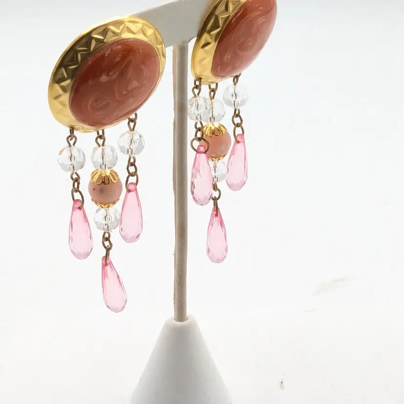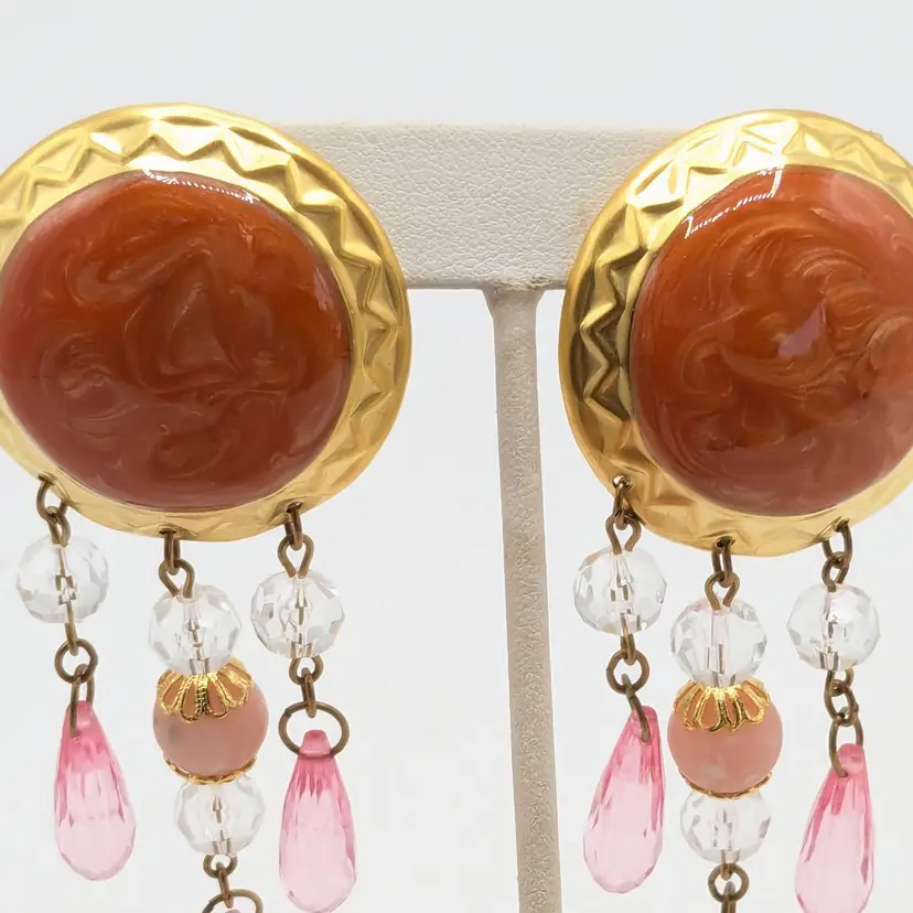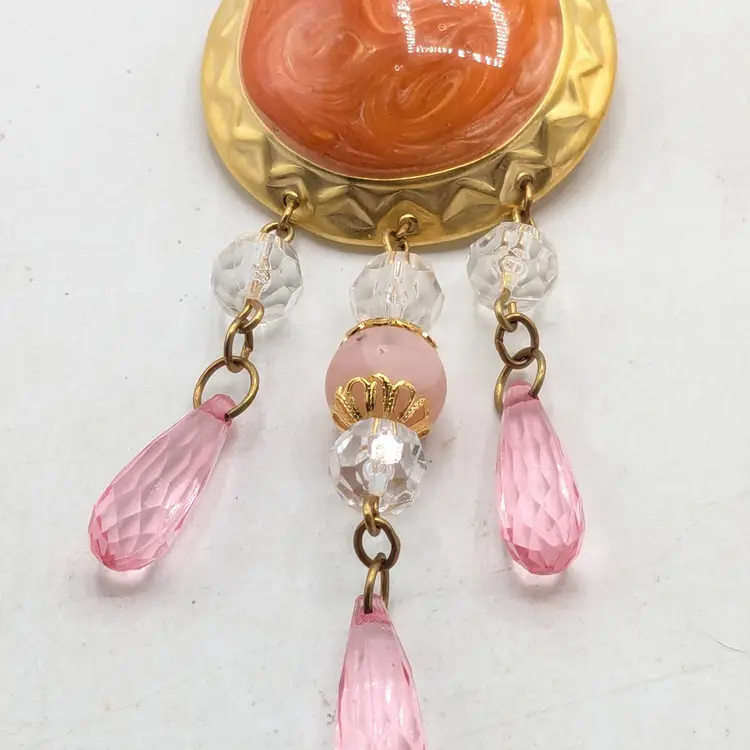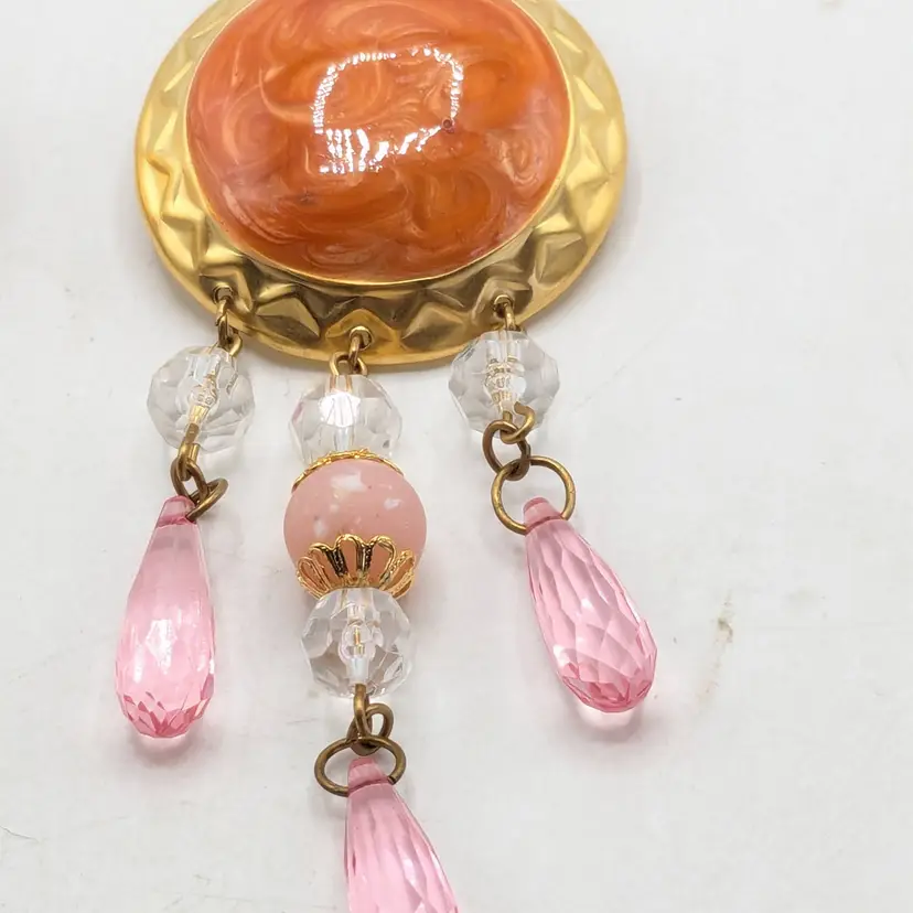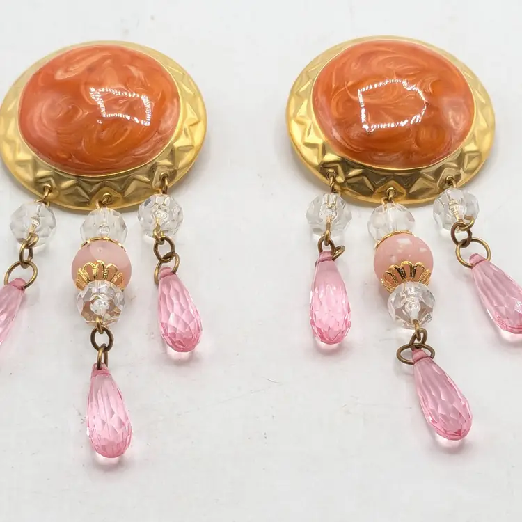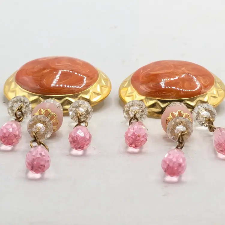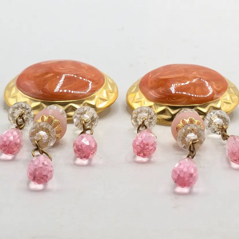 Good condition. Features enameled orange marble-look center with pink and clear beads. The pink and orange make a striking combination. New old stock. Measures 3 3/4" in length and 1 1/2" wide. EN3
