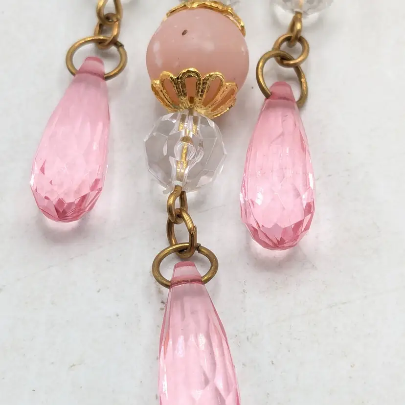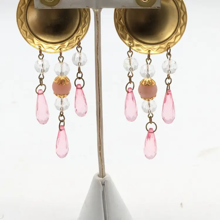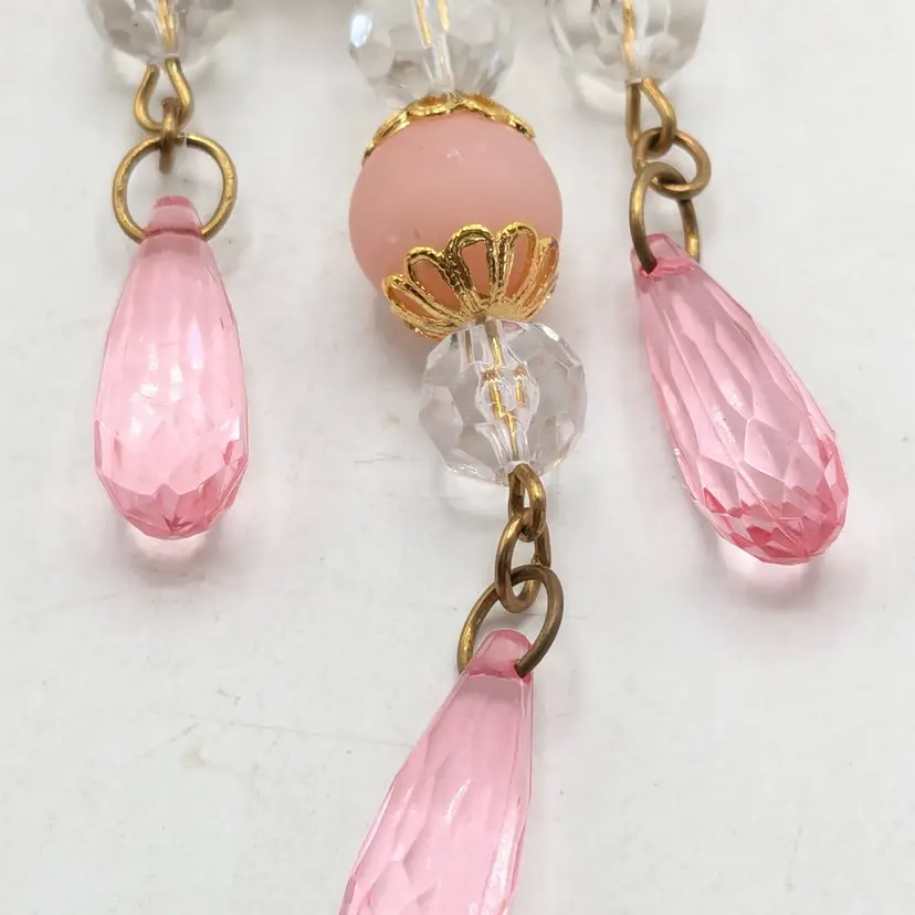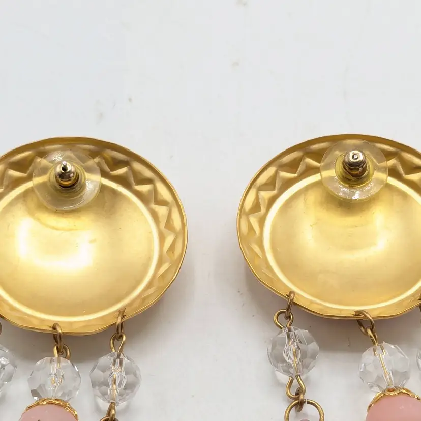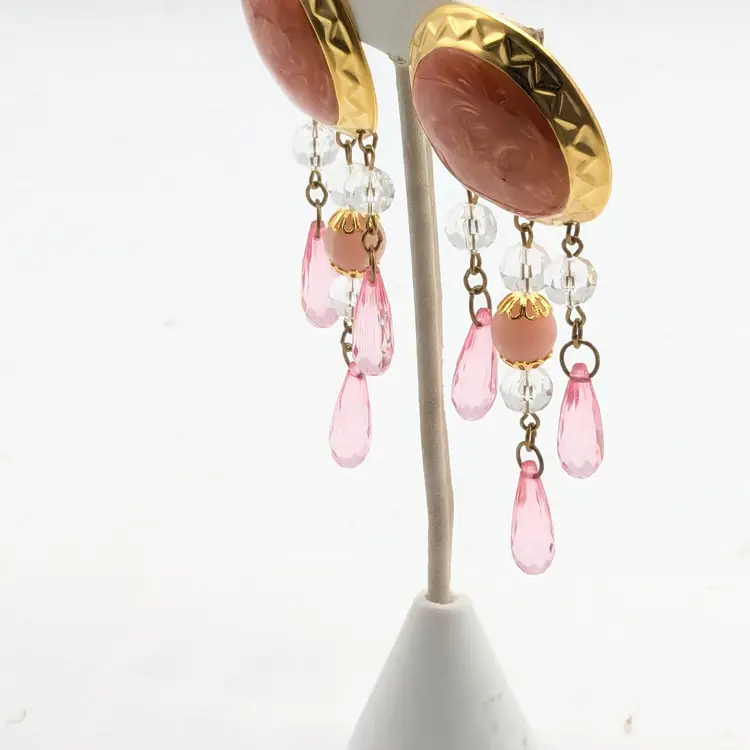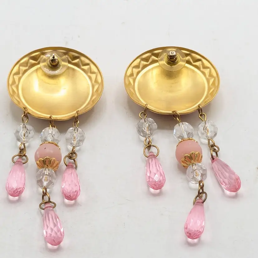 Good condition. Features enameled orange marble-look center with pink and clear beads. The pink and orange make a striking combination. New old stock. Measures 3 3/4" in length and 1 1/2" wide. EN3