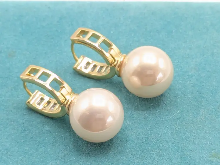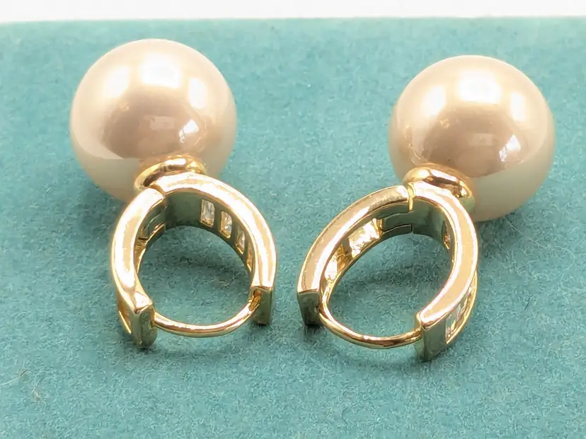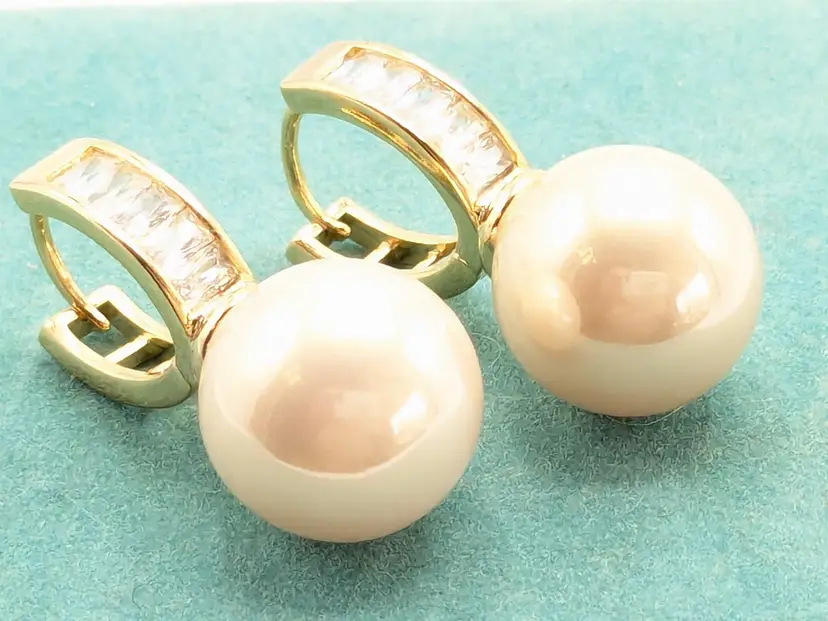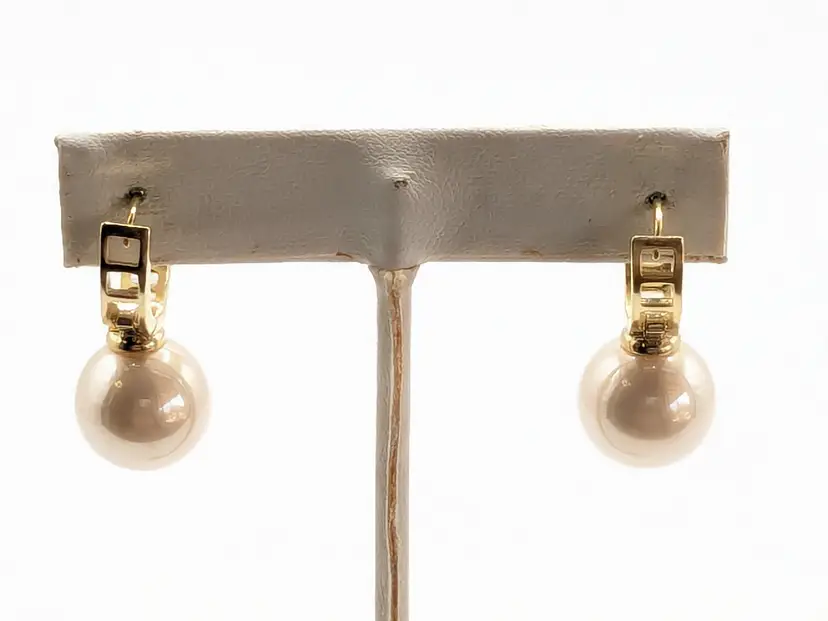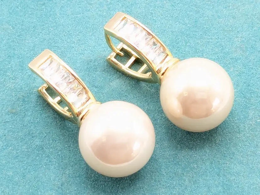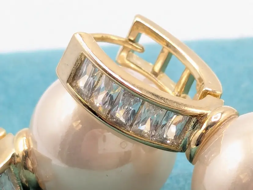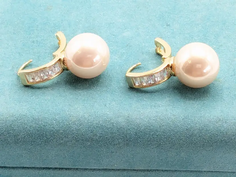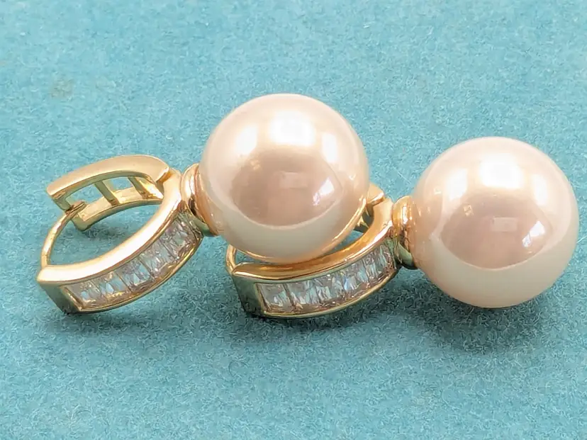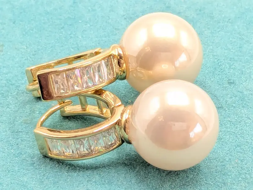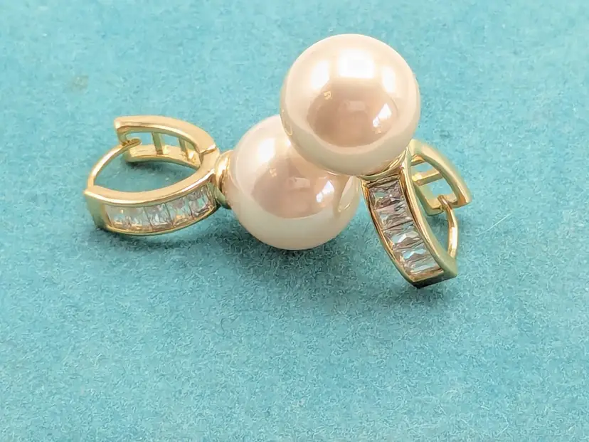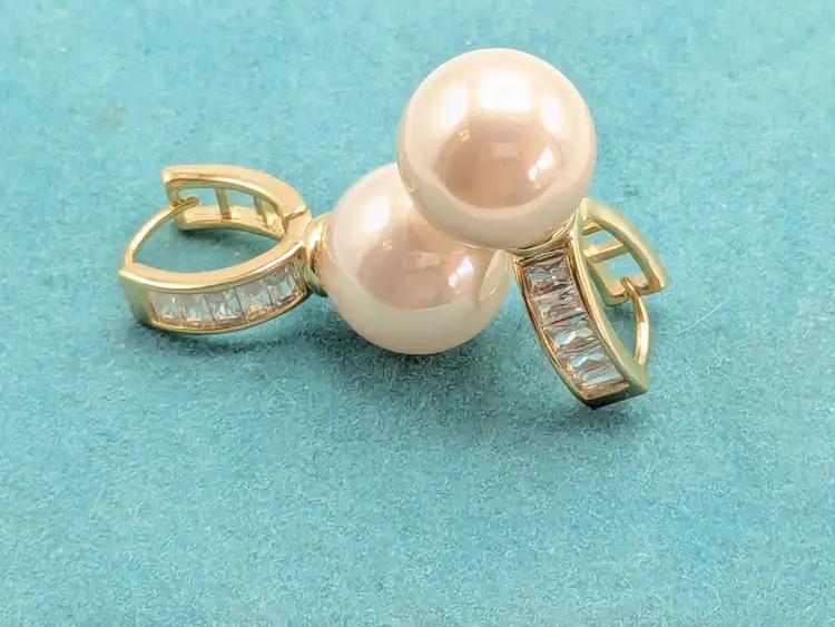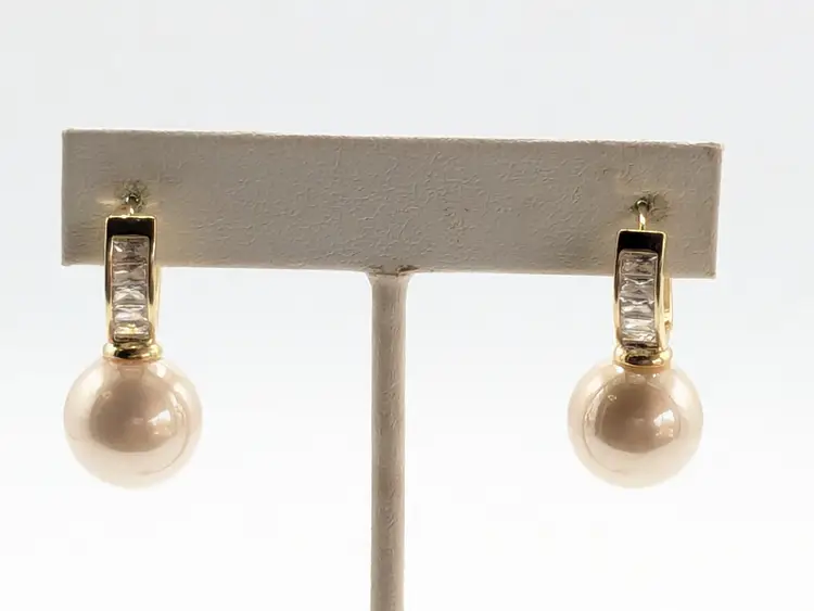 Good condition. Gold tone is bright and shiny with no color loss. Rhinestones are all present and sparkly. Pierced huggie earrings. Measure 1 1/8" in length. Large faux pearl is 1/2" in diameter. EN3