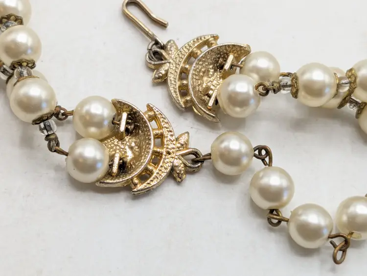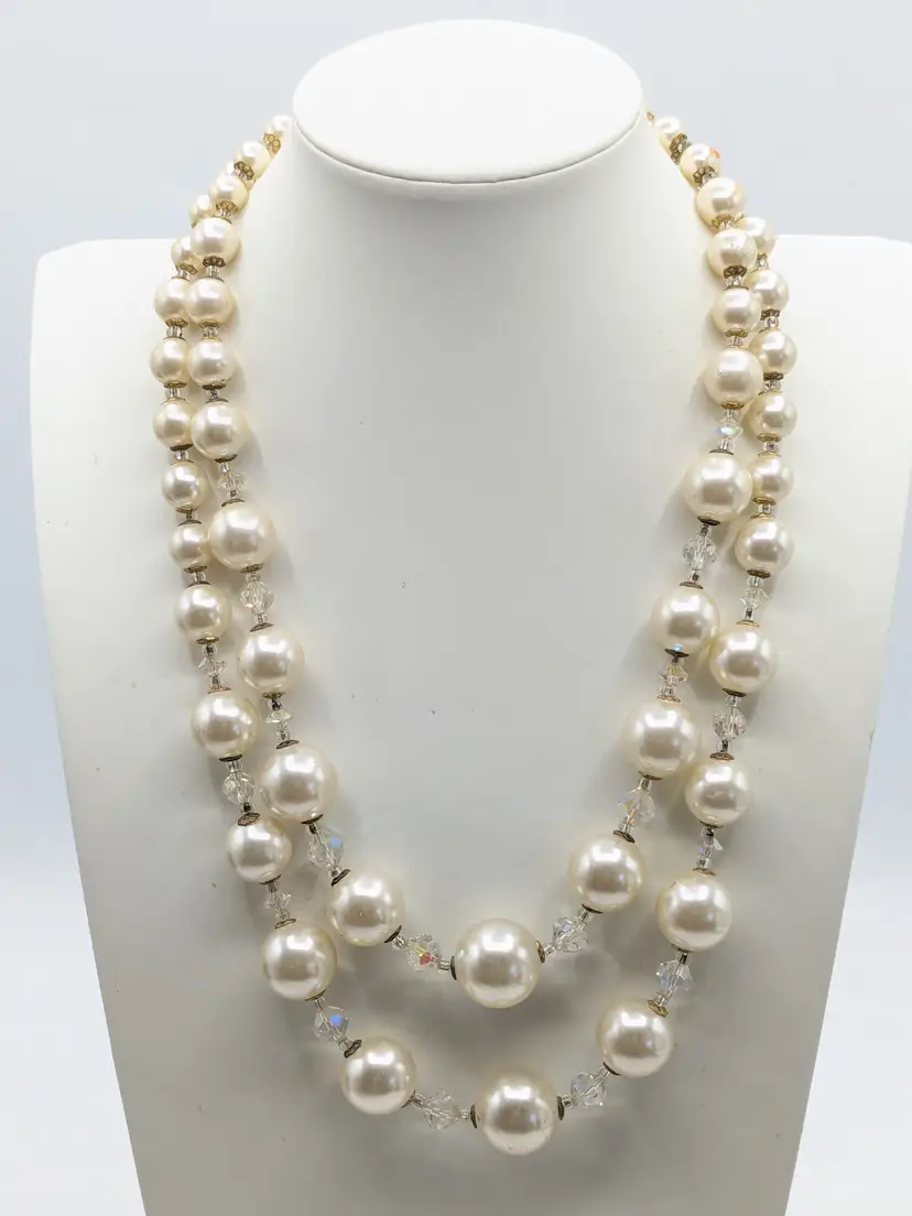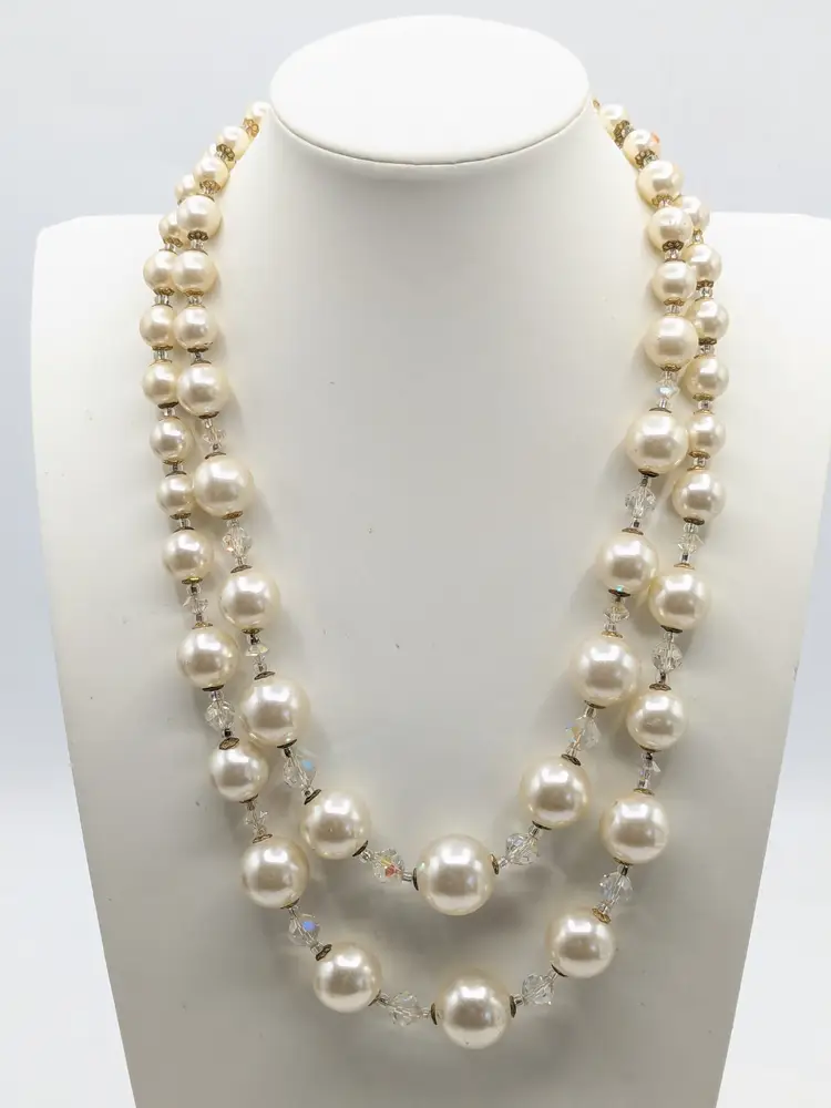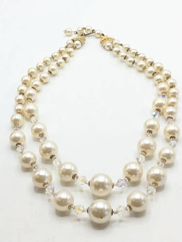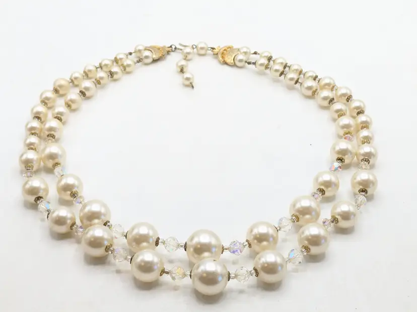 Good condition. This stunning double strand necklace features lustrous faux pearls and elegant glass crystal accents. Gold tone is bright and shiny with no color loss. Shepherd hook closure. Measures 18" and 22" in length. wen