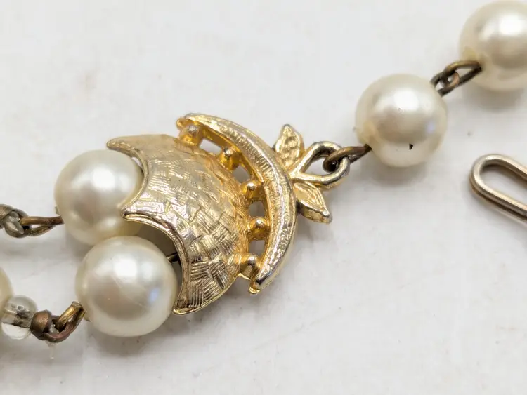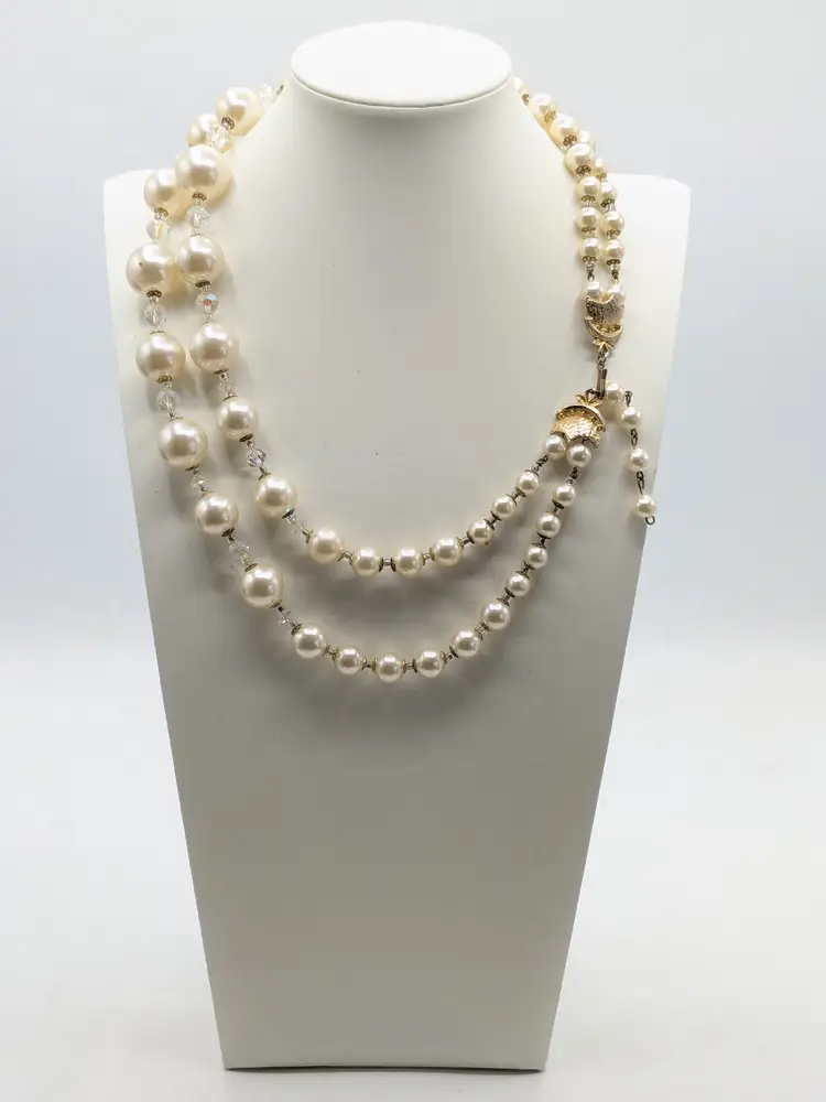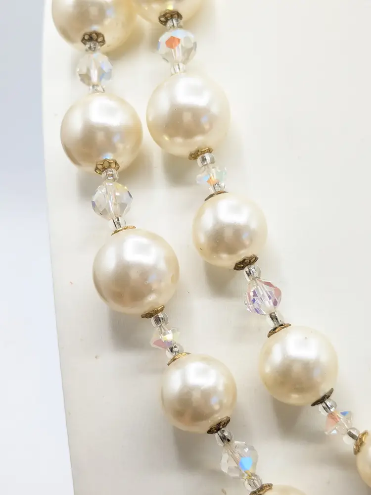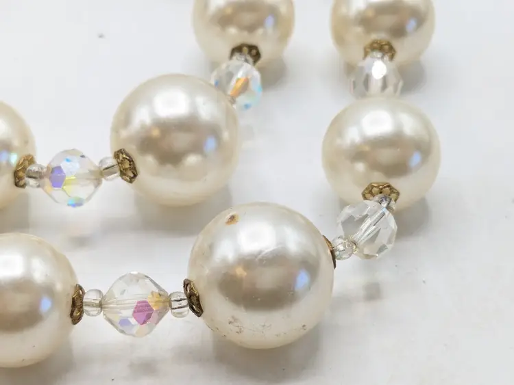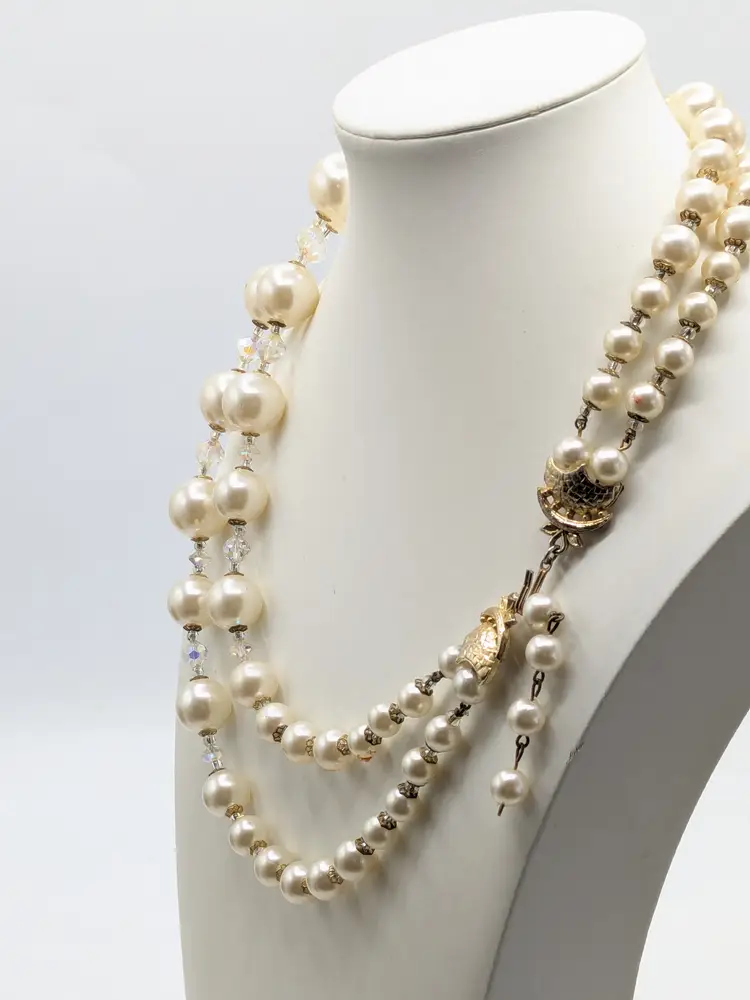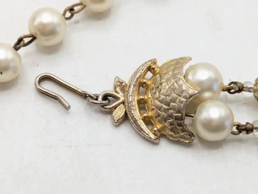 Good condition. This stunning double strand necklace features lustrous faux pearls and elegant glass crystal accents. Gold tone is bright and shiny with no color loss. Shepherd hook closure. Measures 18" and 22" in length. wen
