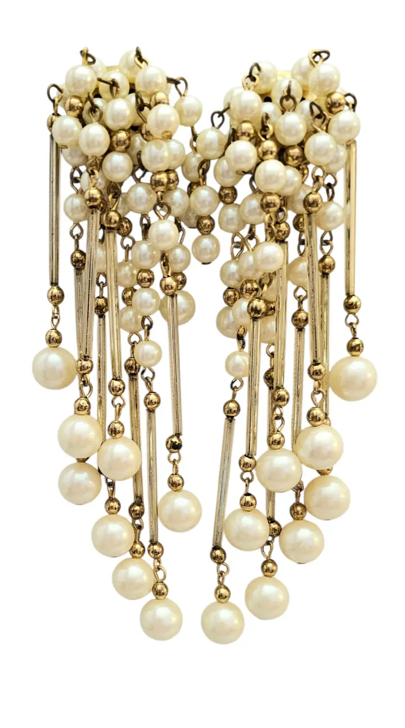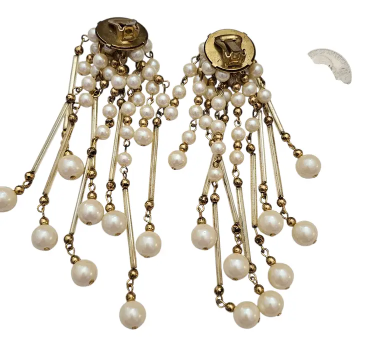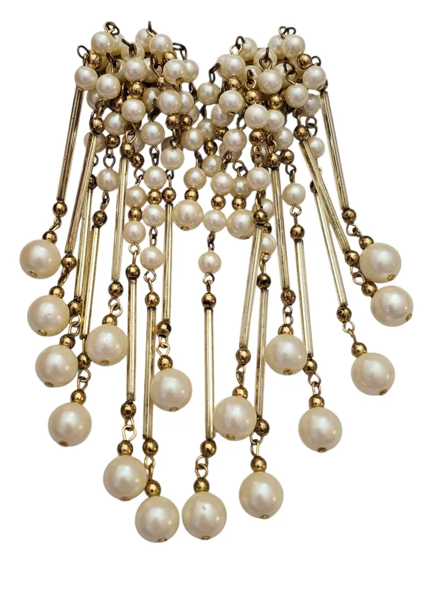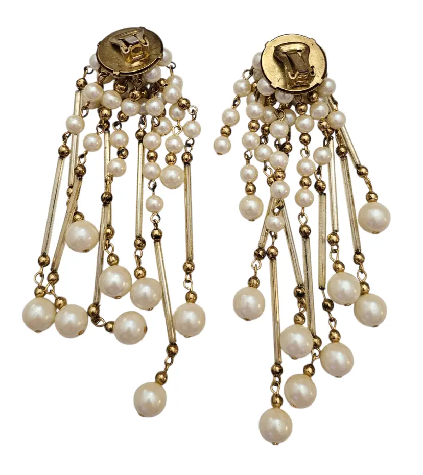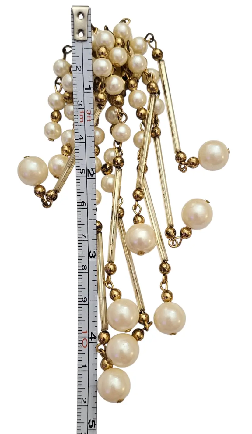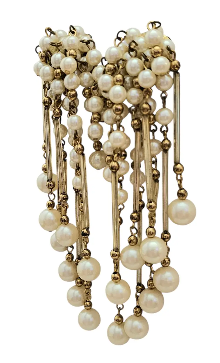 • Gold Tone Faux Pearl Glass Tube Shoulder Duster Clip On Earrings • Shoulder duster earrings, extending from the earlobe down to or past the shoulder • Gold tone base metal • Polished finish • Stunning cascading dangles • Glass tube dangling components • Lustrous faux pearls • White faux pearls in varying sizes • Gold tone bead chain dangling spacers • Each earring measures 5 inches long • Good condition • C82