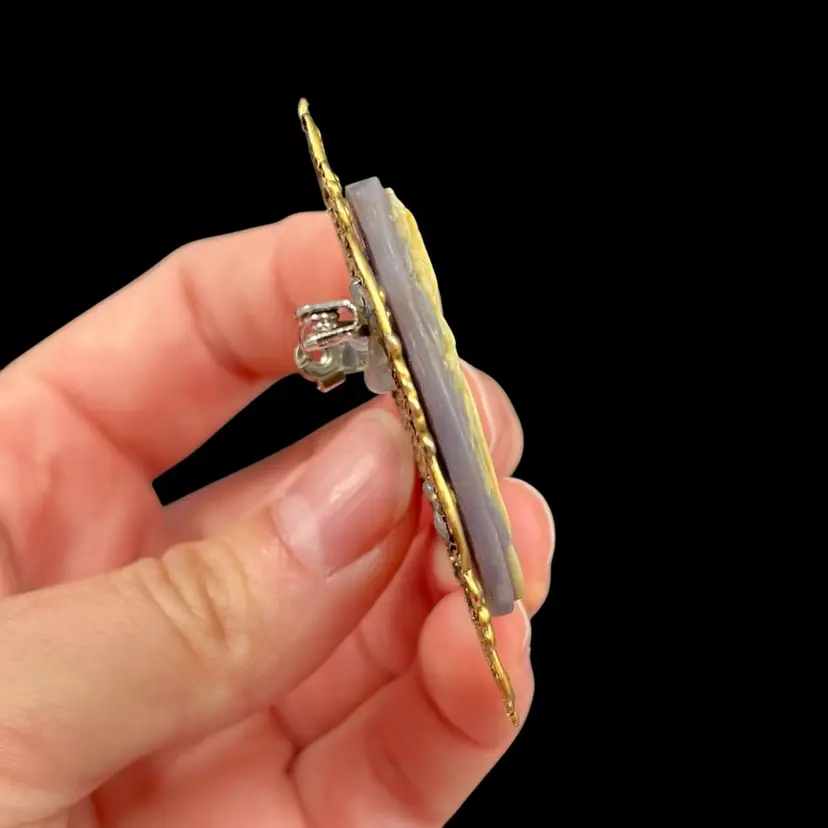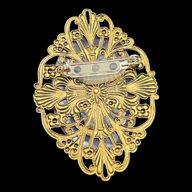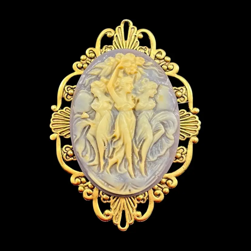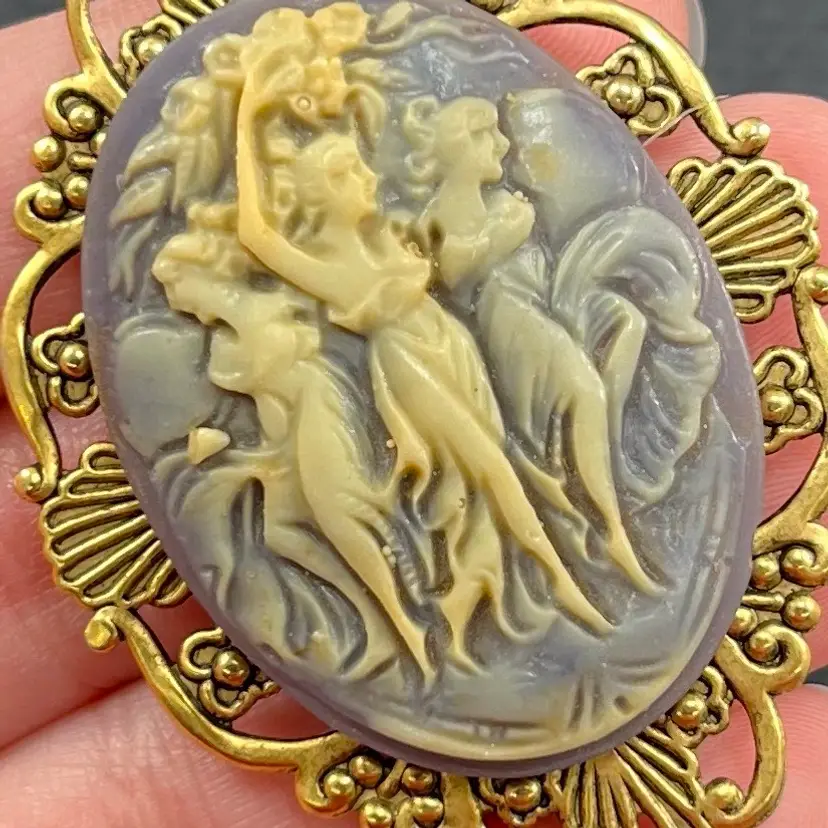 Approximately 2.25” x just over 1.5”. Good vintage condition. I believe cameos to be resin or some sort of plastic.