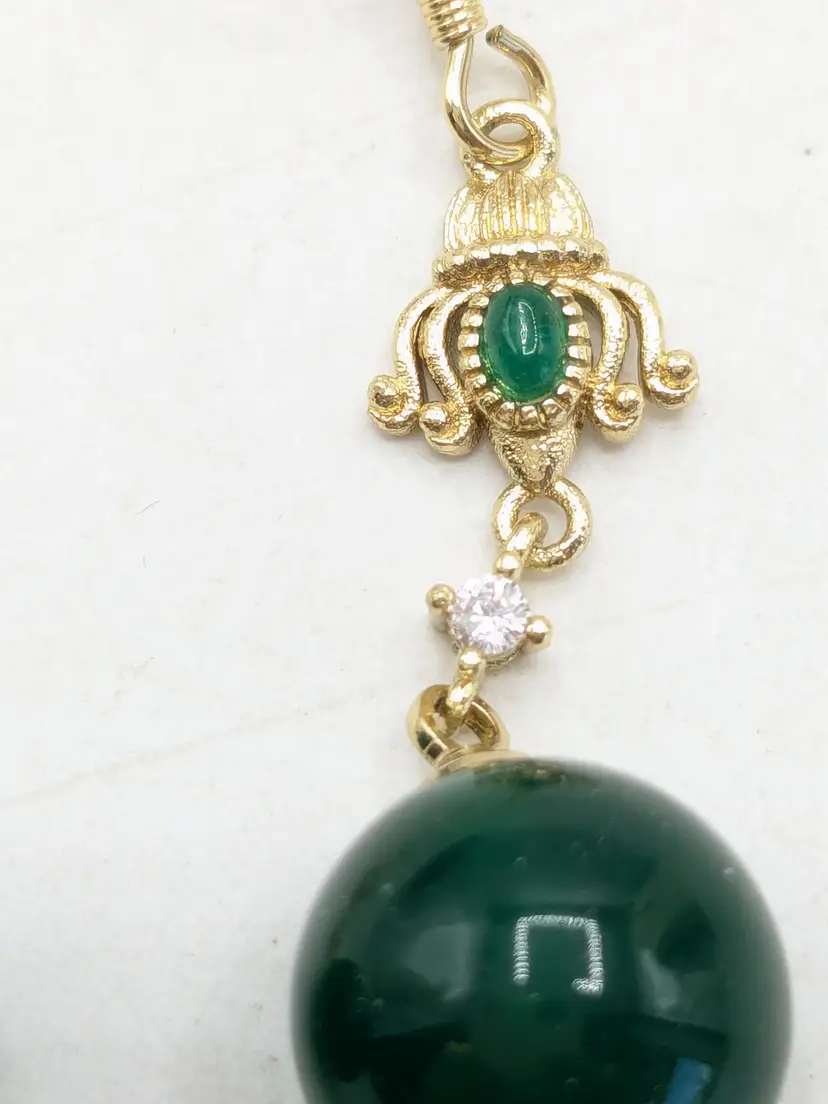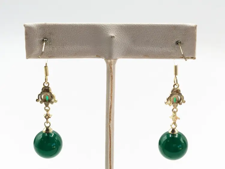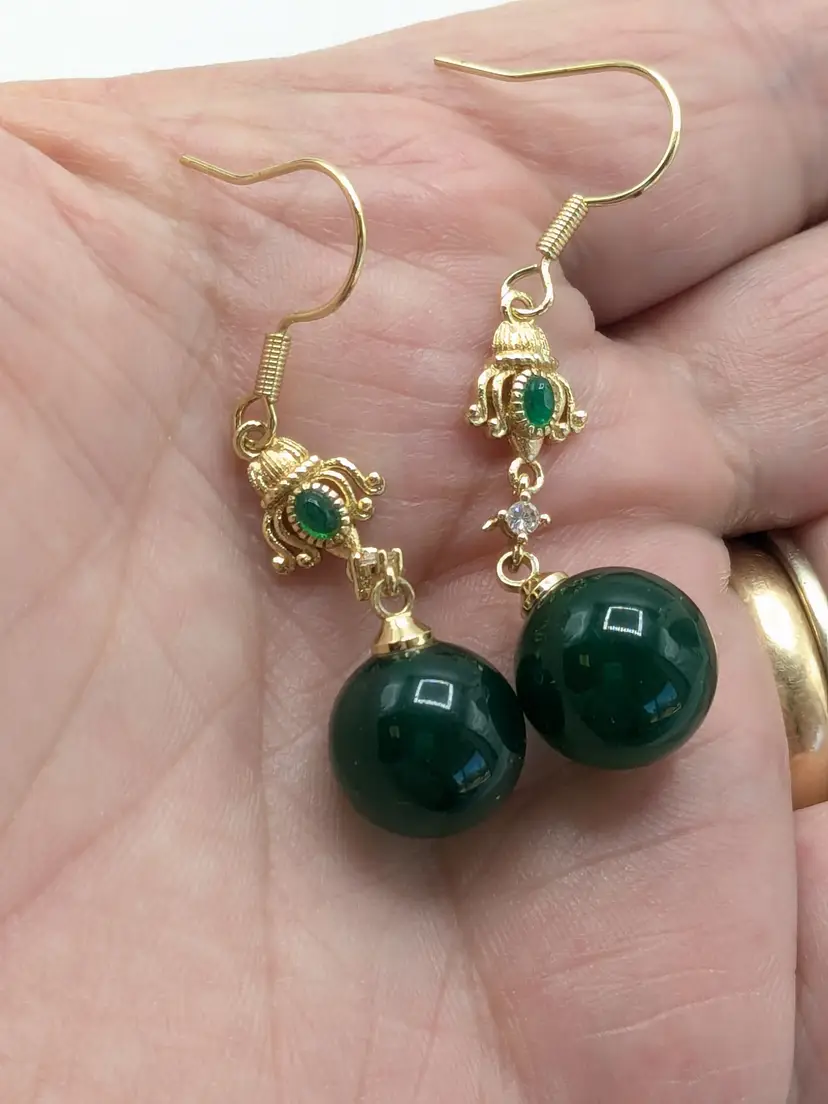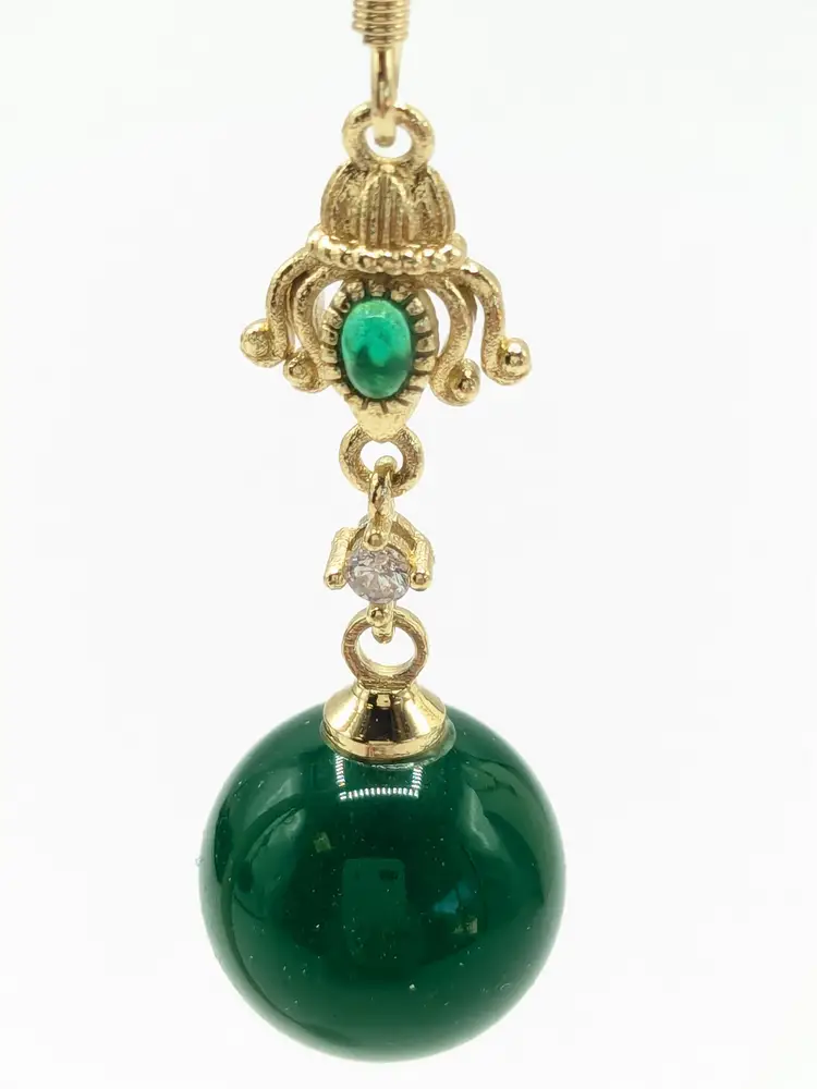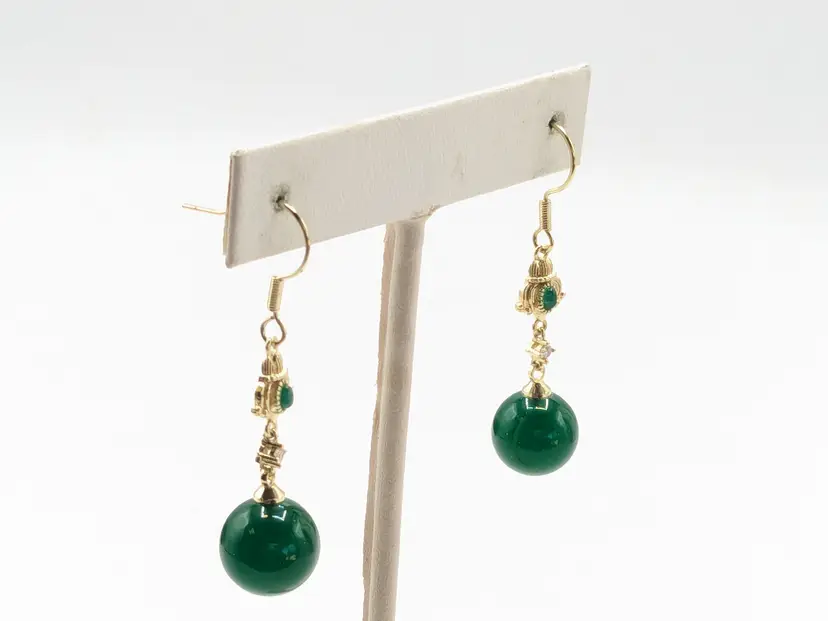 Beautiful! Good condition. No color loss. Green glass is 10mm. Earrings measure 1 3/4" in length. EN2