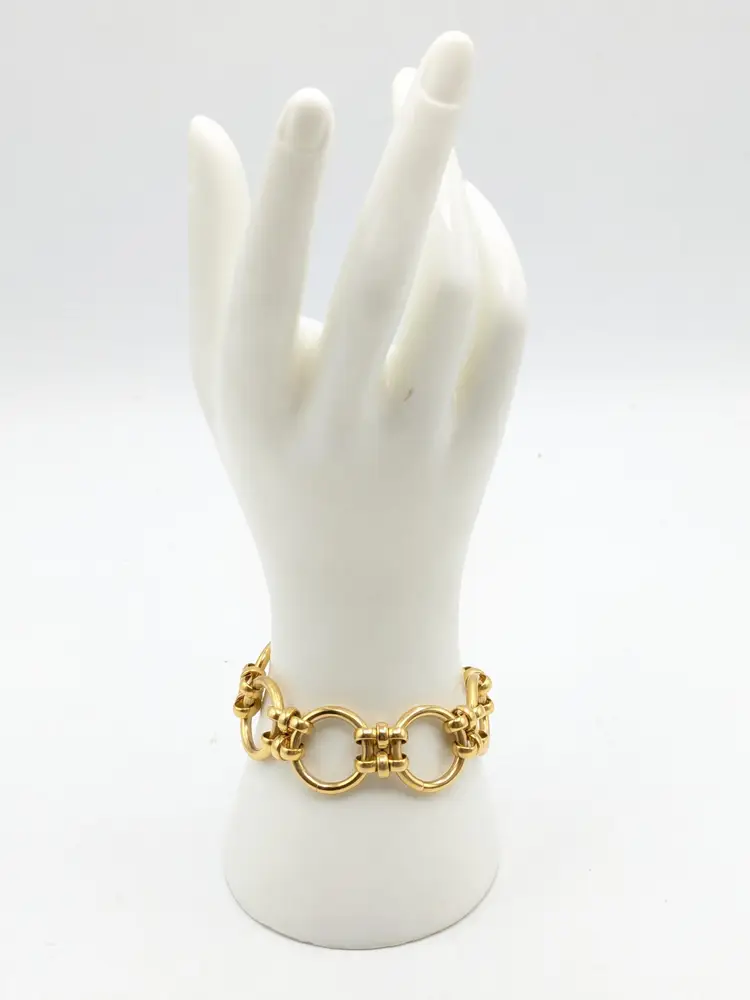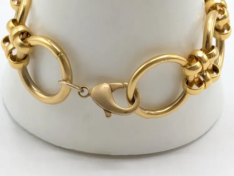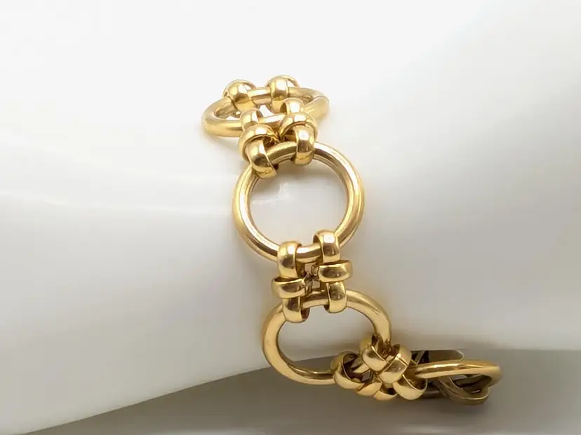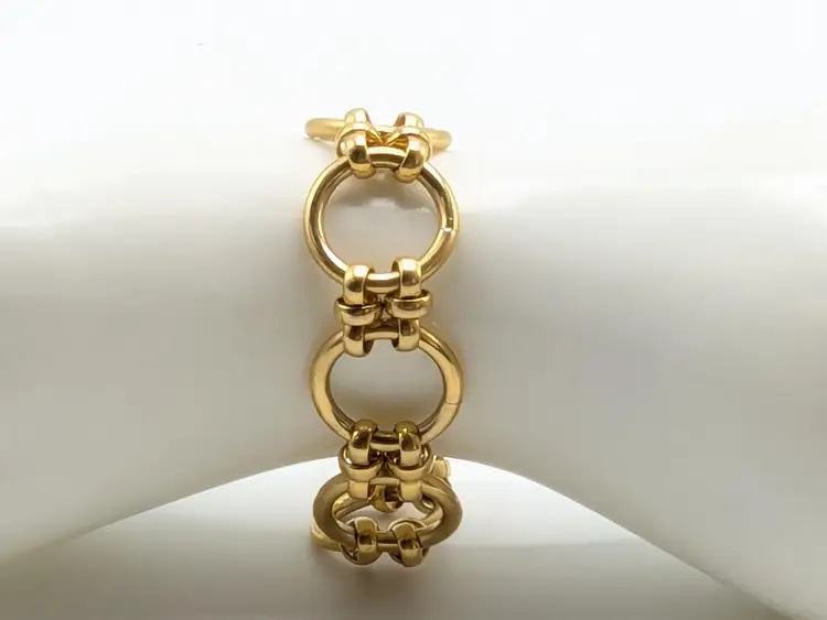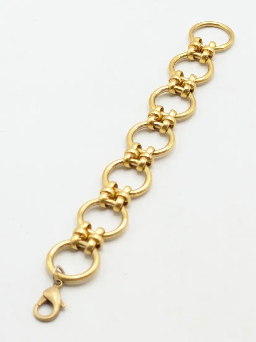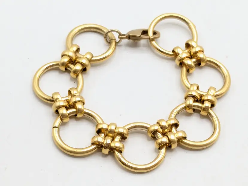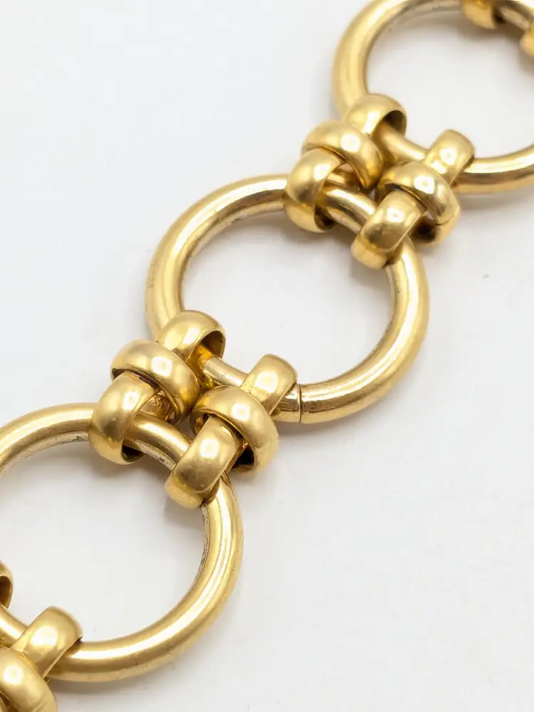 Good condition. Features a unique circular link design with a gold tone finish. Measures 7" in length. (EN1)