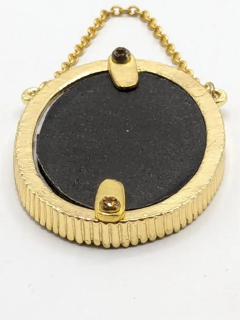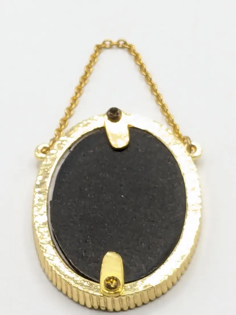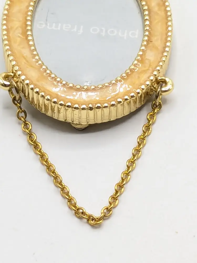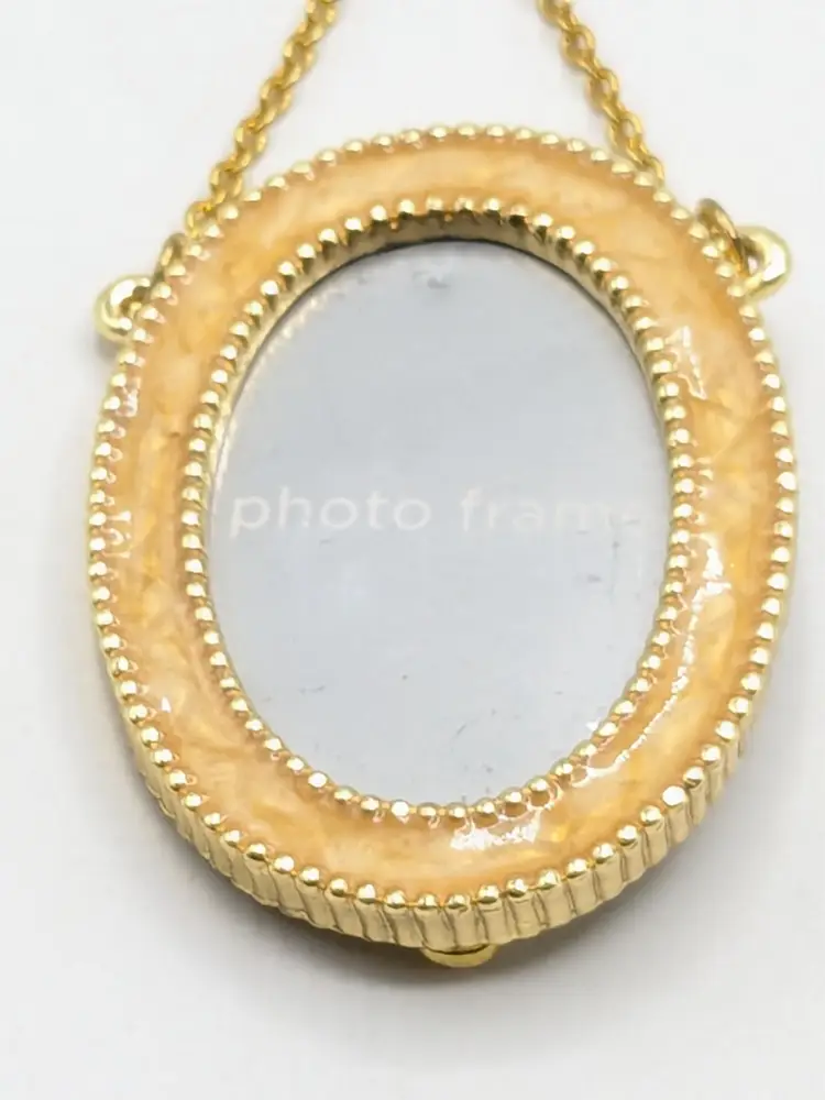 Good condition. Charming gold tone oval photo frame pendant. Features a delicate chain for hanging. Perfect for displaying a small cherished photo. Overall frame measures 1 3/4" in height and 1 3/8" in width. (EN1)