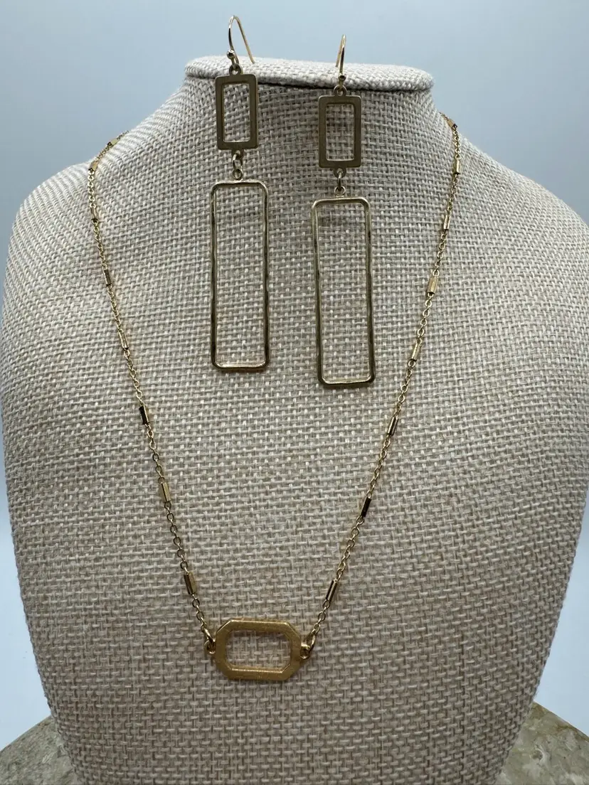 This is a beautiful gold tone necklace with matching earrings. Excellent like new condition. Necklace measures 16” w/ a 3” extender Earrings measure 3” X 1/2”