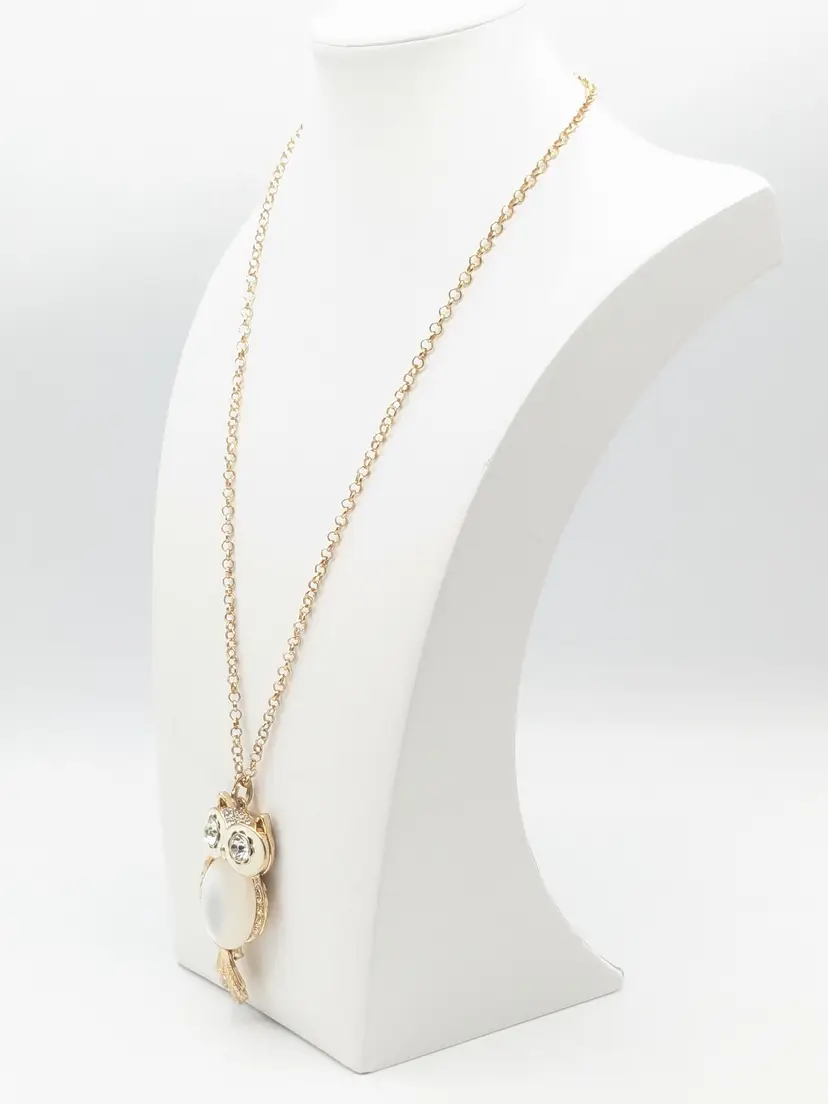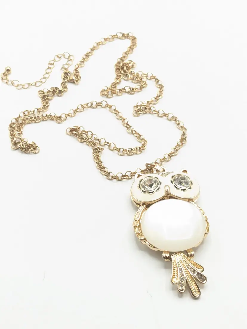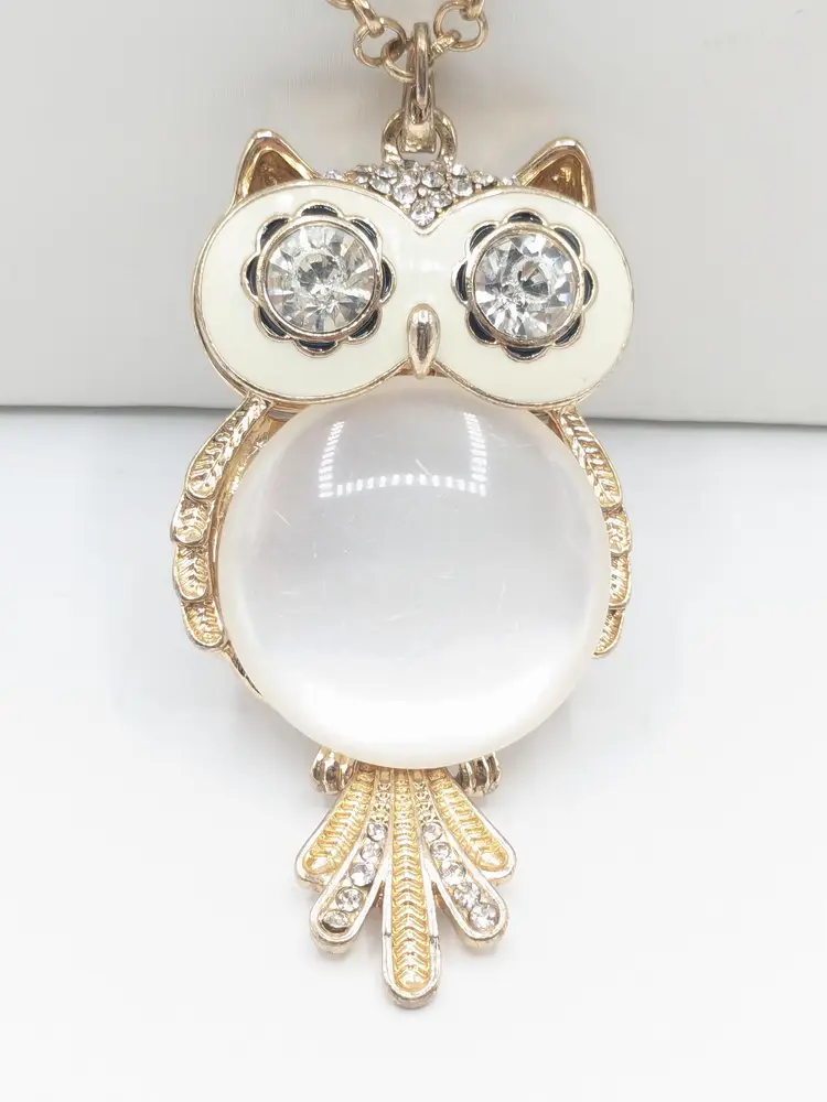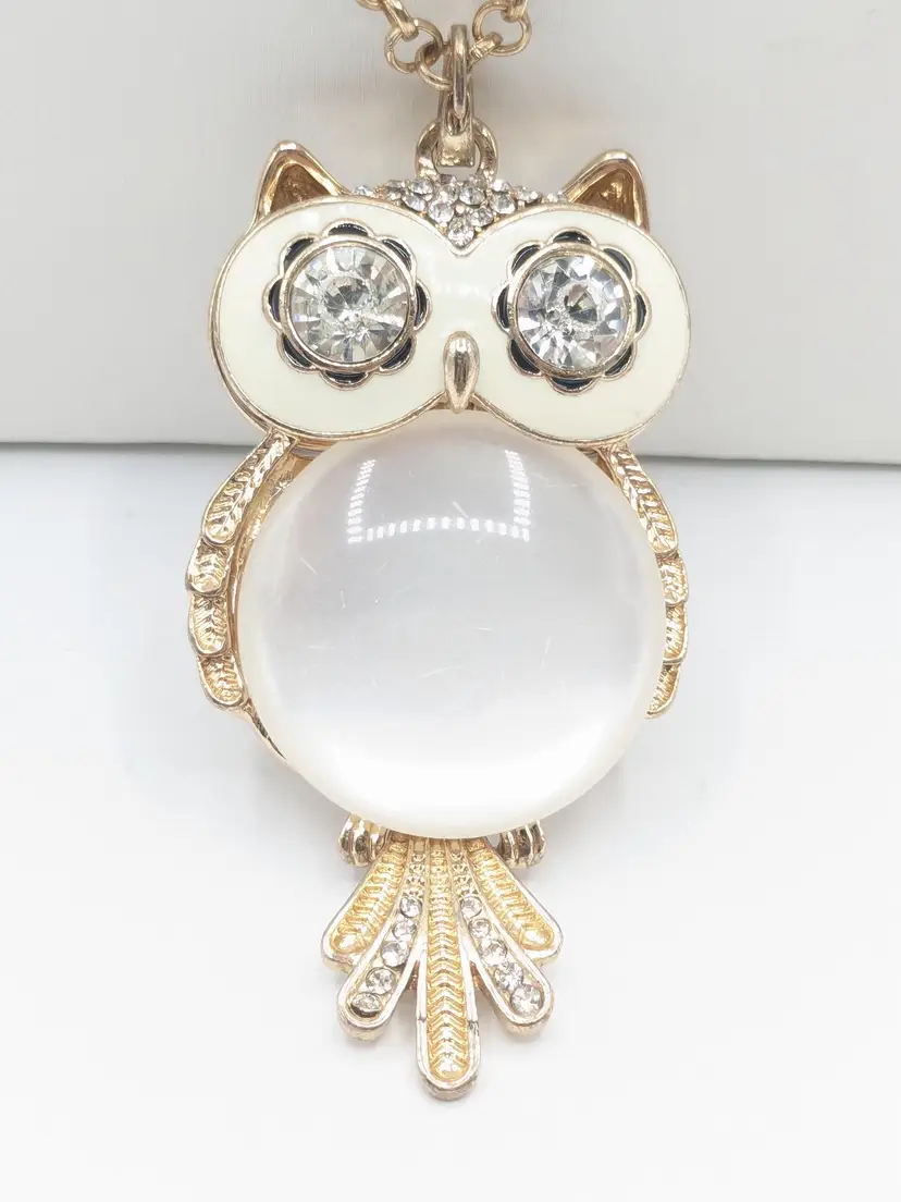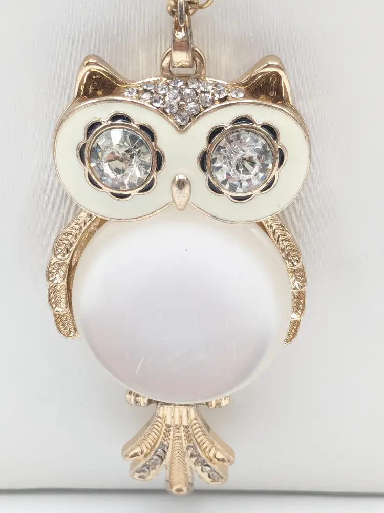 Good condition. Light scratches on acrylic white belly. Tail is articulated/moves. Owl measures 3" and chain is28" with a 3" extender.